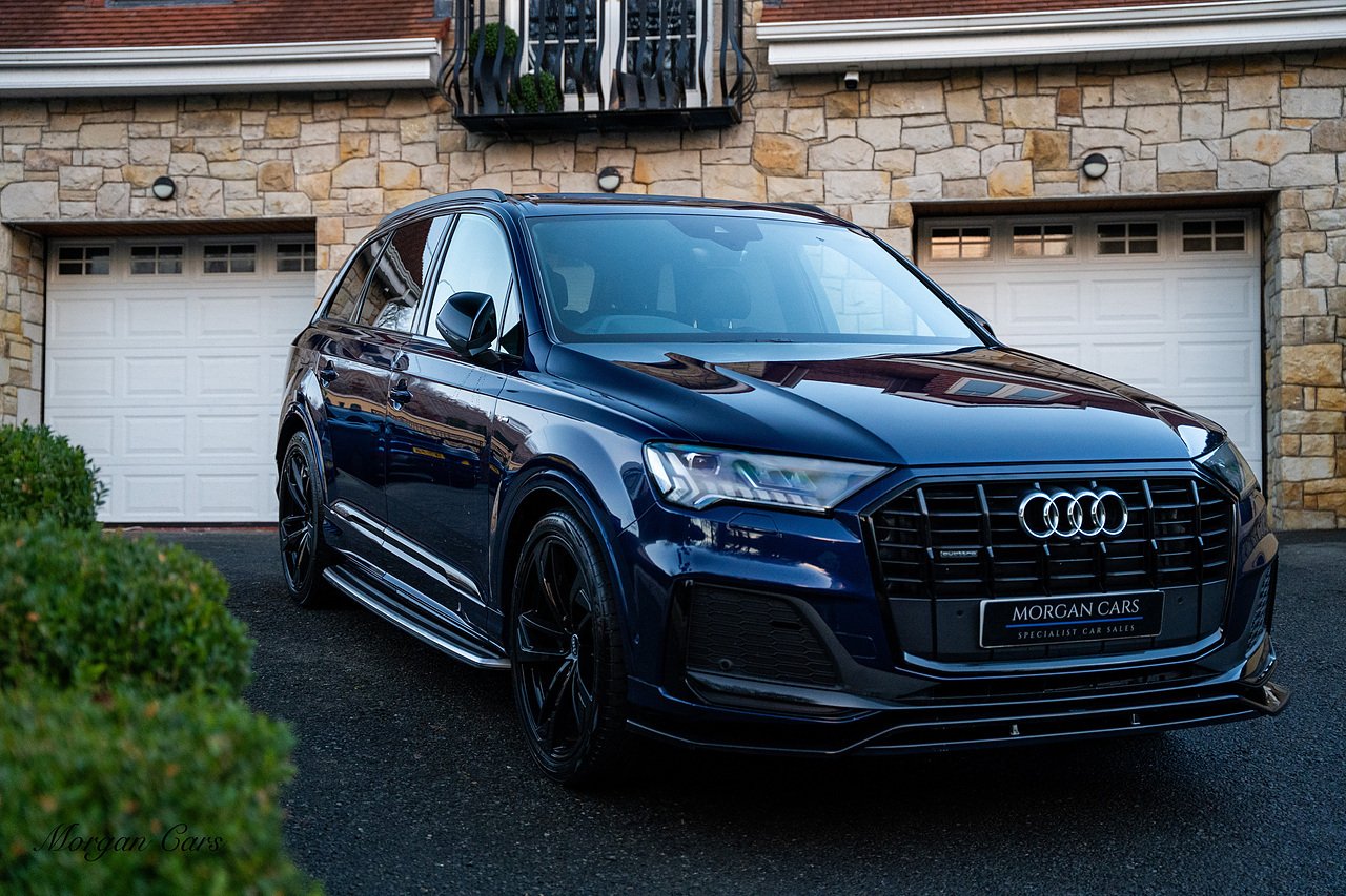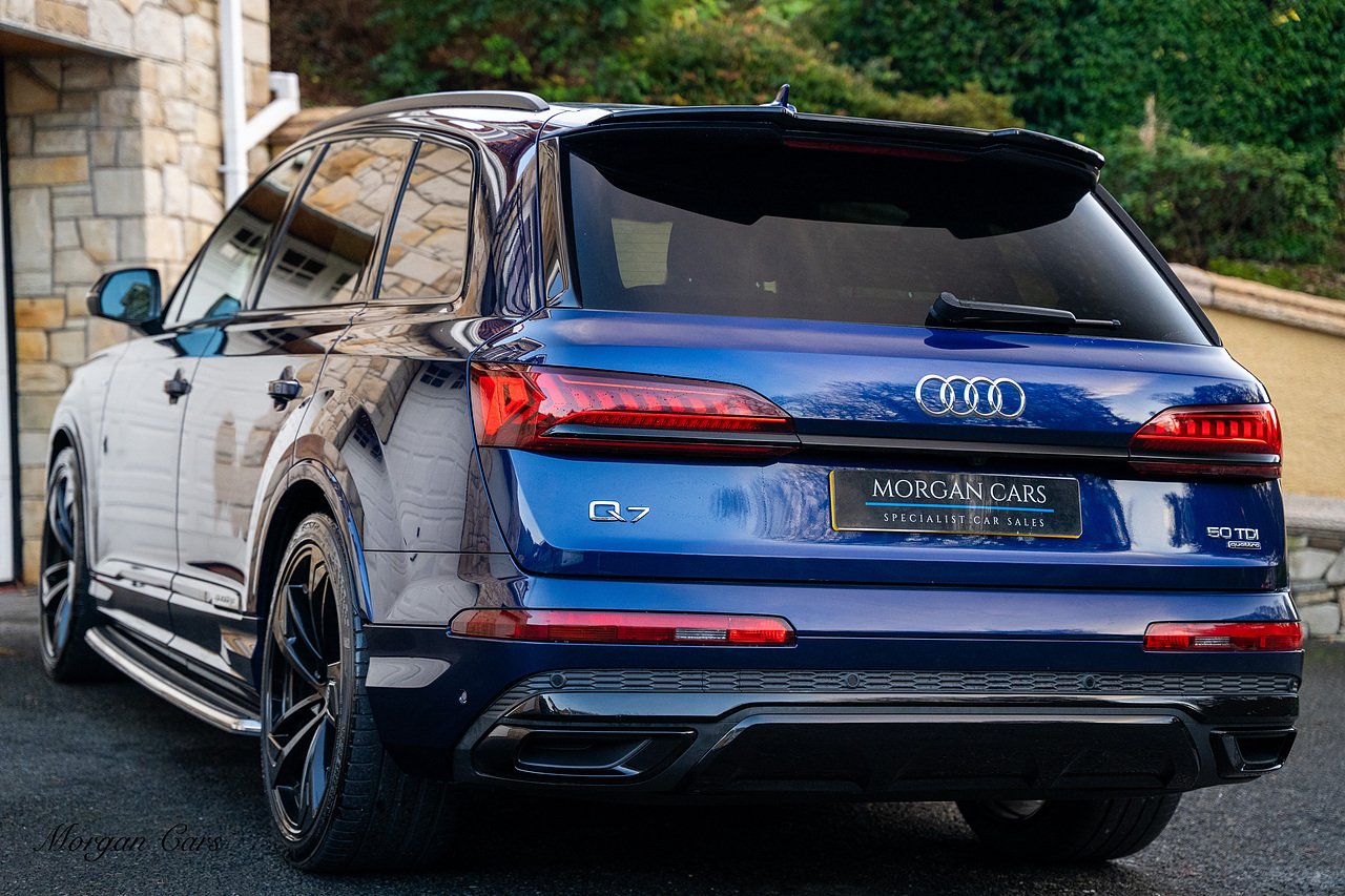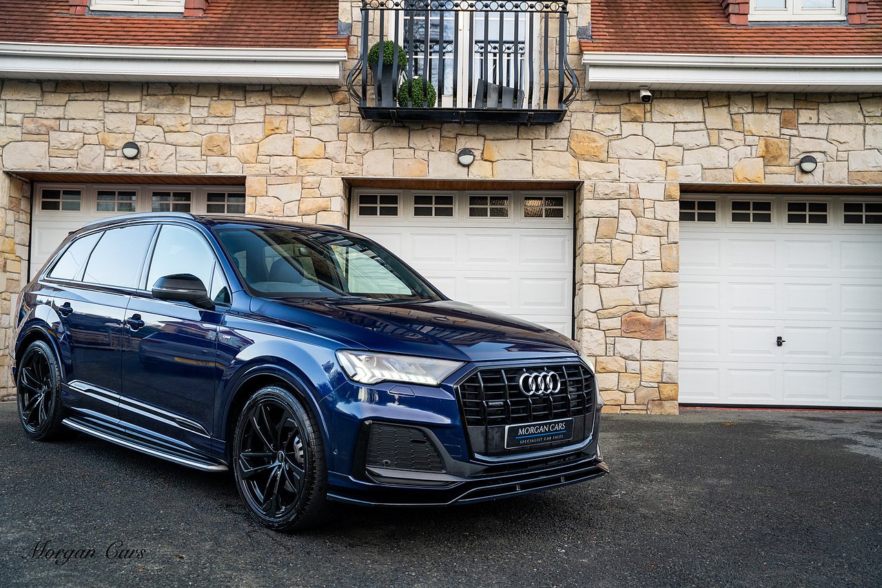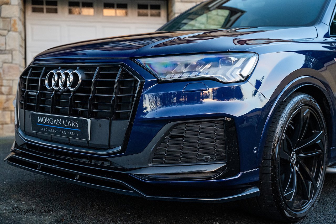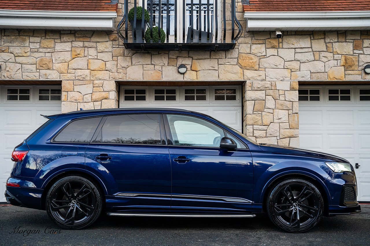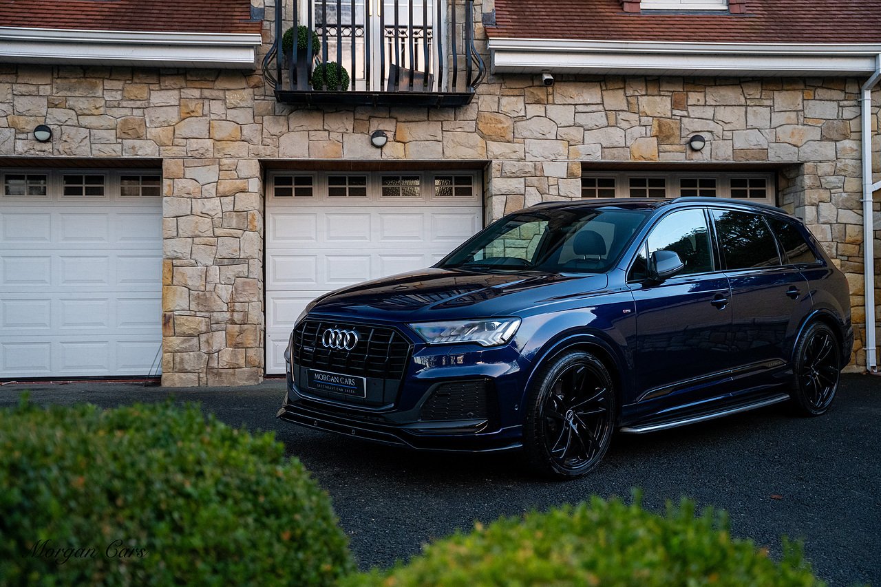 Morgan Cars are proud to present this Beautiful Audi Q7 Black Edition 50 TDI finished in Navarra Blue metallic with full Black Valcona Leather interior, This Audi Q7 Black edition features the Four Zone Automatic climate control, Heated front seats, 21" Black Edition alloy wheels in Gloss Black, Privacy Glass, Full Black exterior styling package, Adaptive Height adjustable suspension system, LED Matrix Headlights, Fixed Side steps, Flat bottom S Line steering wheel, Maxton Design Lower Front Splitter and Rear Boot Spoiler.