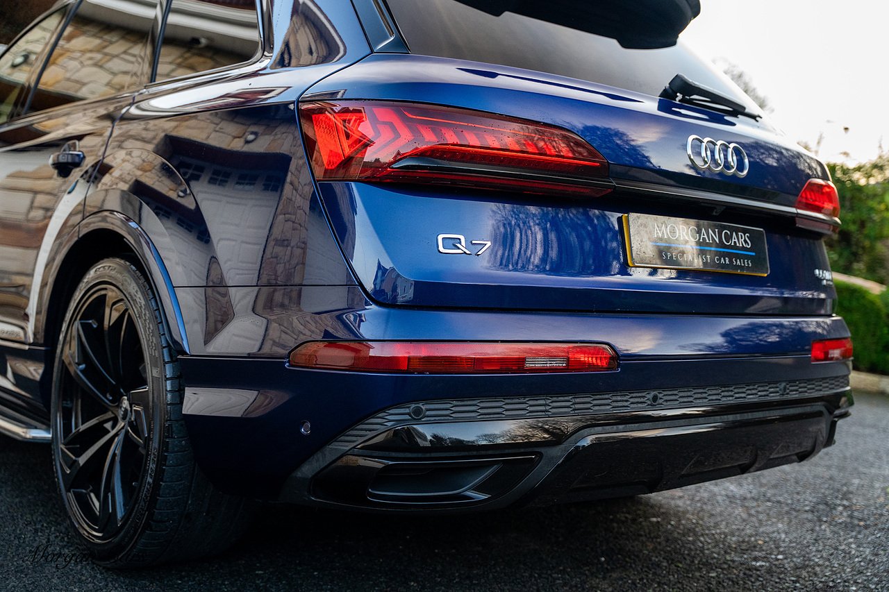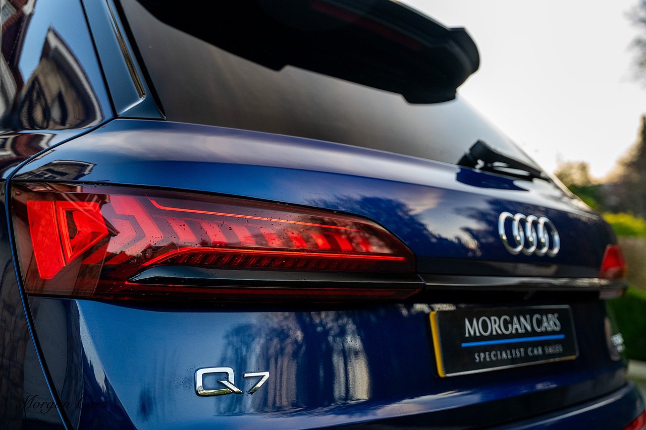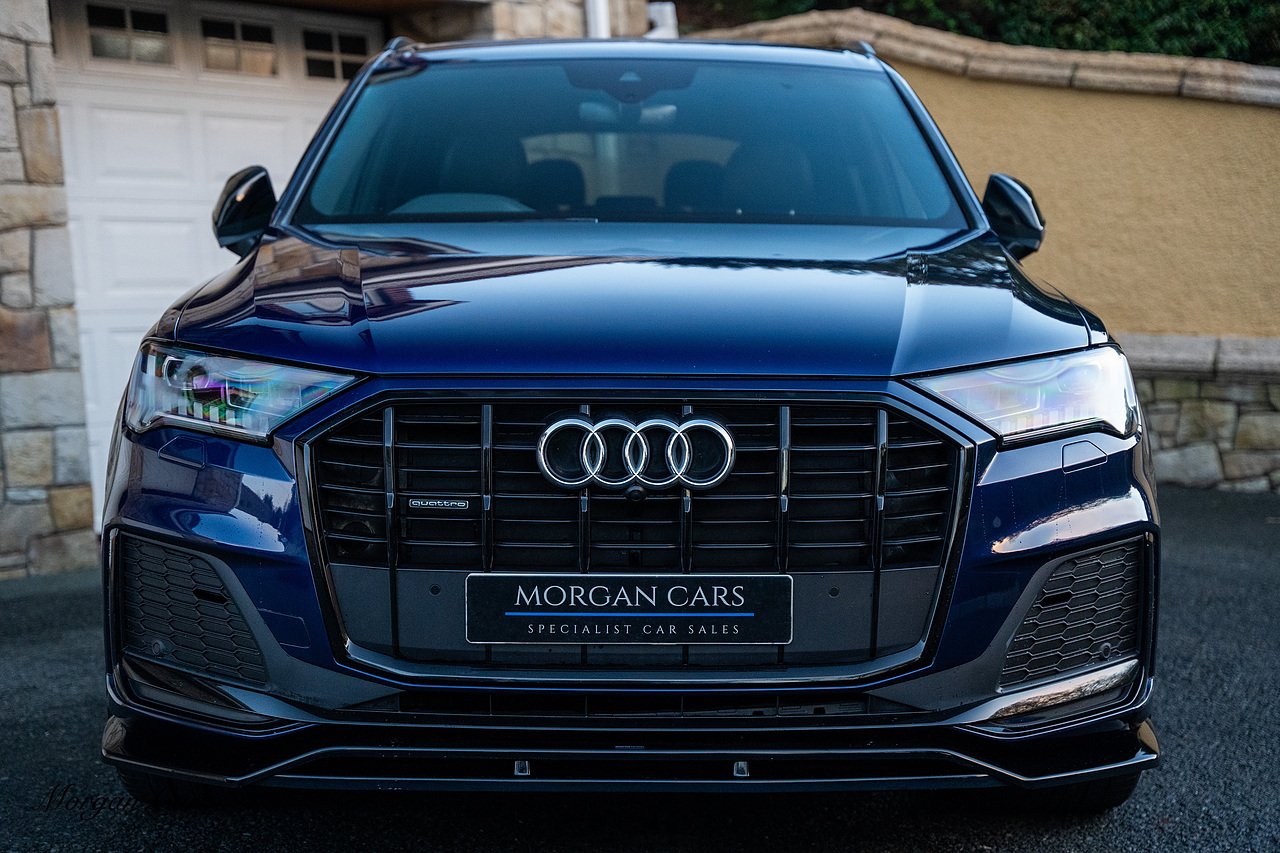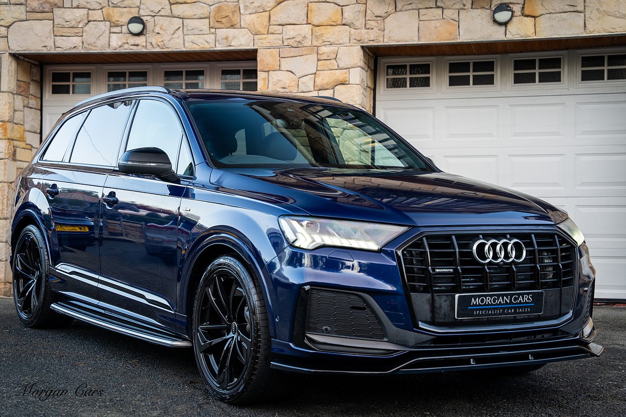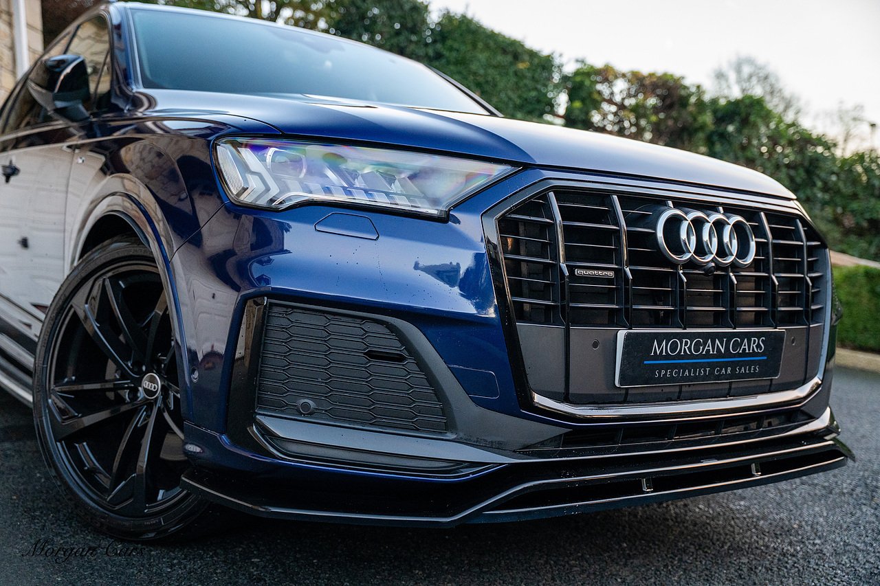 Morgan Cars are proud to present this Beautiful Audi Q7 Black Edition 50 TDI finished in Navarra Blue metallic with full Black Valcona Leather interior, This Audi Q7 Black edition features the Four Zone Automatic climate control, Heated front seats, 21" Black Edition alloy wheels in Gloss Black, Privacy Glass, Full Black exterior styling package, Adaptive Height adjustable suspension system, LED Matrix Headlights, Fixed Side steps, Flat bottom S Line steering wheel, Maxton Design Lower Front Splitter and Rear Boot Spoiler.