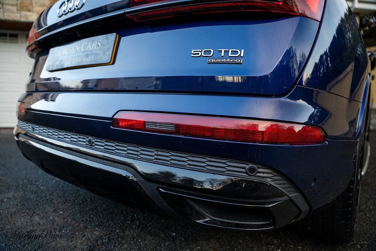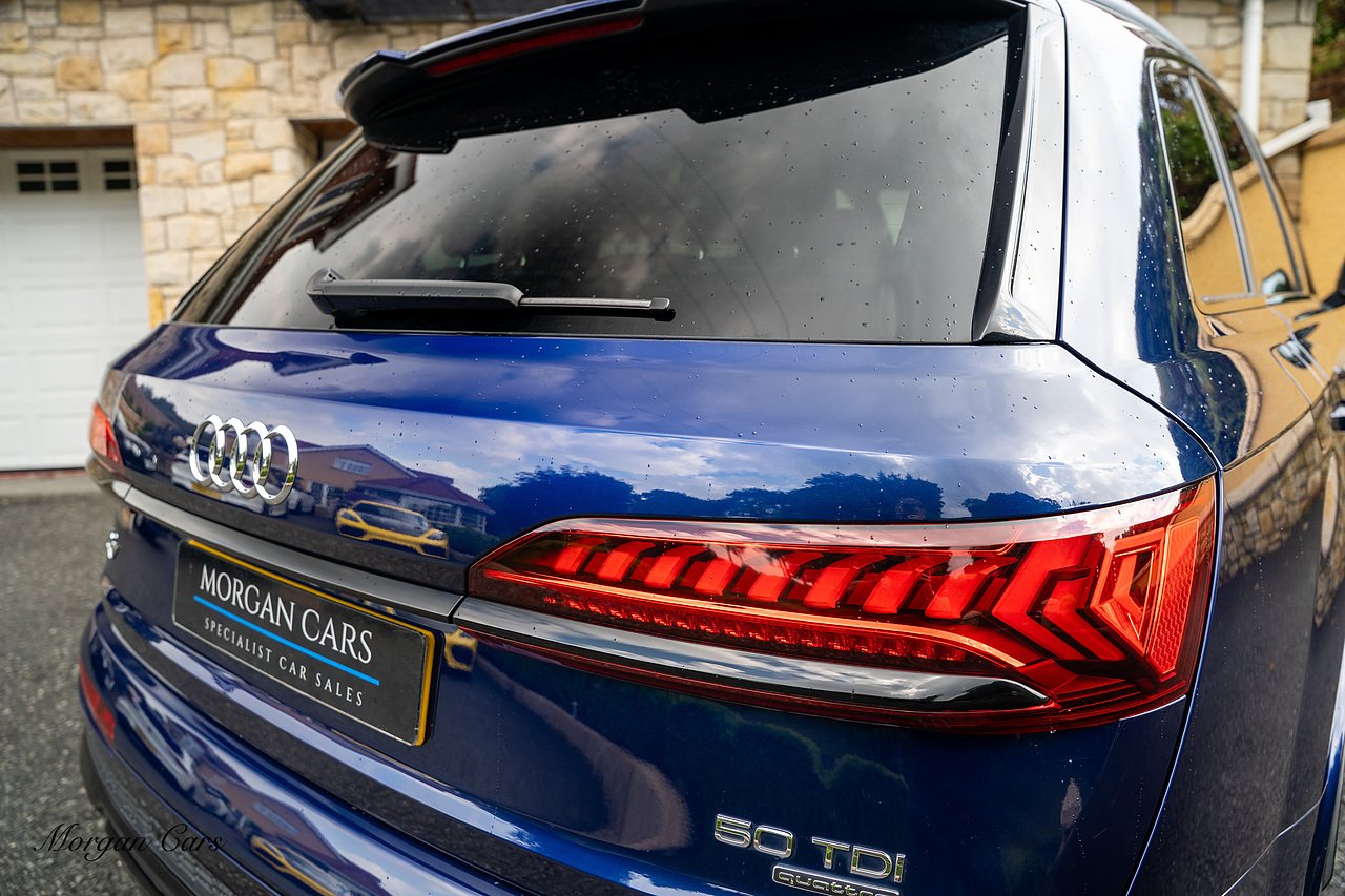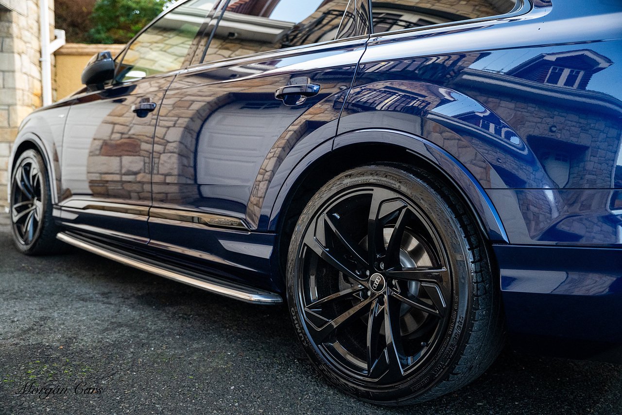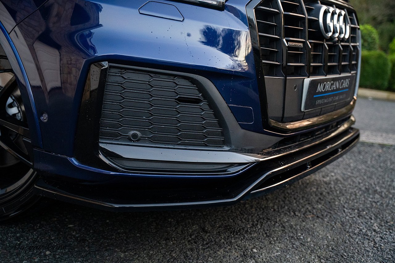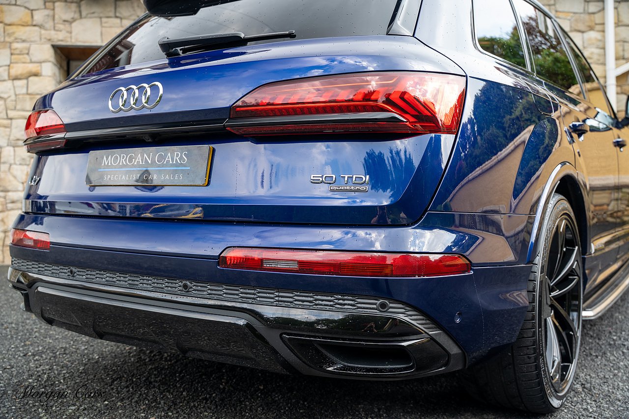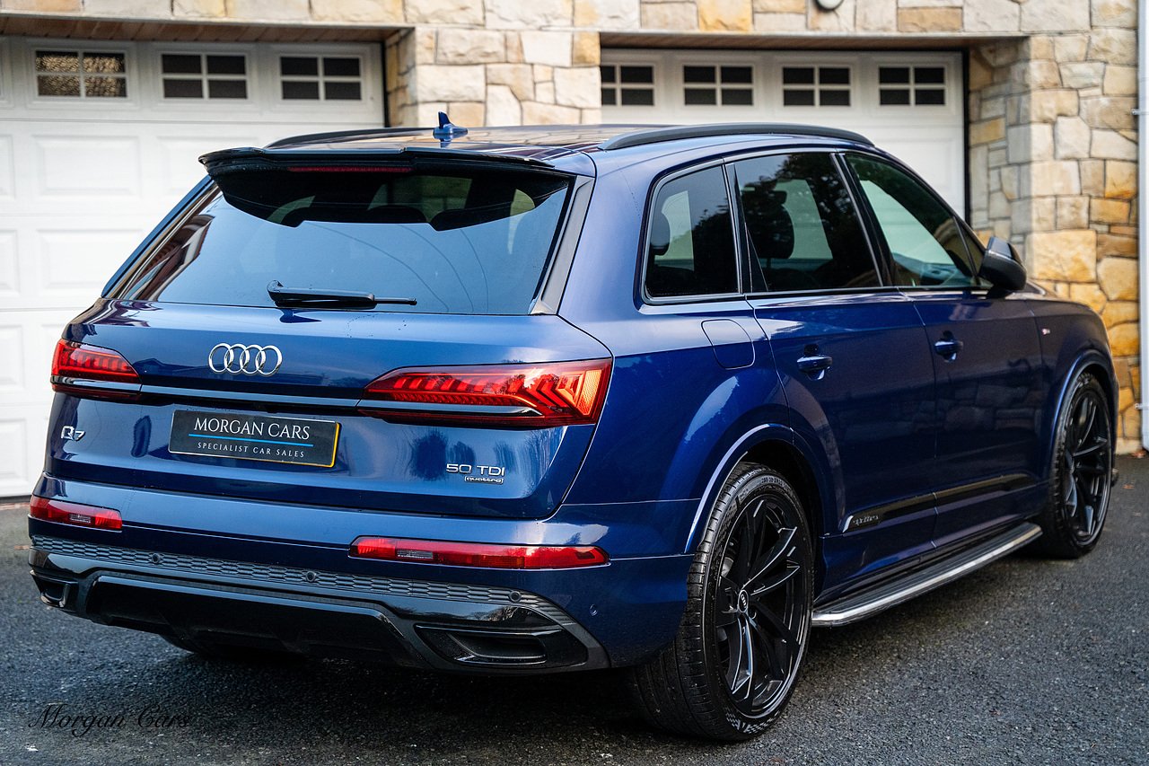 Morgan Cars are proud to present this Beautiful Audi Q7 Black Edition 50 TDI finished in Navarra Blue metallic with full Black Valcona Leather interior, This Audi Q7 Black edition features the Four Zone Automatic climate control, Heated front seats, 21" Black Edition alloy wheels in Gloss Black, Privacy Glass, Full Black exterior styling package, Adaptive Height adjustable suspension system, LED Matrix Headlights, Fixed Side steps, Flat bottom S Line steering wheel, Maxton Design Lower Front Splitter and Rear Boot Spoiler.