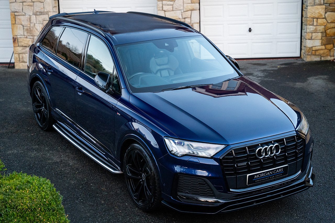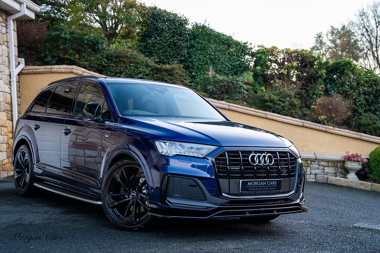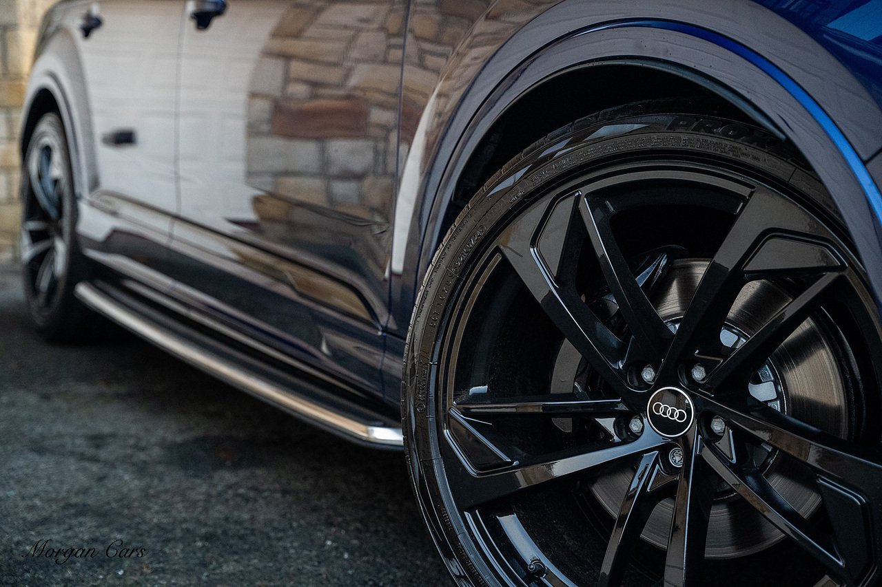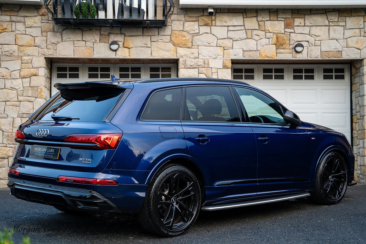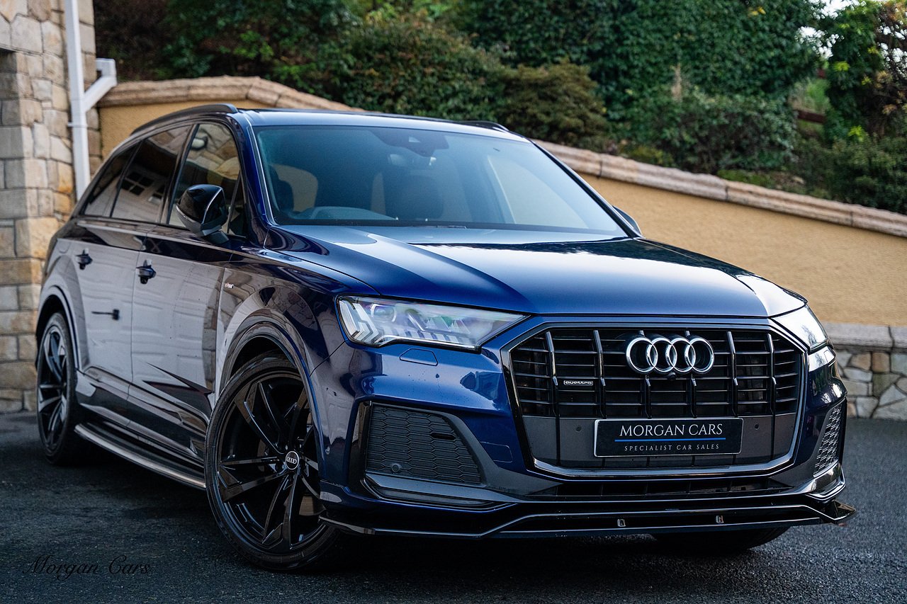 Morgan Cars are proud to present this Beautiful Audi Q7 Black Edition 50 TDI finished in Navarra Blue metallic with full Black Valcona Leather interior, This Audi Q7 Black edition features the Four Zone Automatic climate control, Heated front seats, 21" Black Edition alloy wheels in Gloss Black, Privacy Glass, Full Black exterior styling package, Adaptive Height adjustable suspension system, LED Matrix Headlights, Fixed Side steps, Flat bottom S Line steering wheel, Maxton Design Lower Front Splitter and Rear Boot Spoiler.