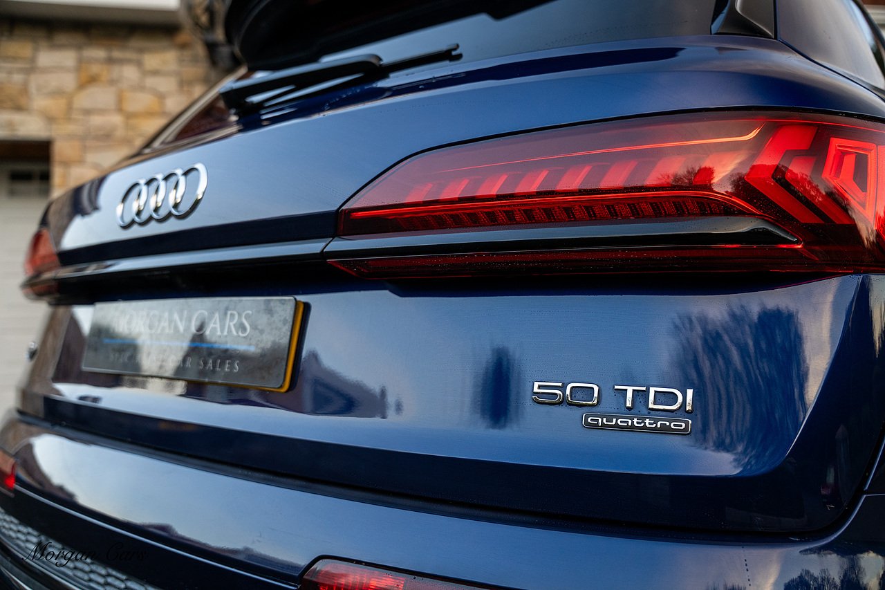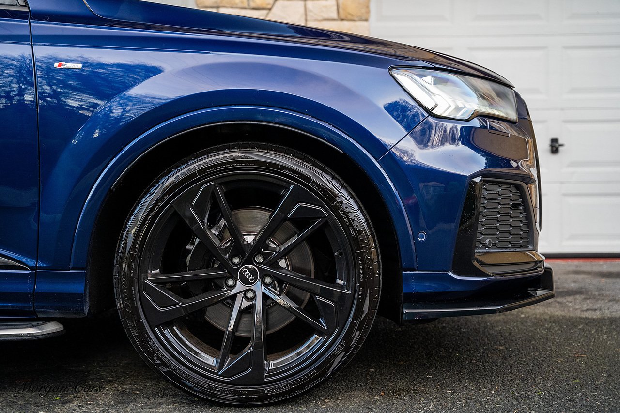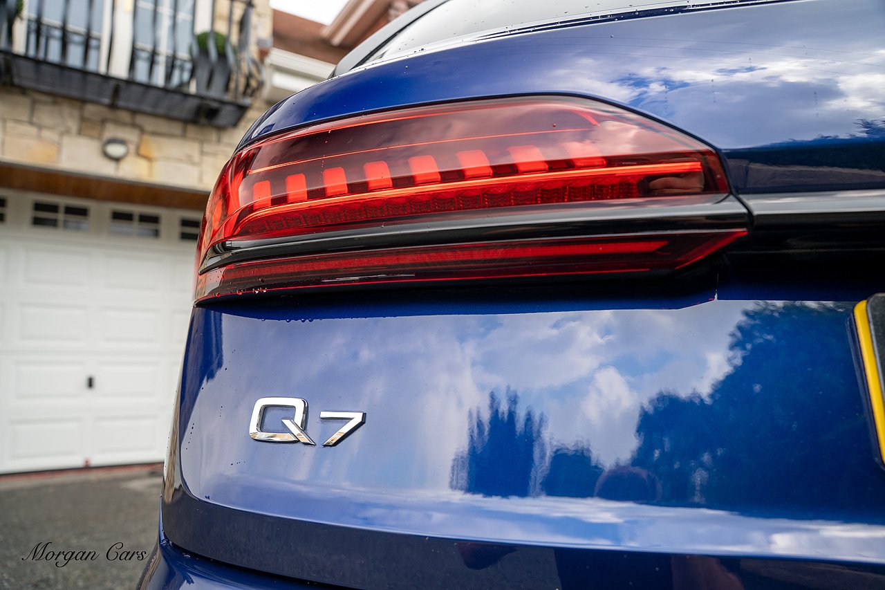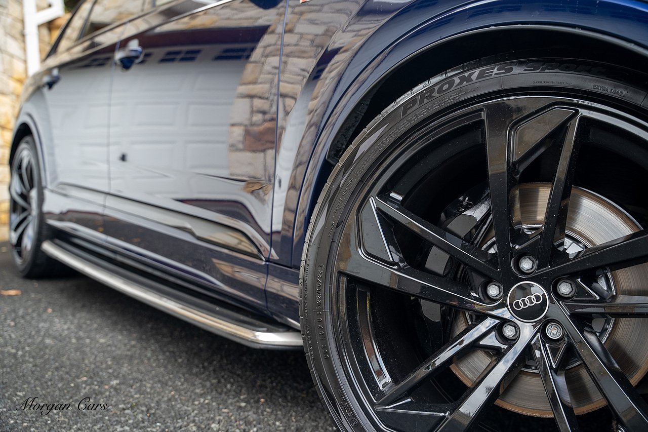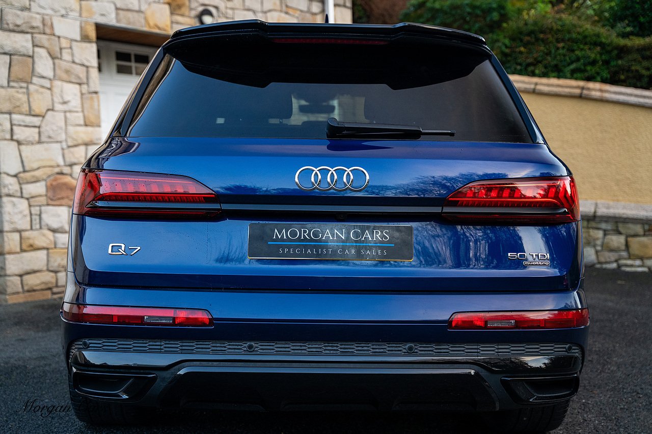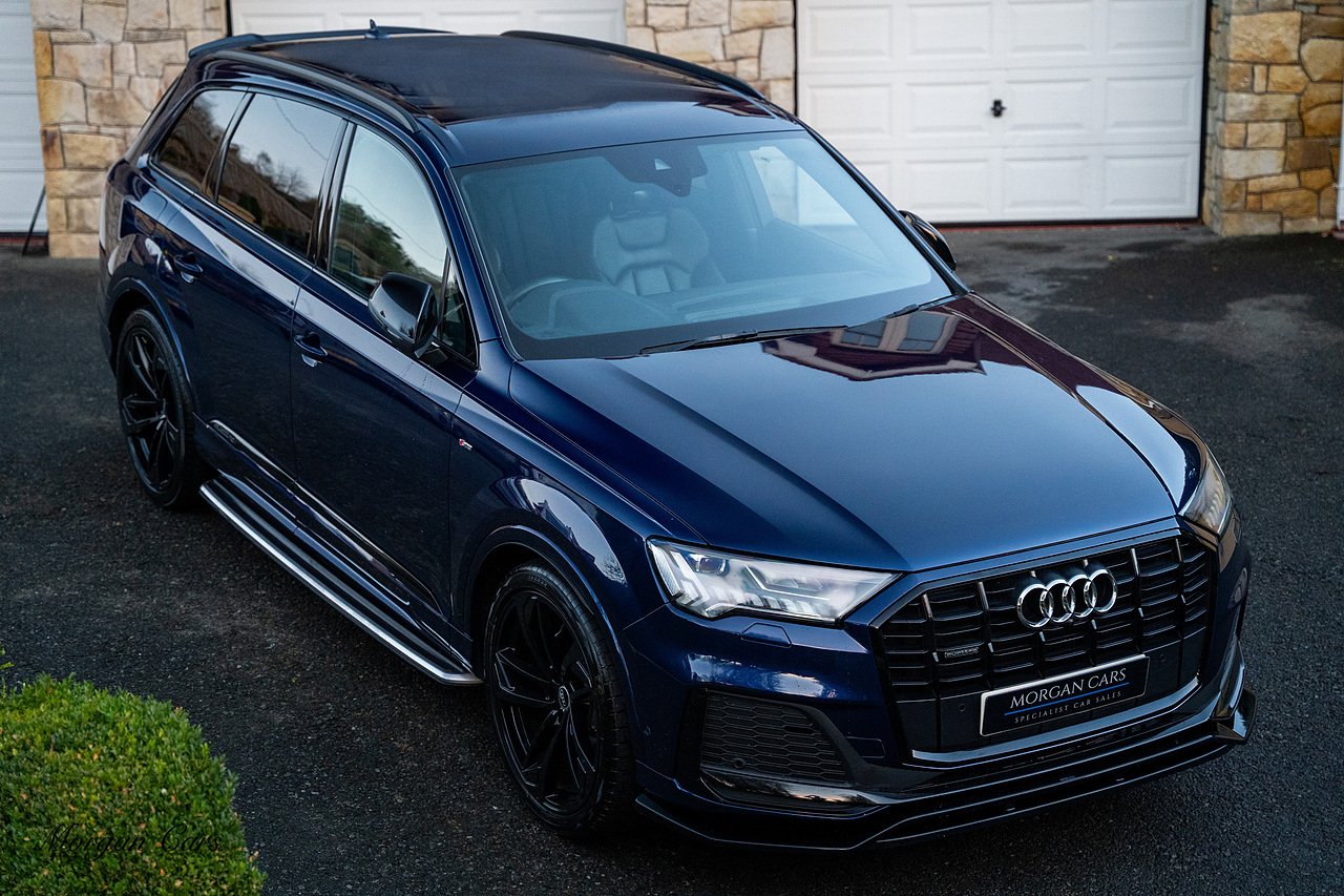Morgan Cars are proud to present this Beautiful Audi Q7 Black Edition 50 TDI finished in Navarra Blue metallic with full Black Valcona Leather interior, This Audi Q7 Black edition features the Four Zone Automatic climate control, Heated front seats, 21" Black Edition alloy wheels in Gloss Black, Privacy Glass, Full Black exterior styling package, Adaptive Height adjustable suspension system, LED Matrix Headlights, Fixed Side steps, Flat bottom S Line steering wheel, Maxton Design Lower Front Splitter and Rear Boot Spoiler.