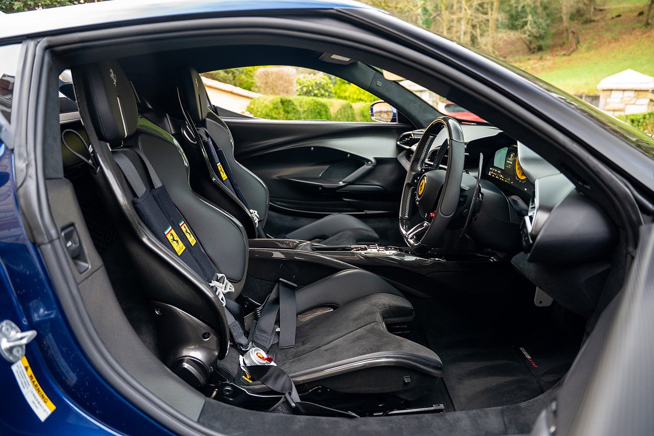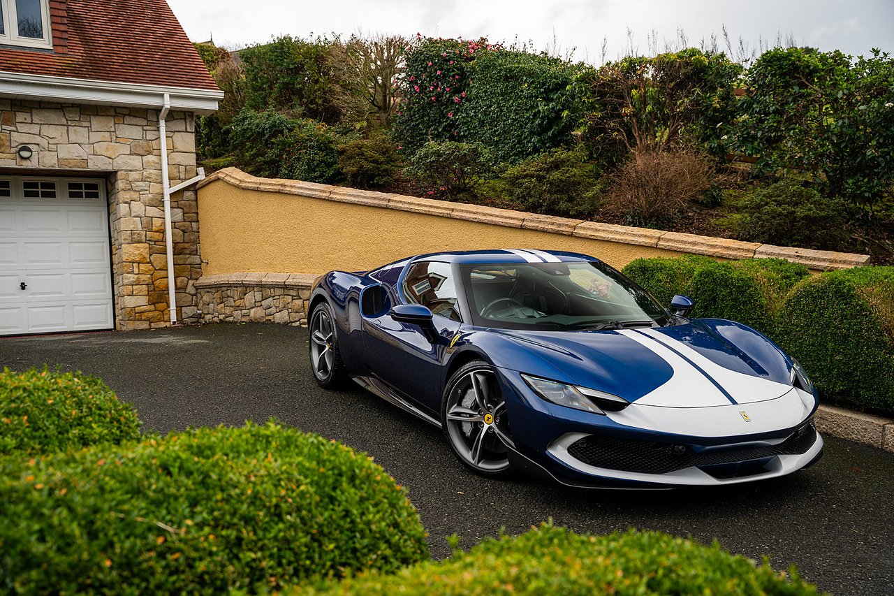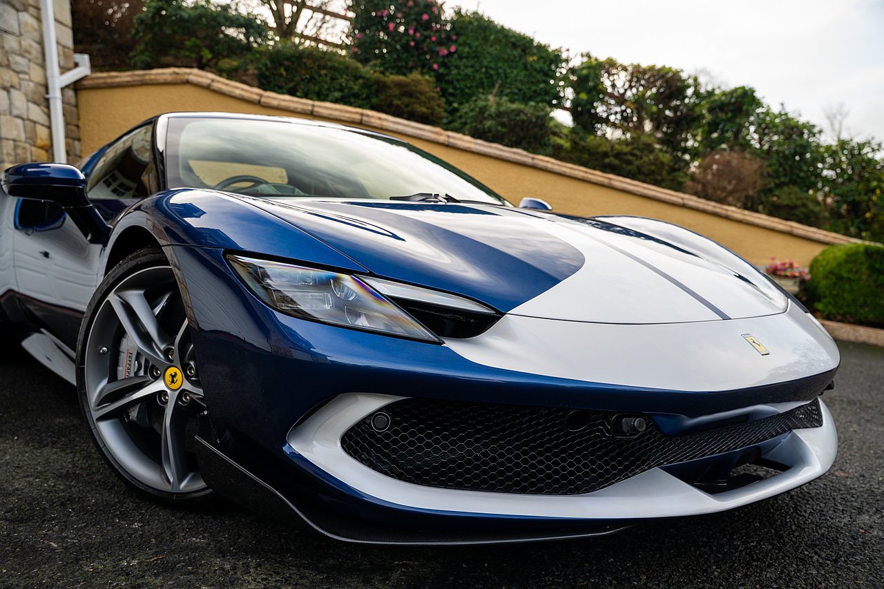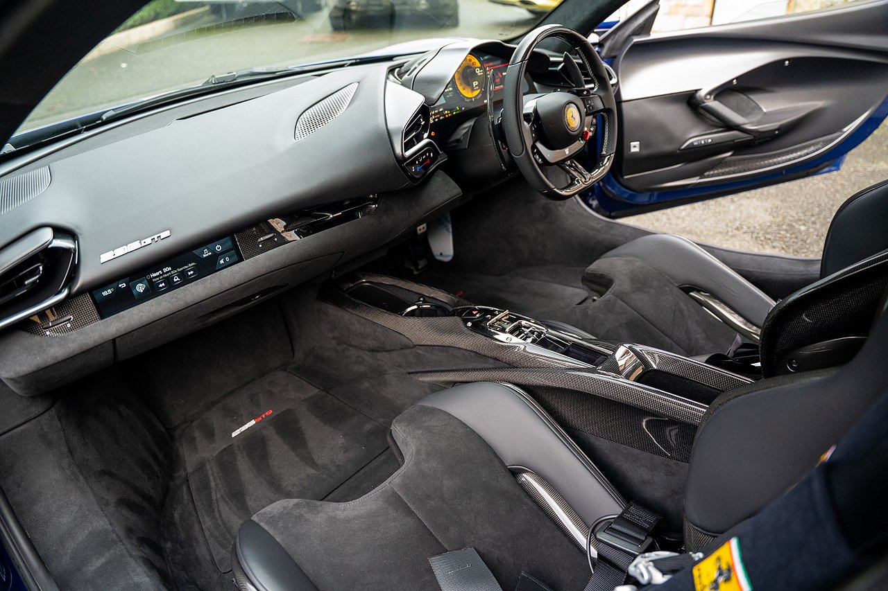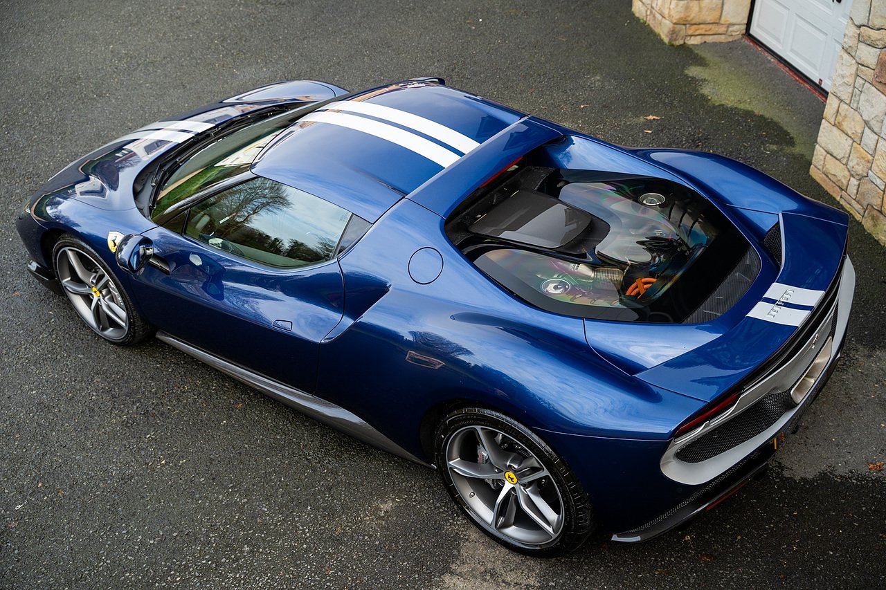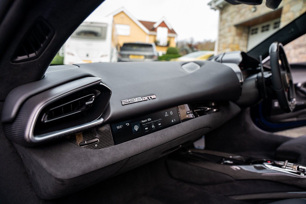 Massive Spec Ferrari 296 GTB listed to £400k in December 2025 and now representing massive savings from new, this 296 is finished in Tour De France Blue metallic with contrasting Argento Nurburgring factory painted stripe and full Body PPF fitted by Topaz detailing, Fitted with the rare and Special Extended Assetto Fiorano Package which includes fixed multimatic dampers, front lip spoiler in carbon fibre, side sills in carbon fibre, carbon fibre engine cover, rear extendable spoiler in carbon fibre, matt carbon fibre inner door panels with carbon fibre sill plate, carbon fibre rear bench and tunnel, Size Large Carbon Fibre Racing seats with Harnesses, Carbon Fibre driving zone with led's, Heads Up Display, Apple Carplay, JBL Premium hifi system, Racing Seat lifter, Lexan glass and Carbon fibre engine cover, Scuderia Fender Shields, Argento Painted brake Calipers.