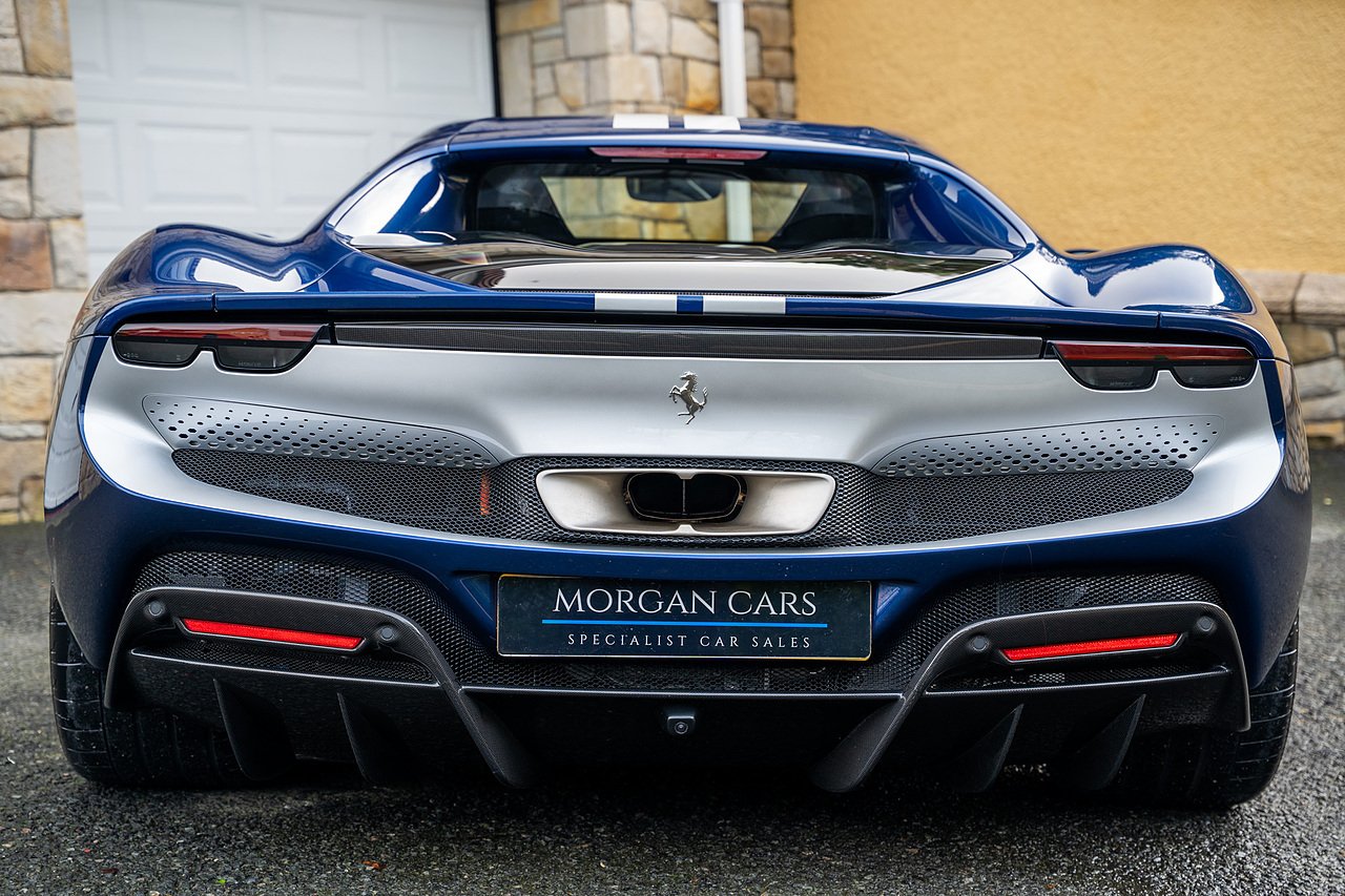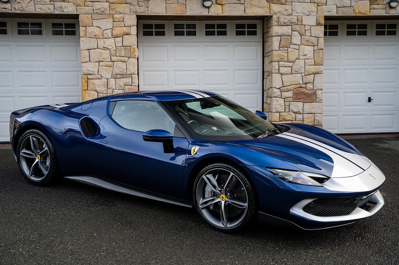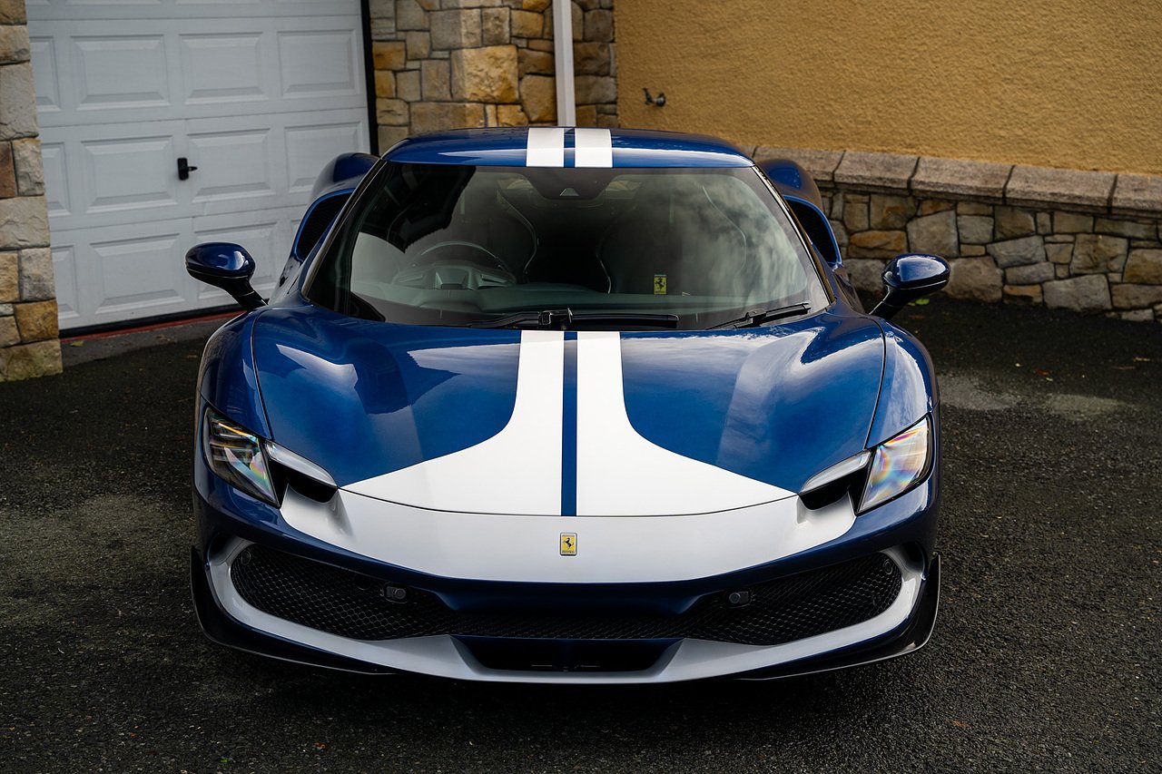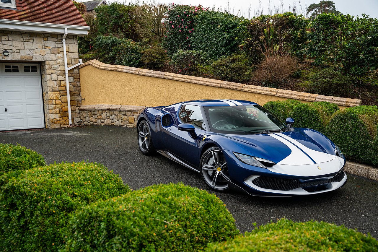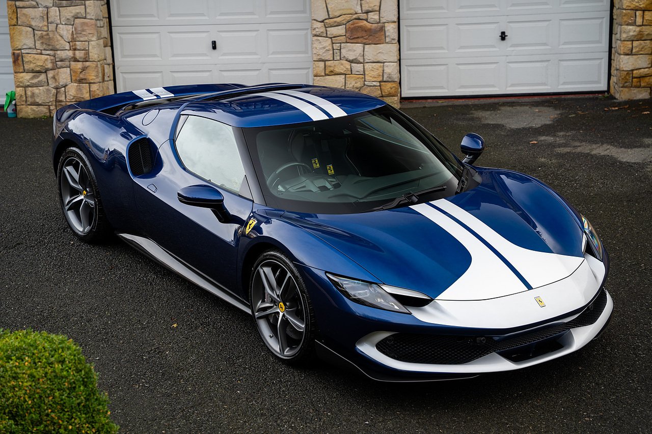 Massive Spec Ferrari 296 GTB listed to £400k in December 2025 and now representing massive savings from new, this 296 is finished in Tour De France Blue metallic with contrasting Argento Nurburgring factory painted stripe and full Body PPF fitted by Topaz detailing, Fitted with the rare and Special Extended Assetto Fiorano Package which includes fixed multimatic dampers, front lip spoiler in carbon fibre, side sills in carbon fibre, carbon fibre engine cover, rear extendable spoiler in carbon fibre, matt carbon fibre inner door panels with carbon fibre sill plate, carbon fibre rear bench and tunnel, Size Large Carbon Fibre Racing seats with Harnesses, Carbon Fibre driving zone with led's, Heads Up Display, Apple Carplay, JBL Premium hifi system, Racing Seat lifter, Lexan glass and Carbon fibre engine cover, Scuderia Fender Shields, Argento Painted brake Calipers.