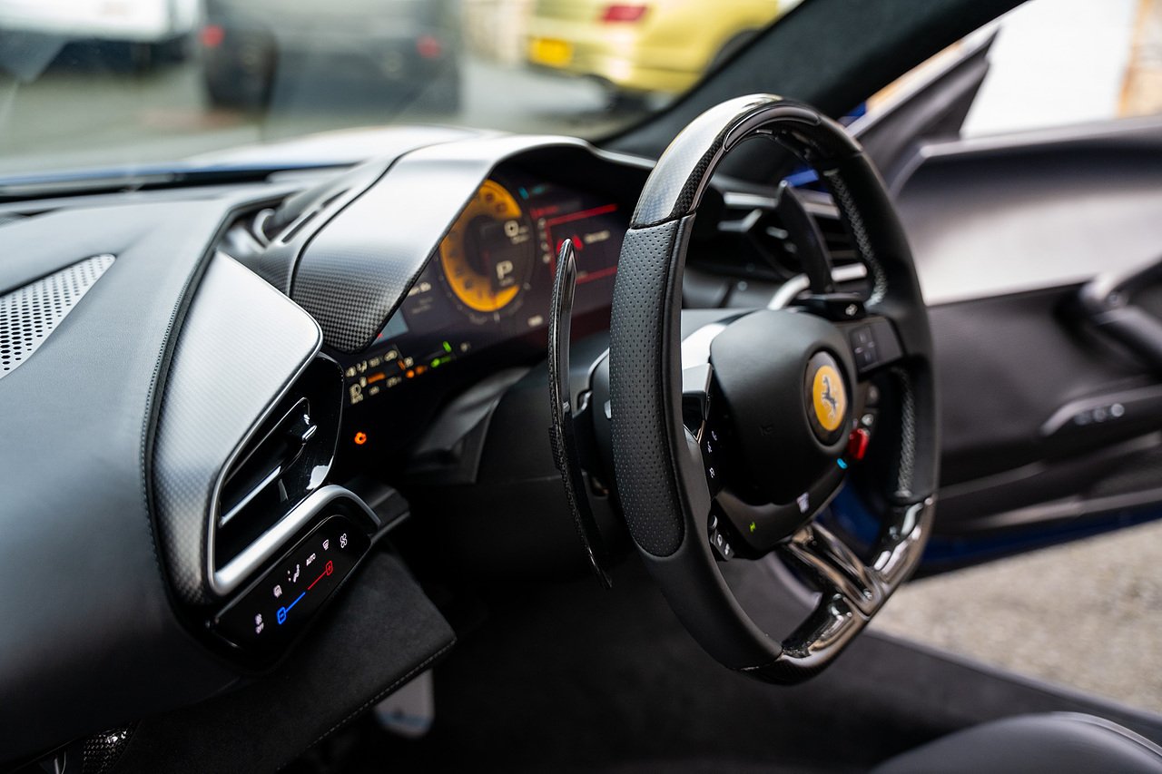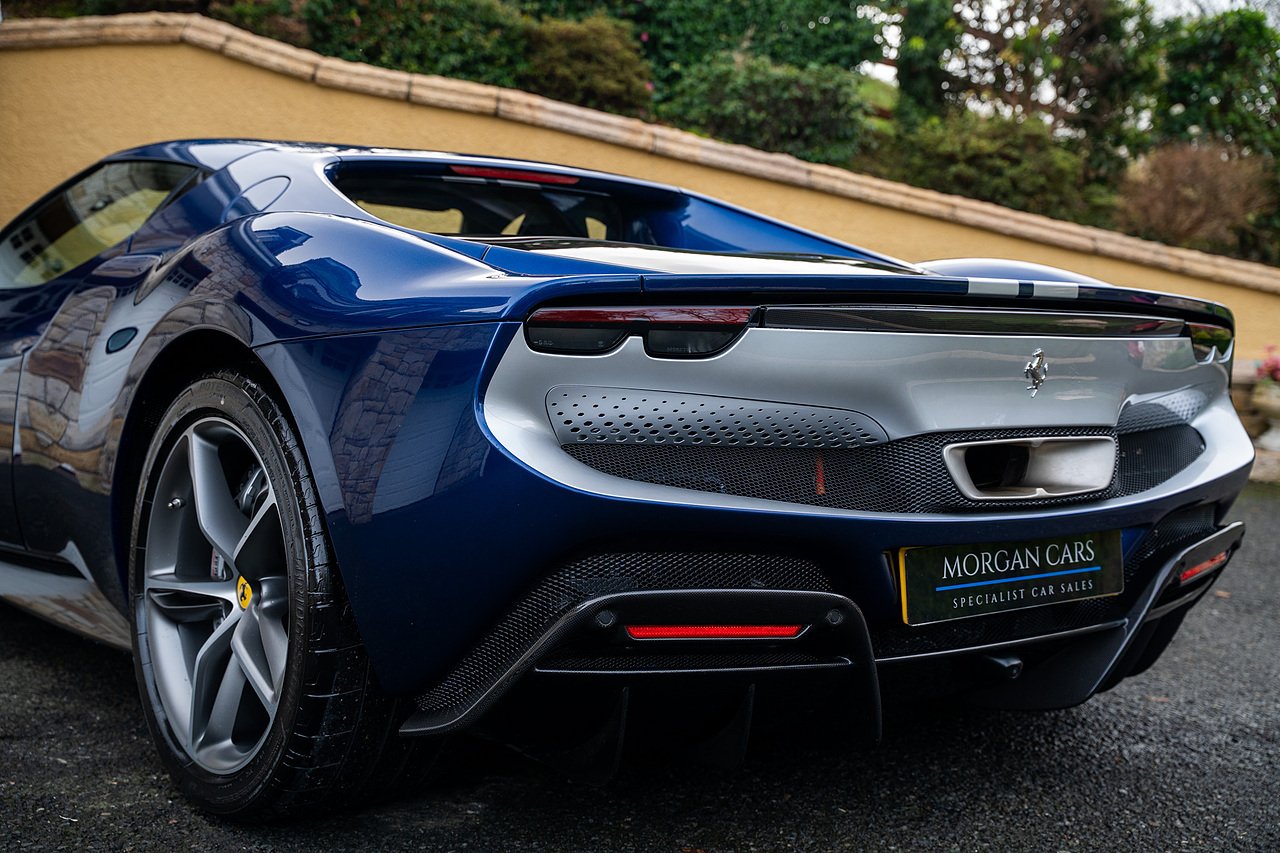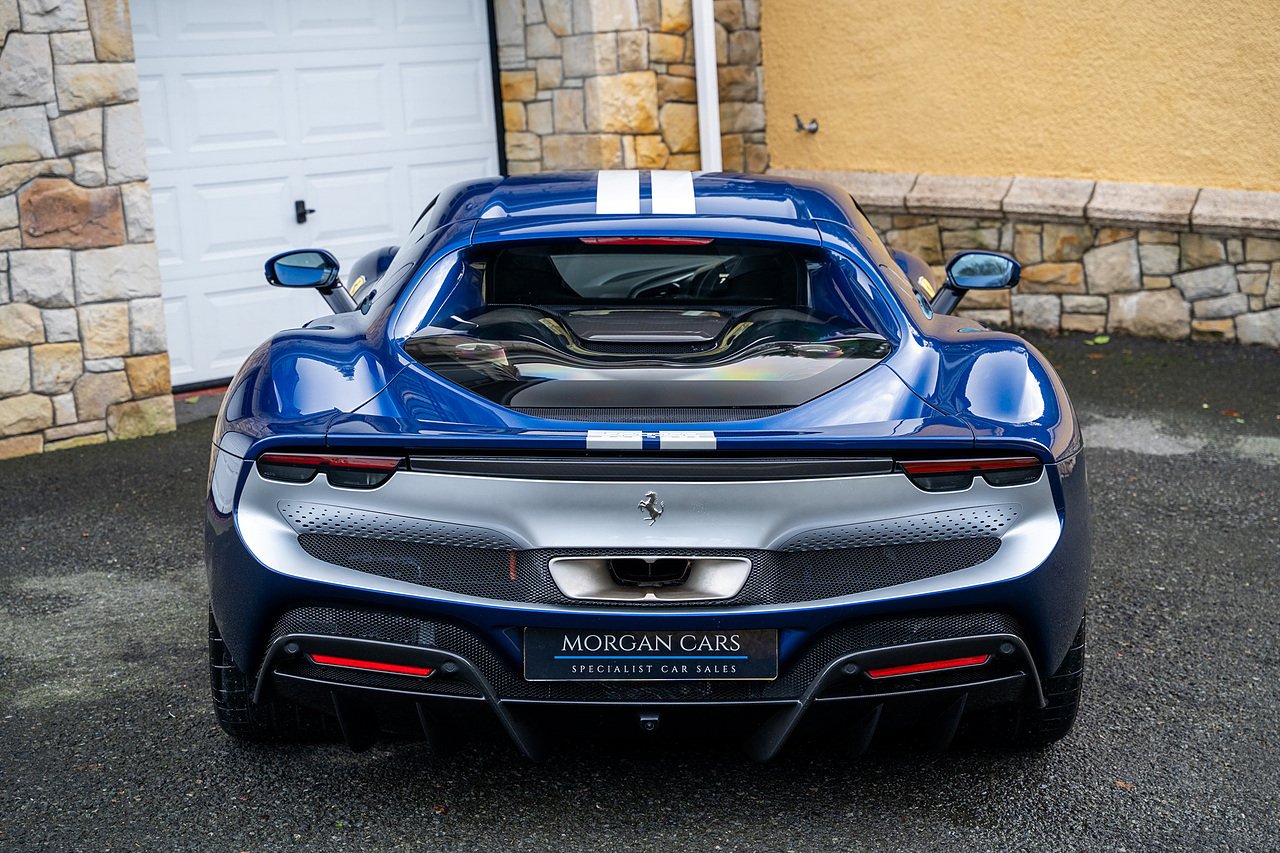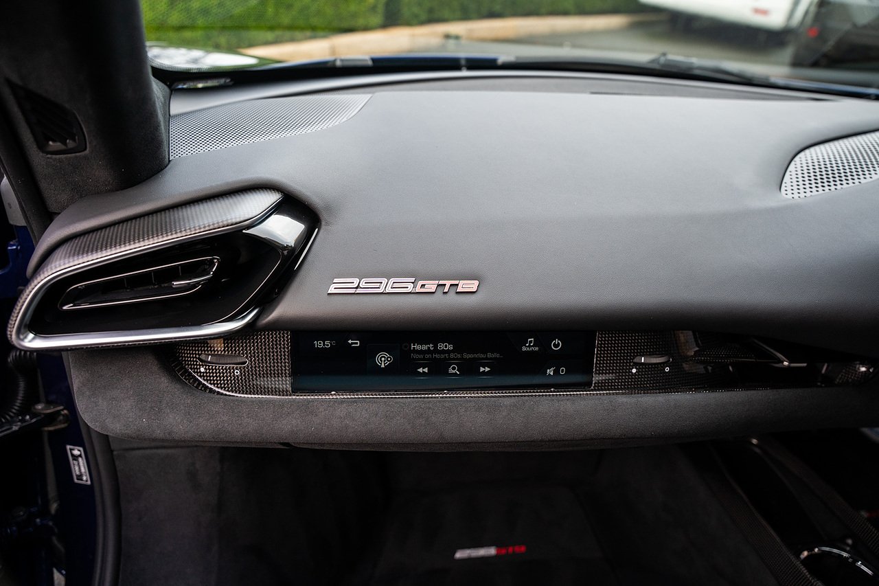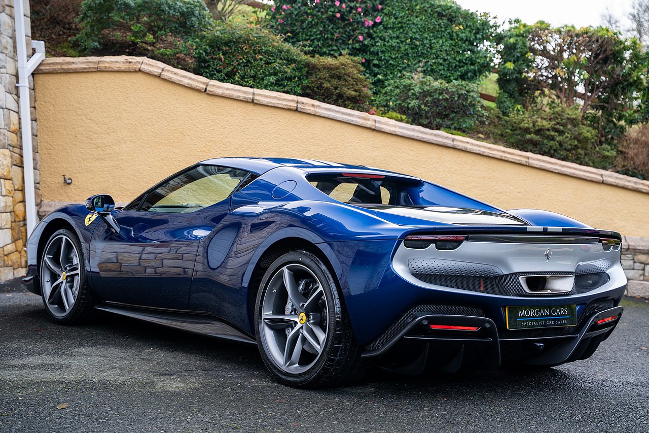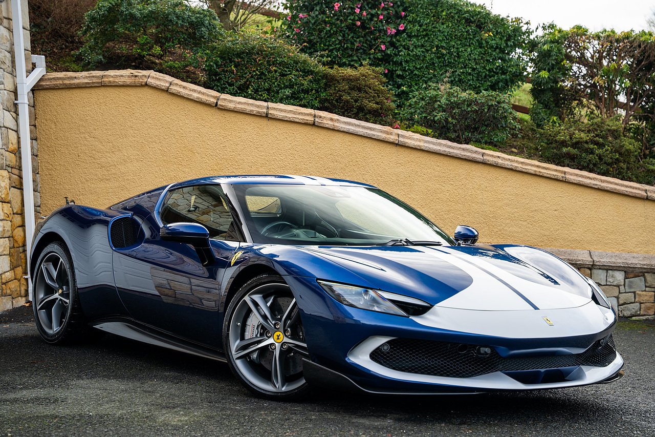 Massive Spec Ferrari 296 GTB listed to £400k in December 2025 and now representing massive savings from new, this 296 is finished in Tour De France Blue metallic with contrasting Argento Nurburgring factory painted stripe and full Body PPF fitted by Topaz detailing, Fitted with the rare and Special Extended Assetto Fiorano Package which includes fixed multimatic dampers, front lip spoiler in carbon fibre, side sills in carbon fibre, carbon fibre engine cover, rear extendable spoiler in carbon fibre, matt carbon fibre inner door panels with carbon fibre sill plate, carbon fibre rear bench and tunnel, Size Large Carbon Fibre Racing seats with Harnesses, Carbon Fibre driving zone with led's, Heads Up Display, Apple Carplay, JBL Premium hifi system, Racing Seat lifter, Lexan glass and Carbon fibre engine cover, Scuderia Fender Shields, Argento Painted brake Calipers.
