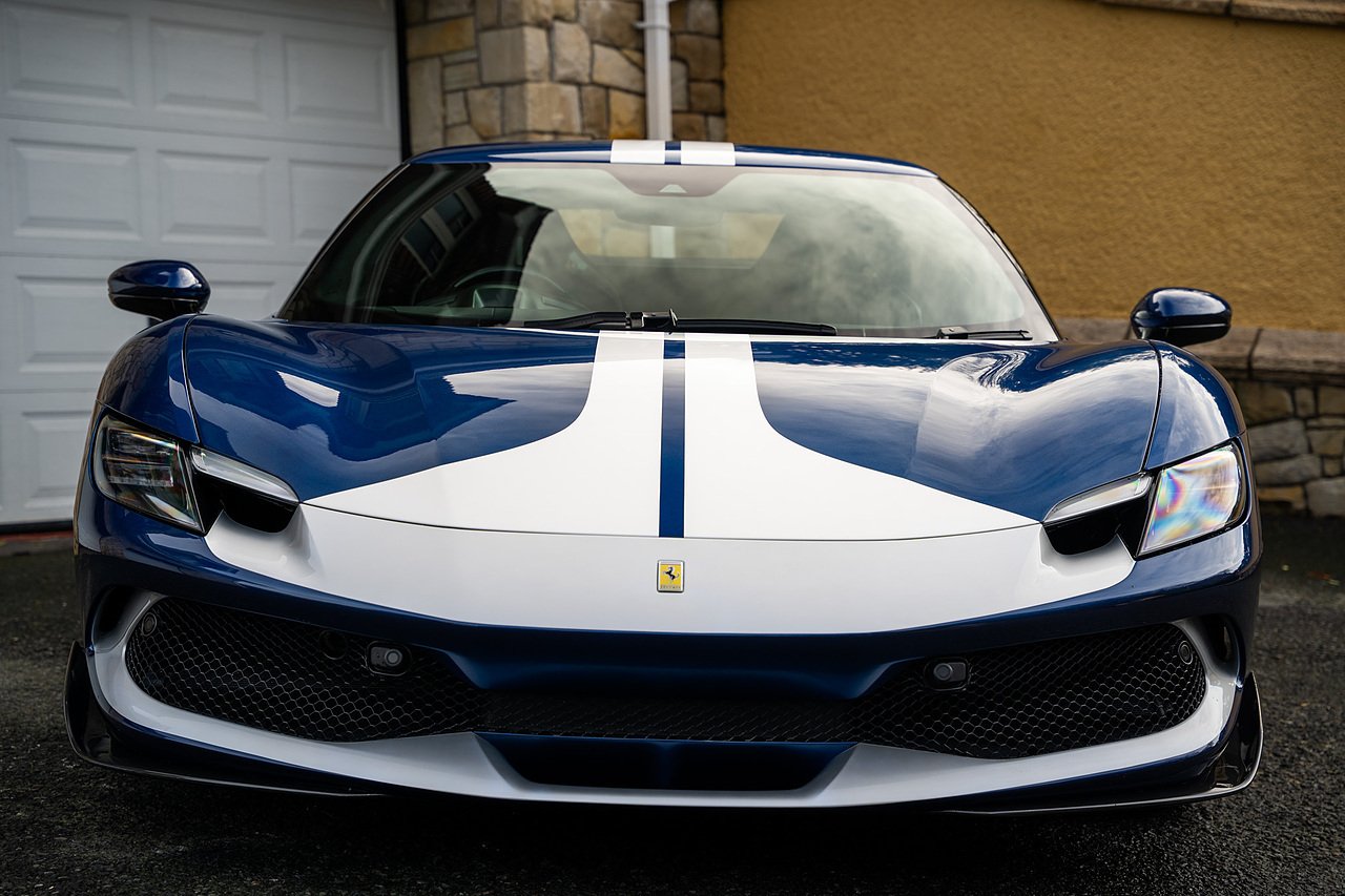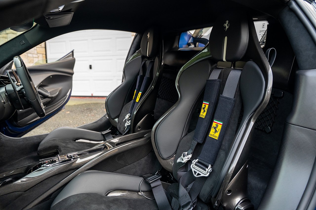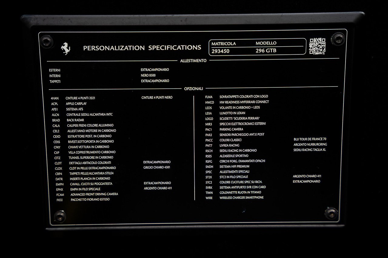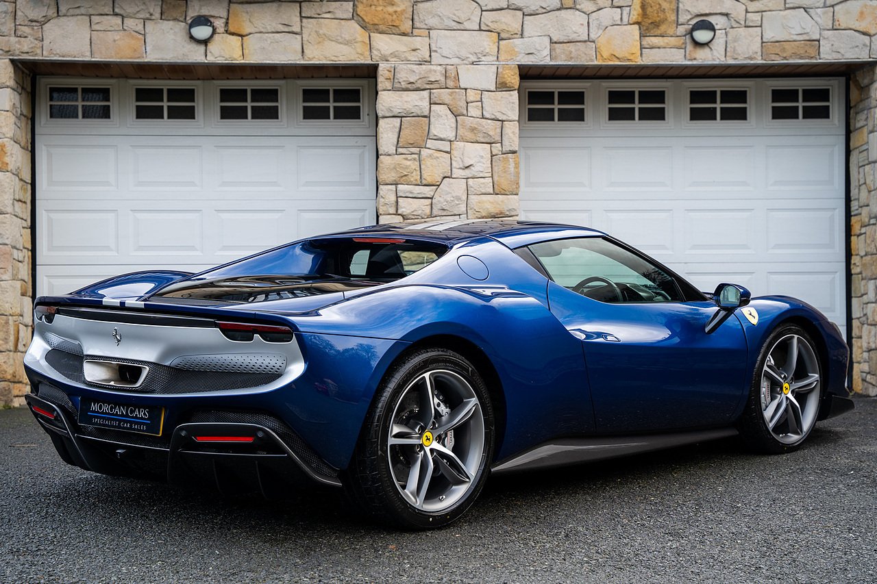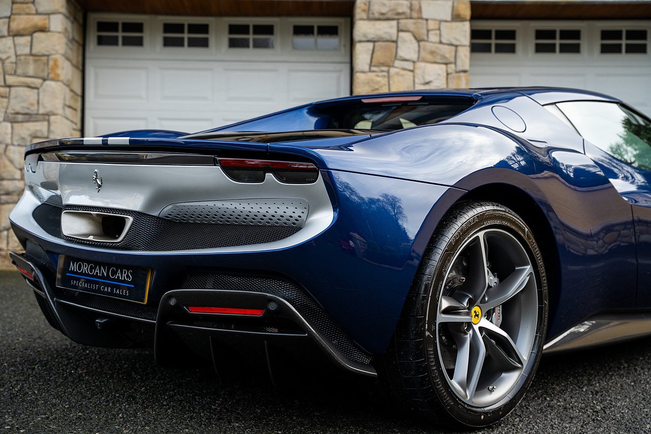 Massive Spec Ferrari 296 GTB listed to £400k in December 2025 and now representing massive savings from new, this 296 is finished in Tour De France Blue metallic with contrasting Argento Nurburgring factory painted stripe and full Body PPF fitted by Topaz detailing, Fitted with the rare and Special Extended Assetto Fiorano Package which includes fixed multimatic dampers, front lip spoiler in carbon fibre, side sills in carbon fibre, carbon fibre engine cover, rear extendable spoiler in carbon fibre, matt carbon fibre inner door panels with carbon fibre sill plate, carbon fibre rear bench and tunnel, Size Large Carbon Fibre Racing seats with Harnesses, Carbon Fibre driving zone with led's, Heads Up Display, Apple Carplay, JBL Premium hifi system, Racing Seat lifter, Lexan glass and Carbon fibre engine cover, Scuderia Fender Shields, Argento Painted brake Calipers.