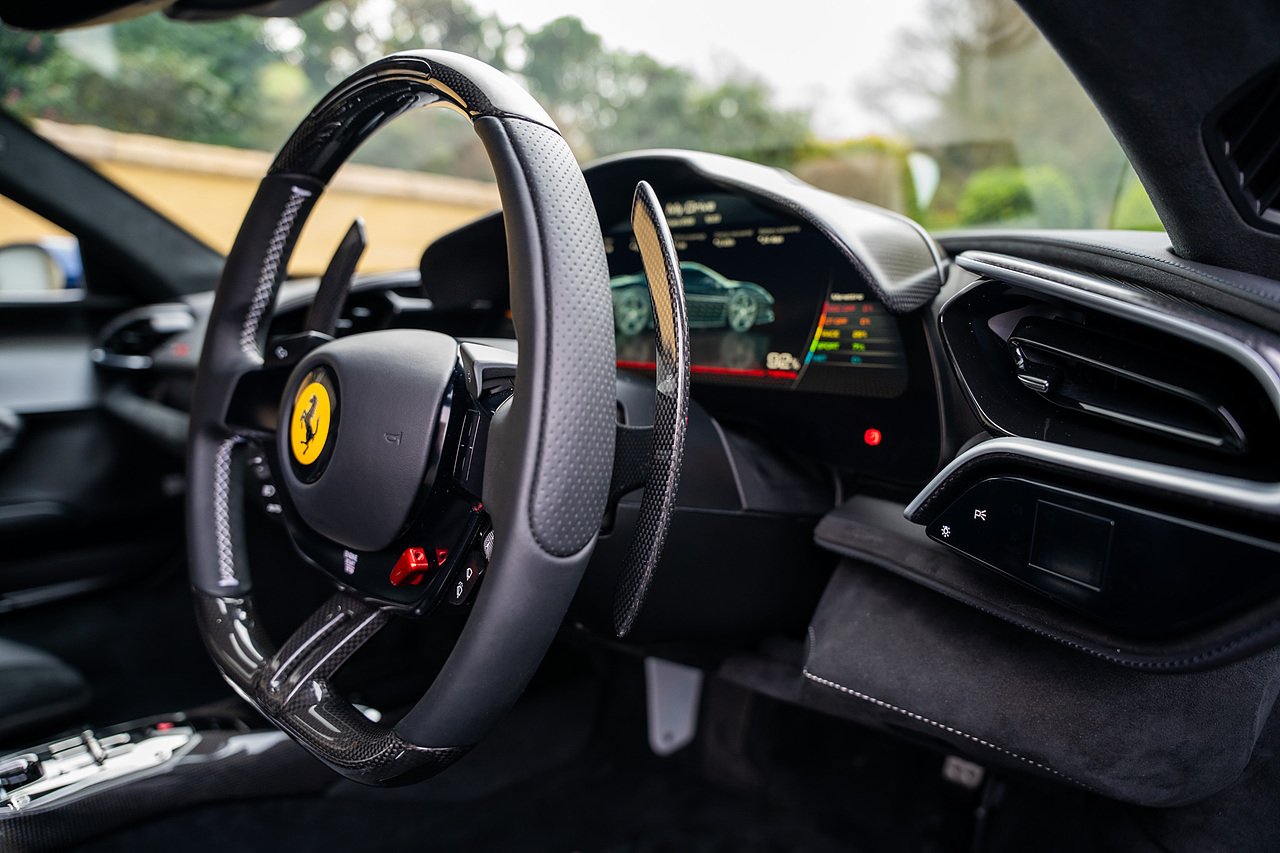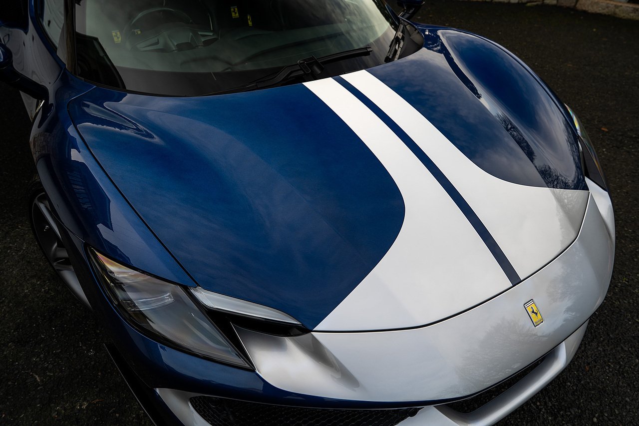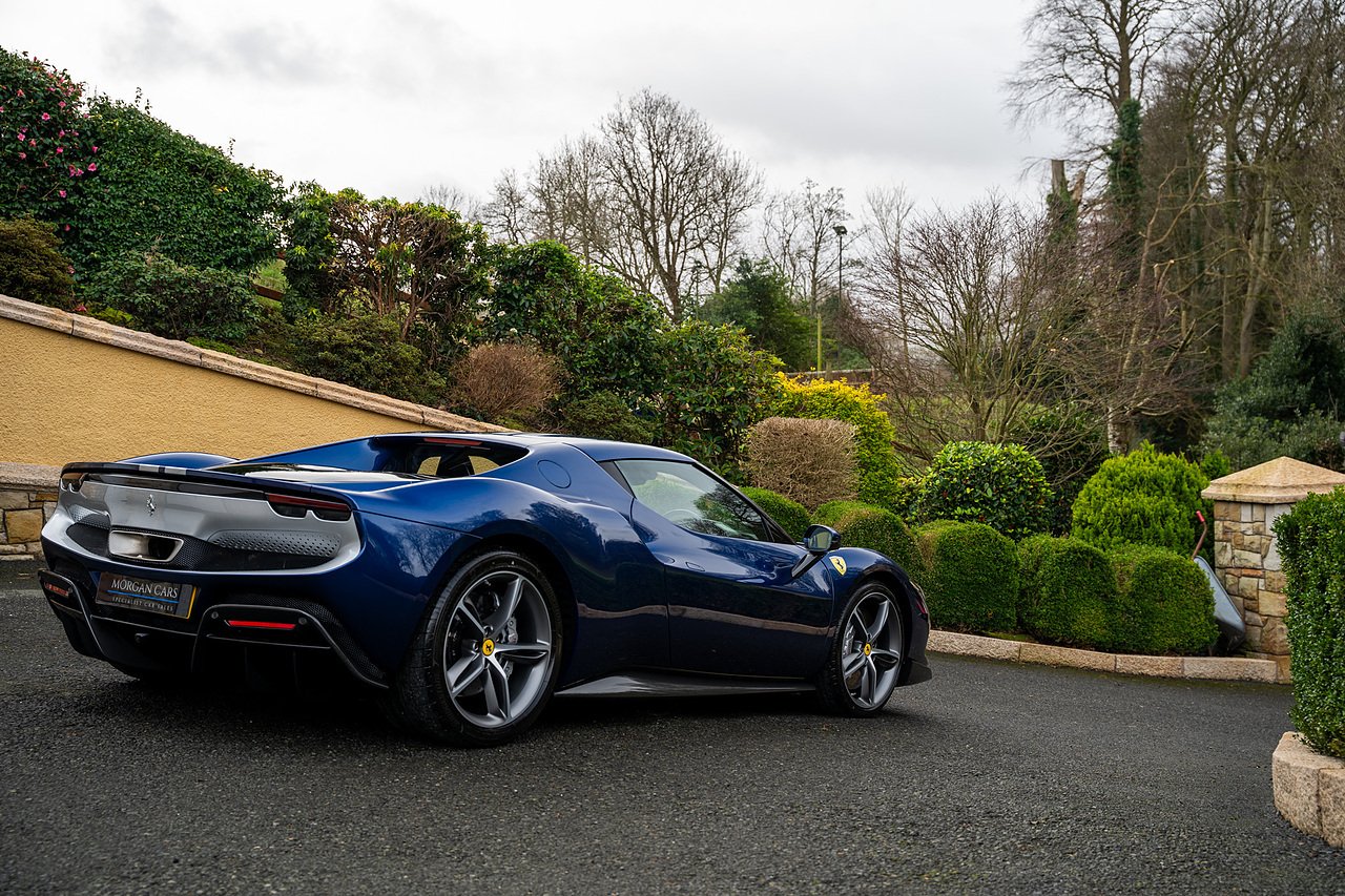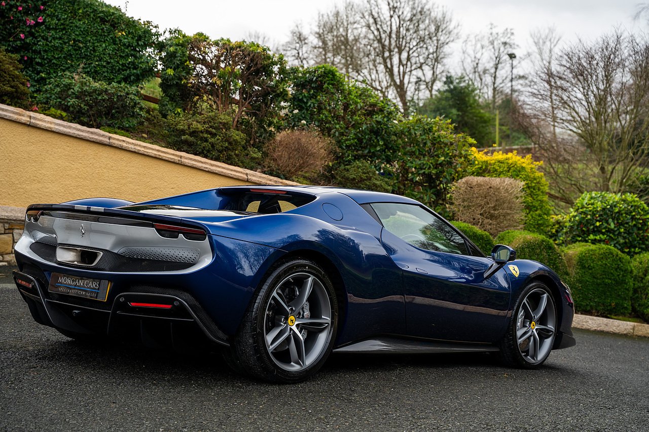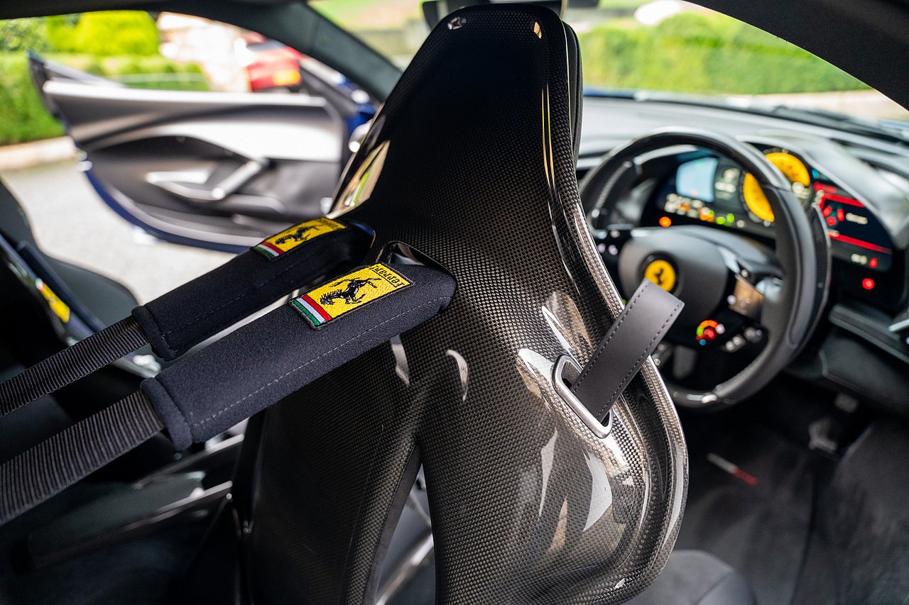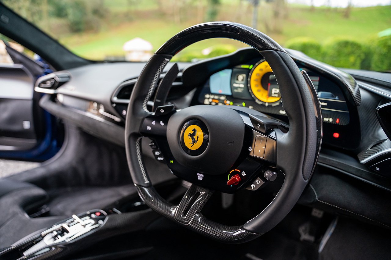 Massive Spec Ferrari 296 GTB listed to £400k in December 2025 and now representing massive savings from new, this 296 is finished in Tour De France Blue metallic with contrasting Argento Nurburgring factory painted stripe and full Body PPF fitted by Topaz detailing, Fitted with the rare and Special Extended Assetto Fiorano Package which includes fixed multimatic dampers, front lip spoiler in carbon fibre, side sills in carbon fibre, carbon fibre engine cover, rear extendable spoiler in carbon fibre, matt carbon fibre inner door panels with carbon fibre sill plate, carbon fibre rear bench and tunnel, Size Large Carbon Fibre Racing seats with Harnesses, Carbon Fibre driving zone with led's, Heads Up Display, Apple Carplay, JBL Premium hifi system, Racing Seat lifter, Lexan glass and Carbon fibre engine cover, Scuderia Fender Shields, Argento Painted brake Calipers.