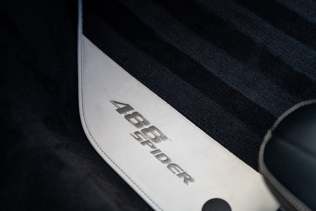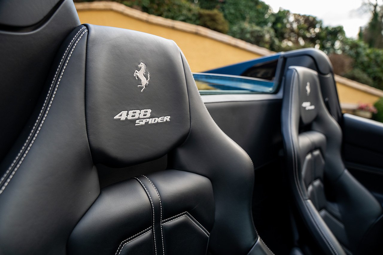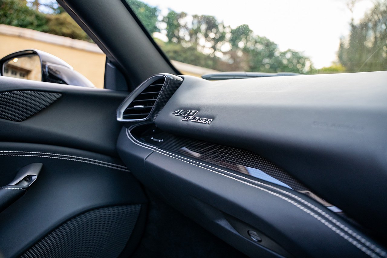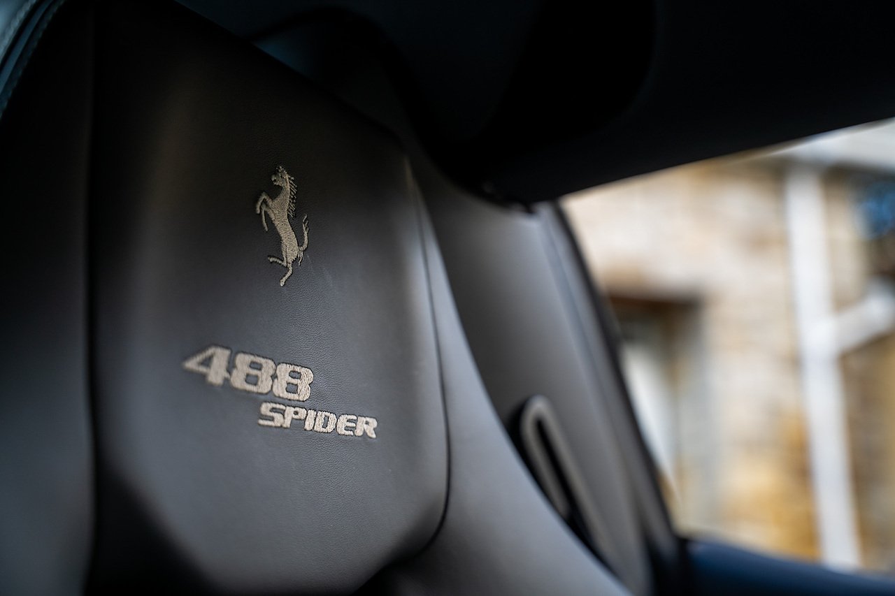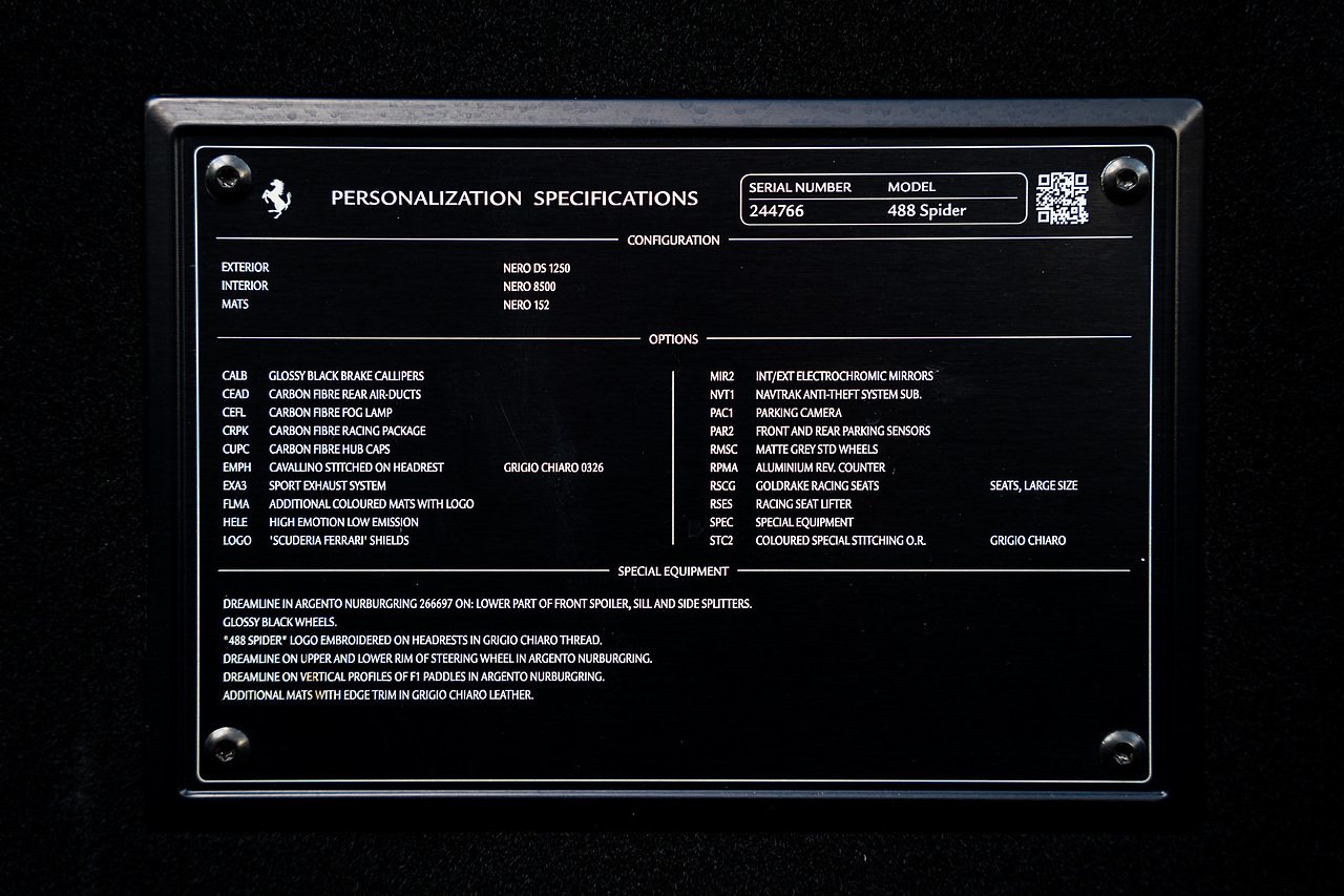 The Specification of this example includes Ultra Rare Gloss Silver Dream Line Elements throughout the Front Lower Splitter, Side Extension and side Vents in Argento Nurburgring as well as '488 Spider Headrest Logo Stitched in Grigio Chiaro Thread. Also the Example in Full of optional extra equipment and details including Carbon Fibre extras including the Rear Tail Light Surrounds, Fog light Surround, Rear Air Ducks, As well as the Interior Central Bridge and Trim Elements, Carbon Fibre Racing Package including the Carbon Goldrake Racing Carbon Daytona Seats (Large), Sports Exhaust System, Carbon Fibre Wheel Center, Additional Coloured and Stitched 488 Floor Mats Grigio Chiaro Thread, Scuderia Ferrari Shields, Electronic Mirrors, Rear Reversing Camera, Front and Rear Parking Sensors, Rear Italian Flag On Engine Compartment, Aluminium Rev Counter, Racing Seat Lifter, DAB Radio. See Plaque For Full Additional extras or feel free to get in touch for more.