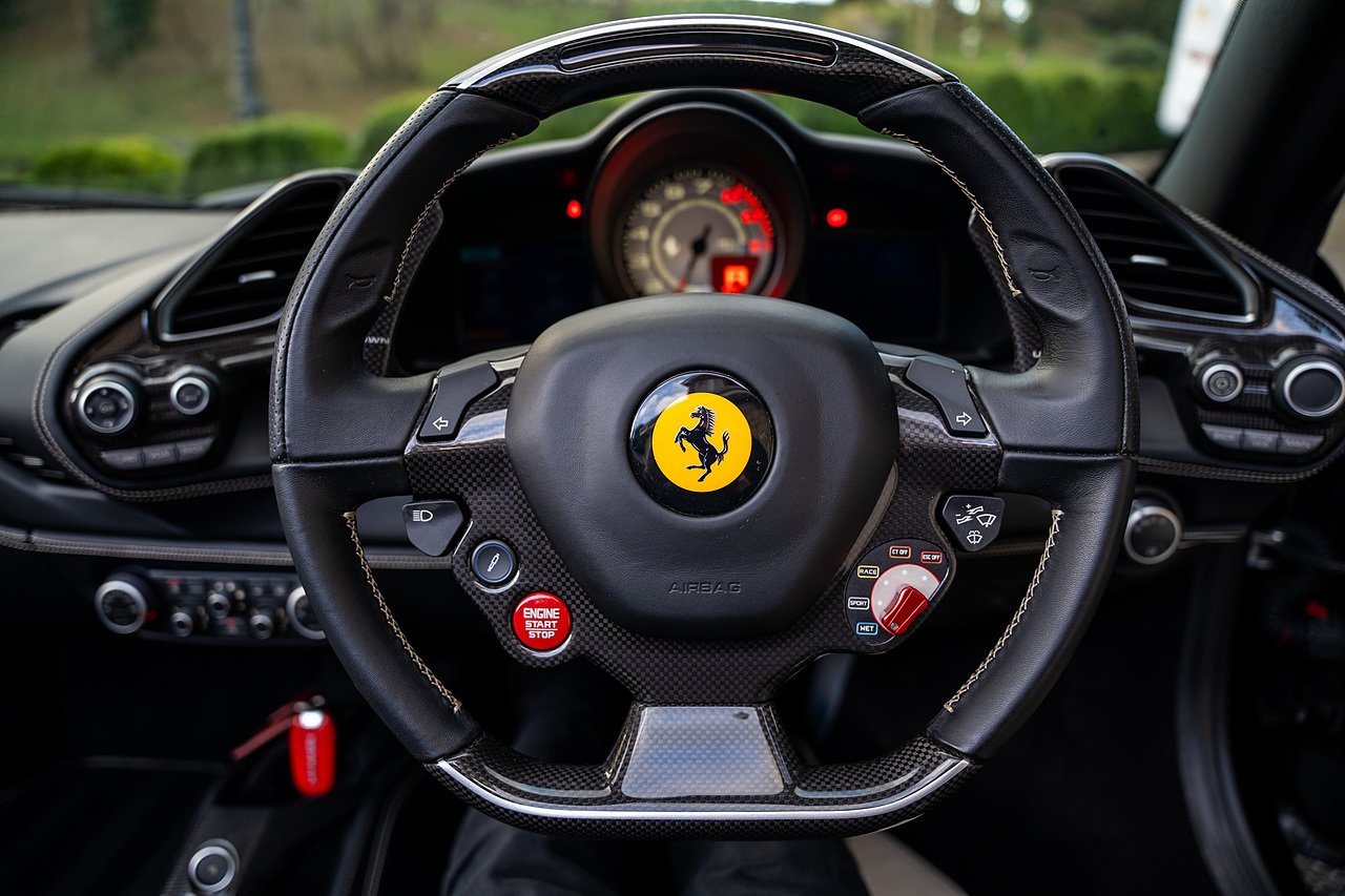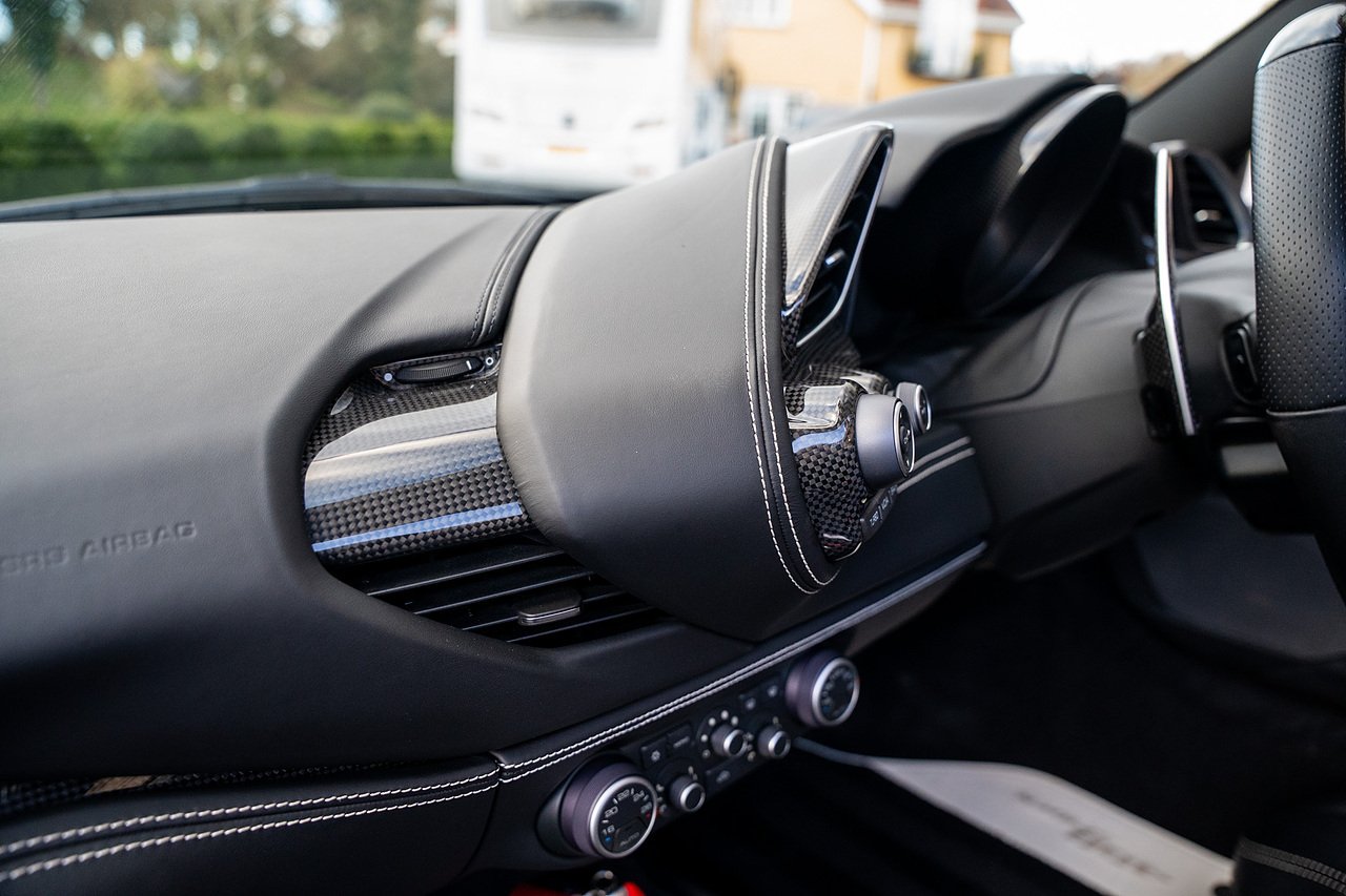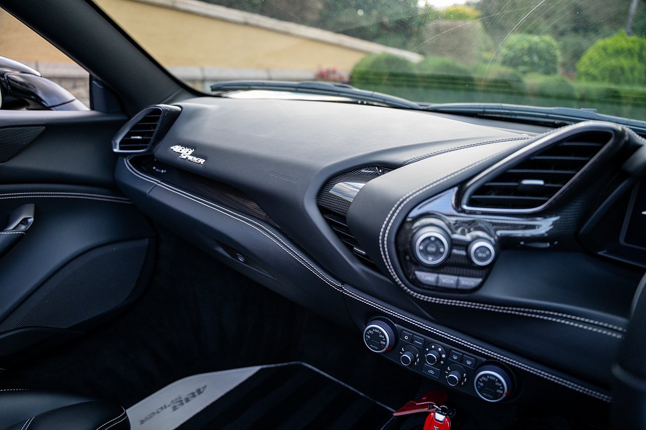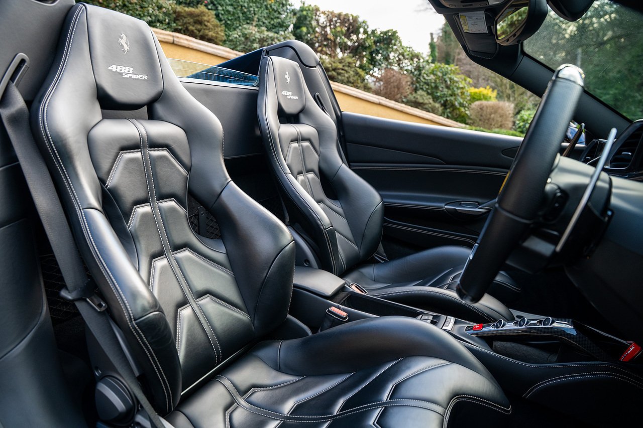 The Specification of this example includes Ultra Rare Gloss Silver Dream Line Elements throughout the Front Lower Splitter, Side Extension and side Vents in Argento Nurburgring as well as '488 Spider Headrest Logo Stitched in Grigio Chiaro Thread. Also the Example in Full of optional extra equipment and details including Carbon Fibre extras including the Rear Tail Light Surrounds, Fog light Surround, Rear Air Ducks, As well as the Interior Central Bridge and Trim Elements, Carbon Fibre Racing Package including the Carbon Goldrake Racing Carbon Daytona Seats (Large), Sports Exhaust System, Carbon Fibre Wheel Center, Additional Coloured and Stitched 488 Floor Mats Grigio Chiaro Thread, Scuderia Ferrari Shields, Electronic Mirrors, Rear Reversing Camera, Front and Rear Parking Sensors, Rear Italian Flag On Engine Compartment, Aluminium Rev Counter, Racing Seat Lifter, DAB Radio. See Plaque For Full Additional extras or feel free to get in touch for more.