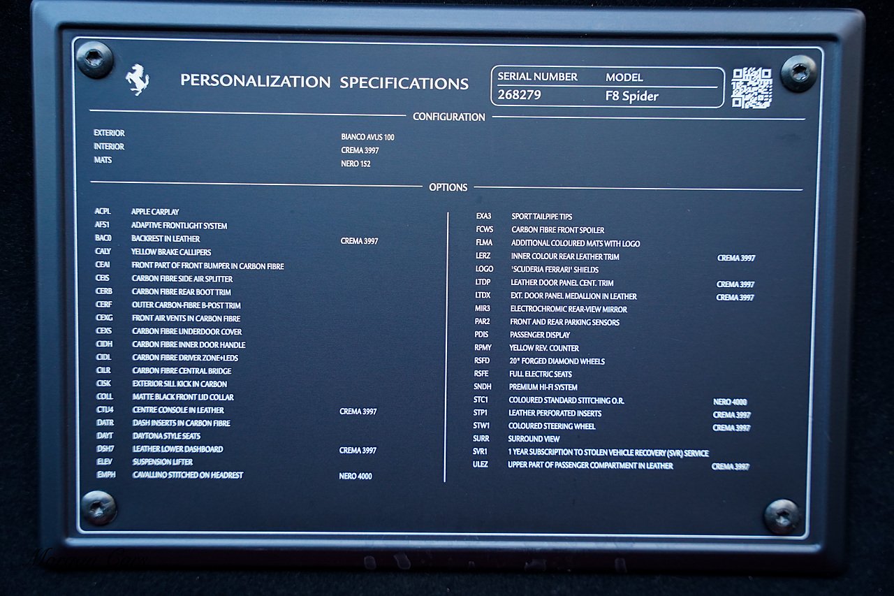 Embroidered Ferrari Logo in Headrest, Passenger Display, Carbon Fibre Driver zone with LEDs, Carbon Fibre Central Bridge, Interior handles in Carbon Fibre, Exterior Sill Kick in Carbon, Carbon Fibre Dashboard Inserts, 360 Surround View Camera, Parking Sensors, Apple Car Play, Electrochromic Rearview Mirror, Premium JBL Surround Sound Hi-Fi, Crema Leather Floor Mats with F8 Detailing, Giallo Yellow Rev Marker, AFS Front-light System, and much much more. Contact us for full list of specification and information on this one of a kind example.