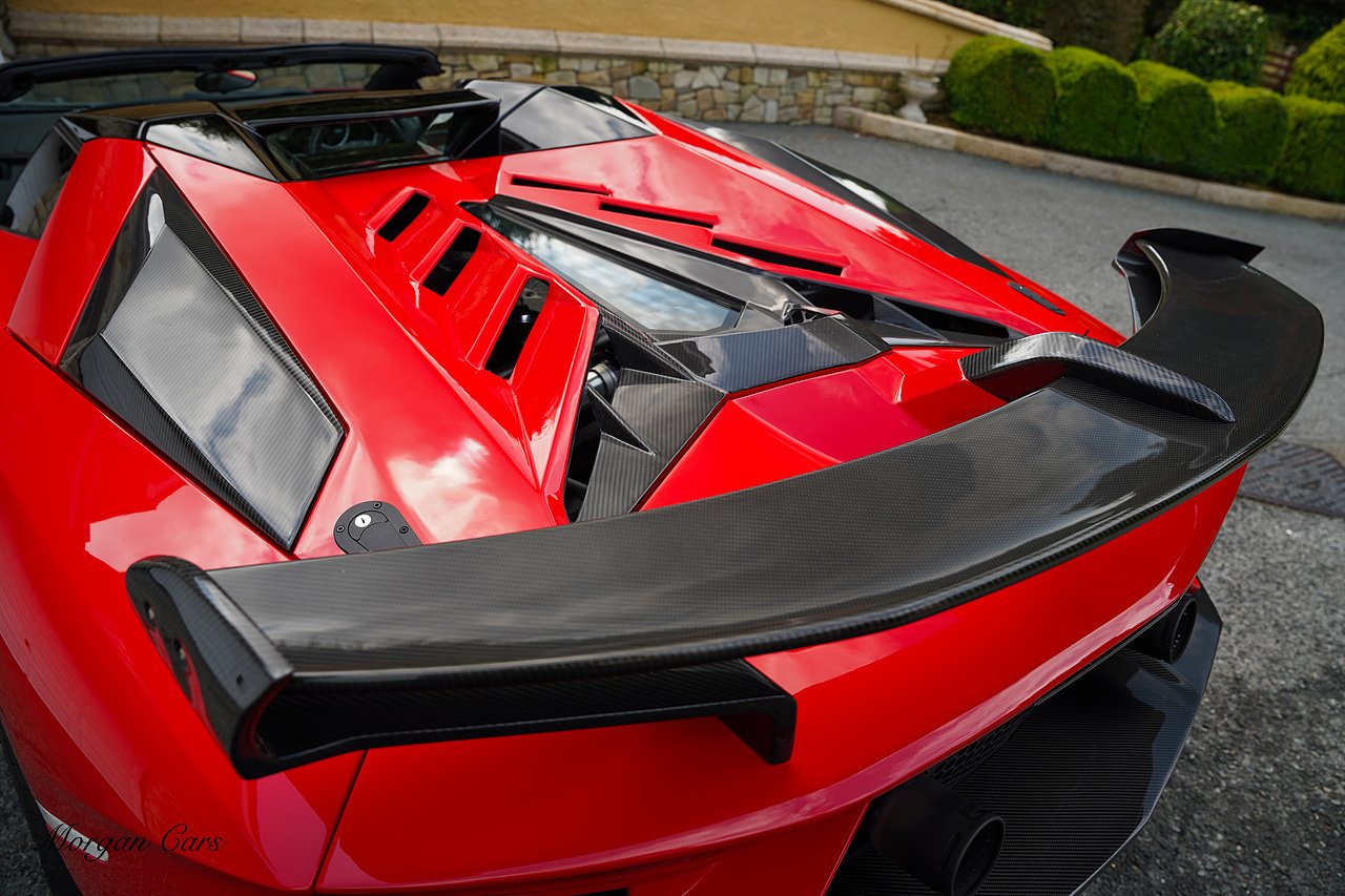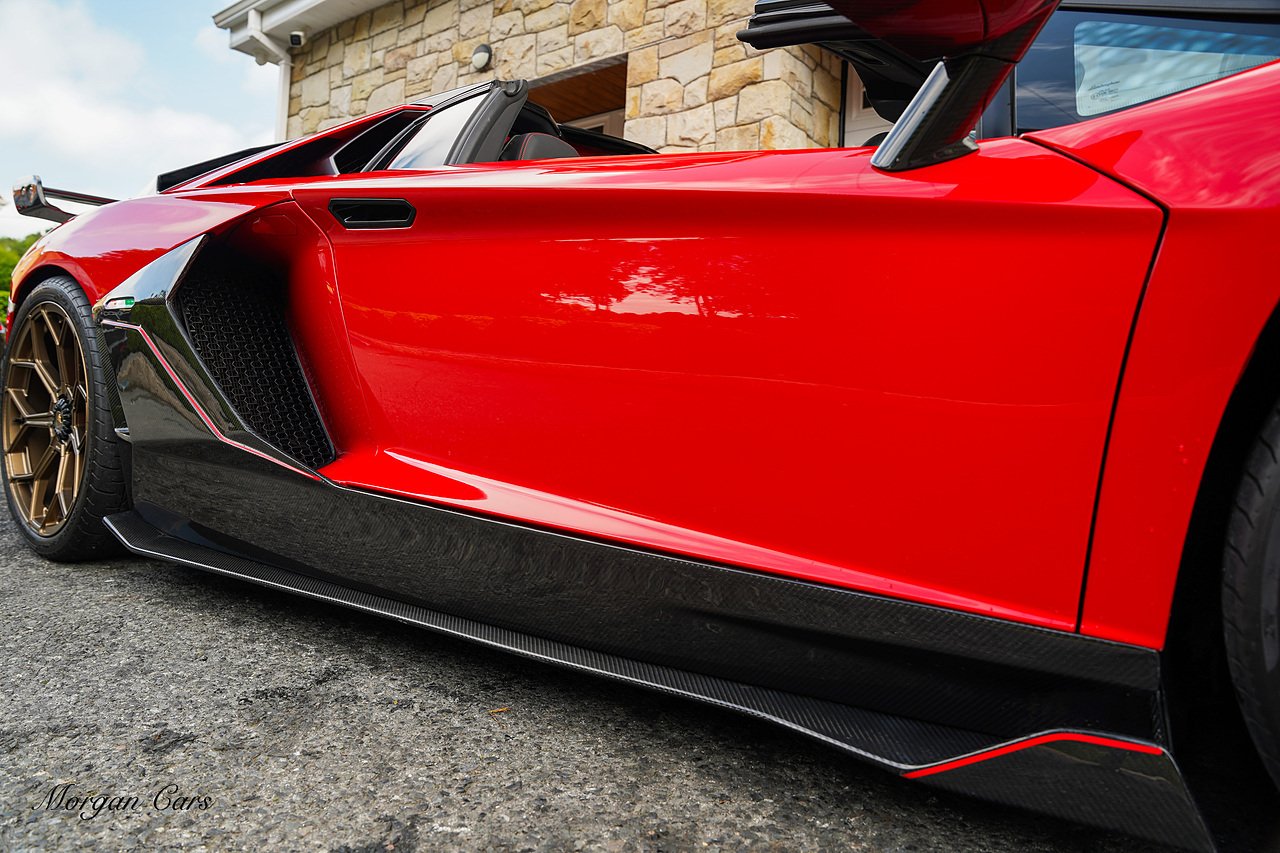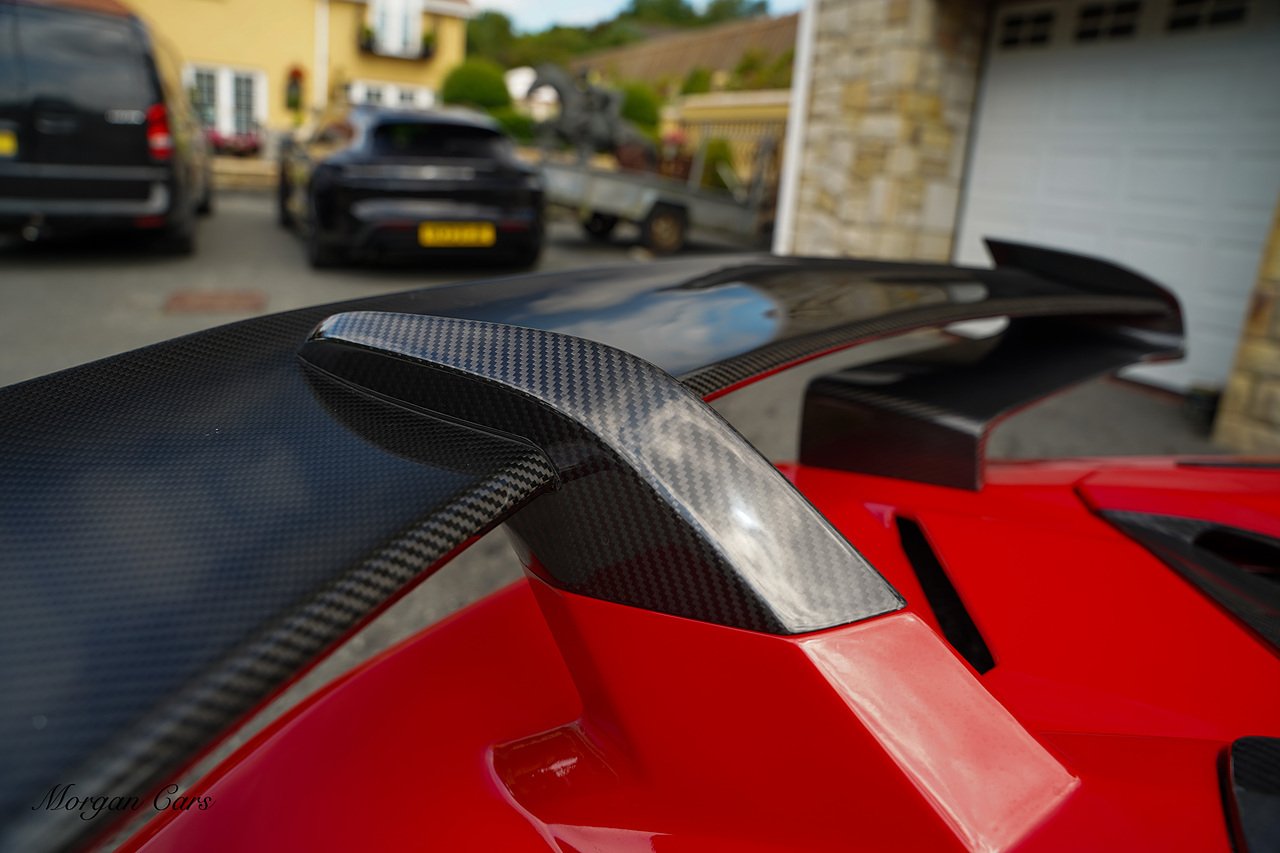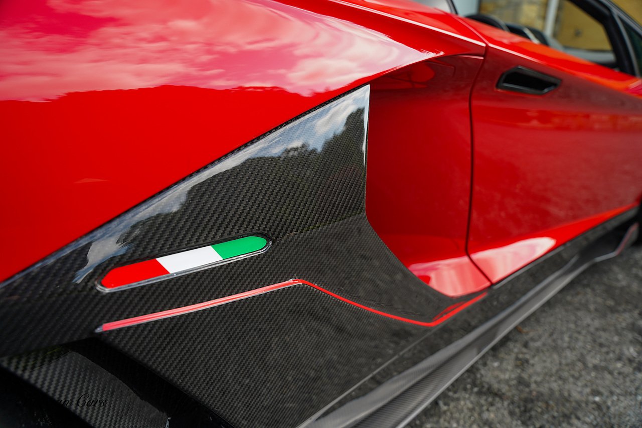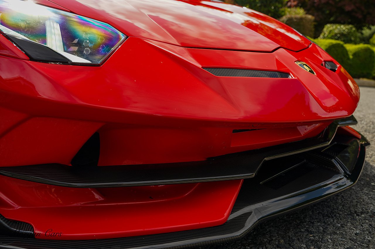 Complete with full Carbon Fibre Lamborghini SVJ Conversion Styling body kit throughout, including SVJ Front bumper with Exposed Carbon Fibre Lower Splitter Side Panels and Front inner vents, SVJ Side Skirts with Caron Fibre Extensions in Exposed Carbon Fibre & Rosso Mar Decals, Full Carbon Fibre rear Bumper and Diffuser and Upper SVJ Spoiler in Exposed Carbon fibre, SVJ Engine Cover with Glass and Carbon Fibre elements. This Vehicle has extensive Caron Fibre elements including, mirrors in Exposed Carbon Fibre, Windscreen Whippers in Caron Fibre, Front Bonnet Vents in Carbon Fibre. SVJ 20" & 21" Alloy Wheels finished in Dark Bronze with Rosso Mars Brake Callipers with Caron Ceramic Brakes. Windscreen Surround in Gloss Black with Upper roof panels in Gloss Black. Complete with Custom Gintani SVJ StyleExhaust System with Satin Black Tips and Black Mesh Surround.