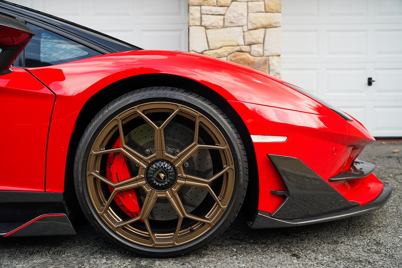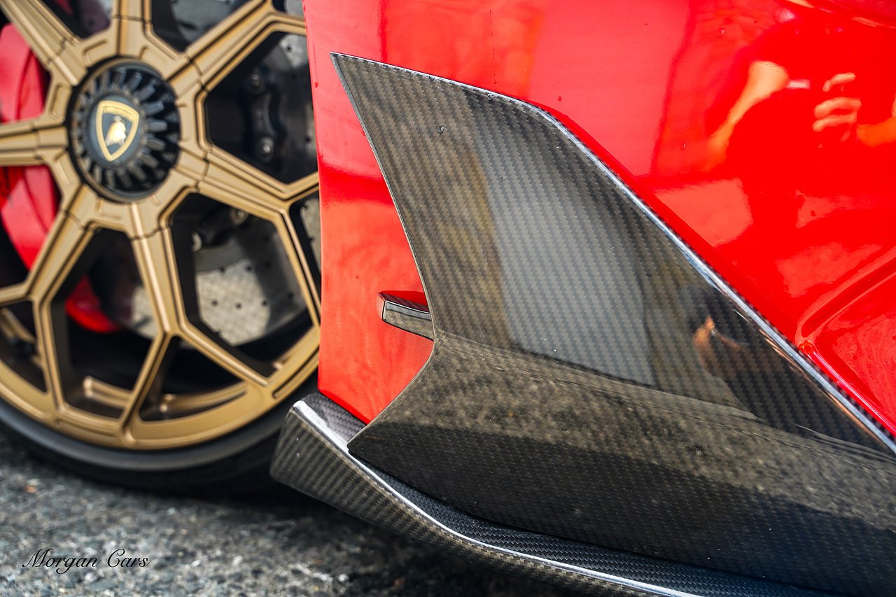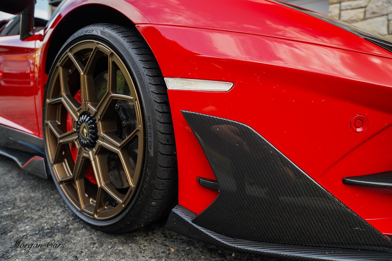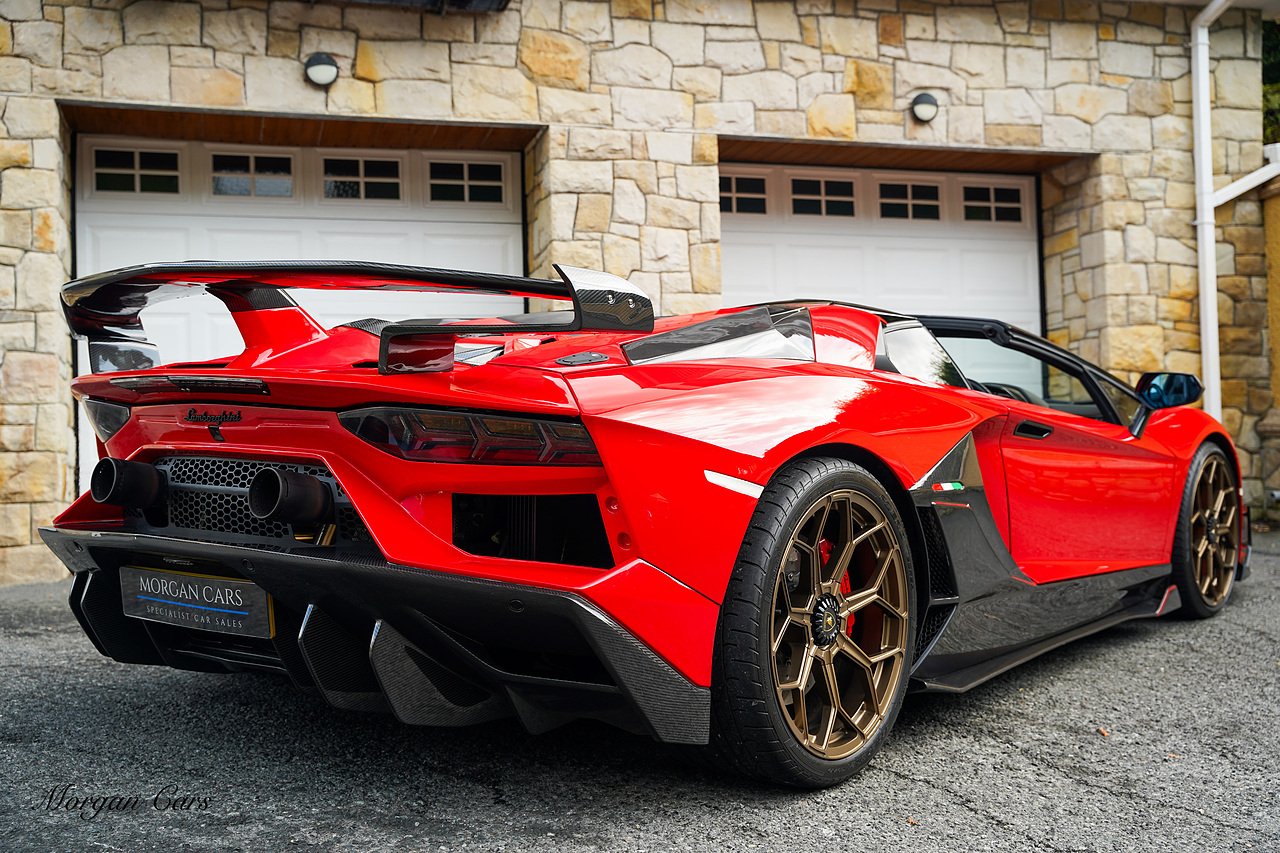 Complete with full Carbon Fibre Lamborghini SVJ Conversion Styling body kit throughout, including SVJ Front bumper with Exposed Carbon Fibre Lower Splitter Side Panels and Front inner vents, SVJ Side Skirts with Caron Fibre Extensions in Exposed Carbon Fibre & Rosso Mar Decals, Full Carbon Fibre rear Bumper and Diffuser and Upper SVJ Spoiler in Exposed Carbon fibre, SVJ Engine Cover with Glass and Carbon Fibre elements. This Vehicle has extensive Caron Fibre elements including, mirrors in Exposed Carbon Fibre, Windscreen Whippers in Caron Fibre, Front Bonnet Vents in Carbon Fibre. SVJ 20" & 21" Alloy Wheels finished in Dark Bronze with Rosso Mars Brake Callipers with Caron Ceramic Brakes. Windscreen Surround in Gloss Black with Upper roof panels in Gloss Black. Complete with Custom Gintani SVJ StyleExhaust System with Satin Black Tips and Black Mesh Surround.