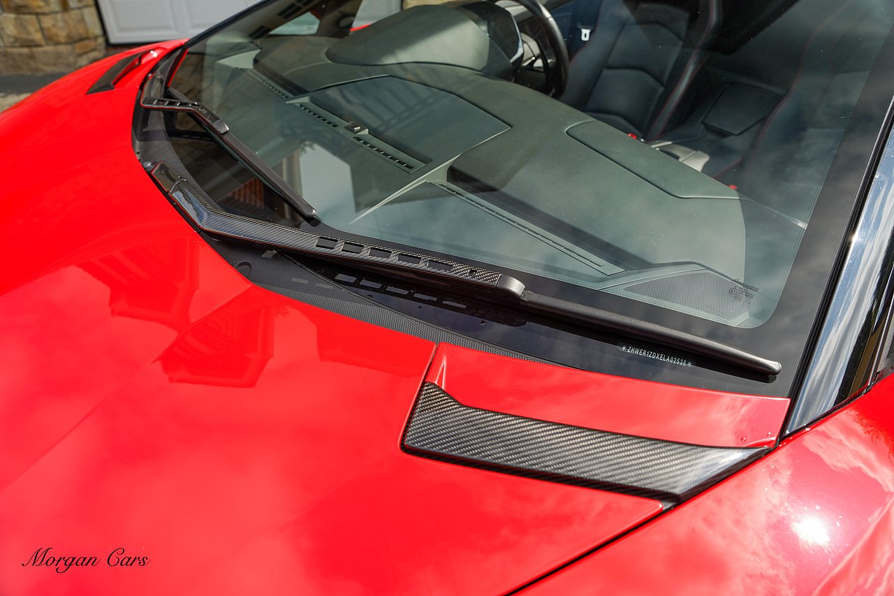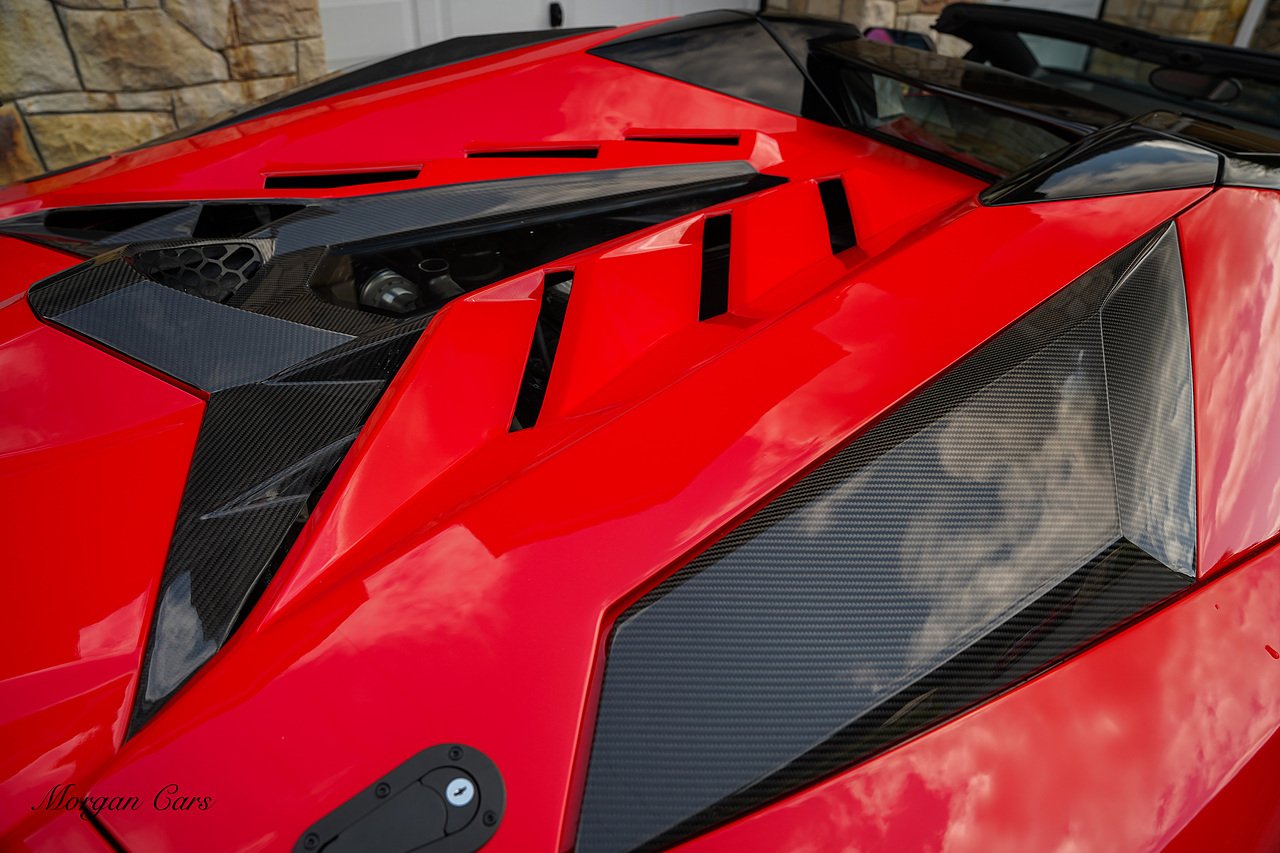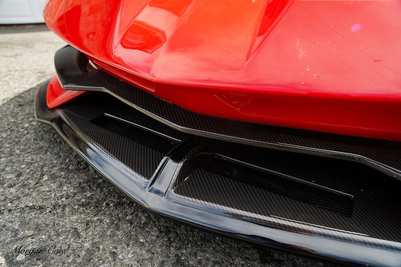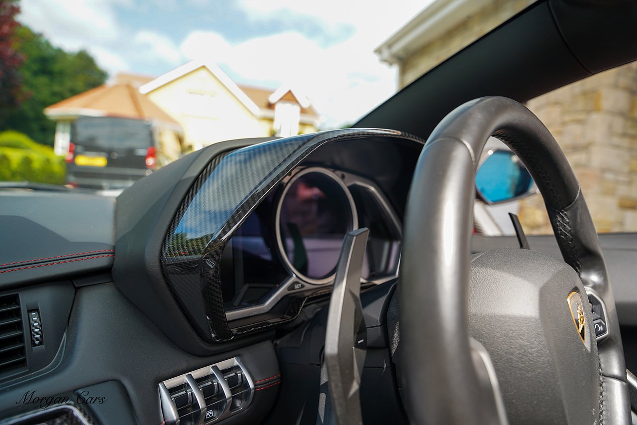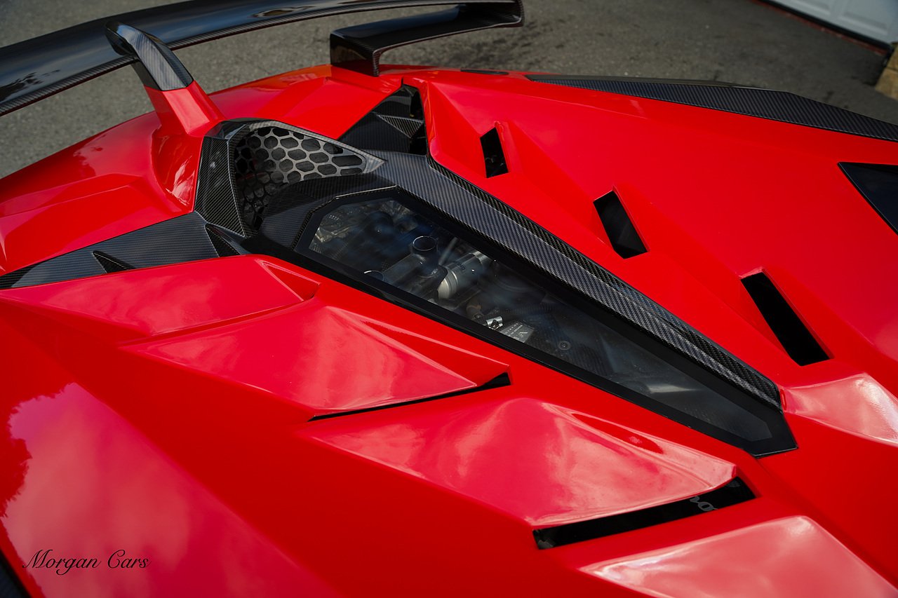 Complete with full Carbon Fibre Lamborghini SVJ Conversion Styling body kit throughout, including SVJ Front bumper with Exposed Carbon Fibre Lower Splitter Side Panels and Front inner vents, SVJ Side Skirts with Caron Fibre Extensions in Exposed Carbon Fibre & Rosso Mar Decals, Full Carbon Fibre rear Bumper and Diffuser and Upper SVJ Spoiler in Exposed Carbon fibre, SVJ Engine Cover with Glass and Carbon Fibre elements. This Vehicle has extensive Caron Fibre elements including, mirrors in Exposed Carbon Fibre, Windscreen Whippers in Caron Fibre, Front Bonnet Vents in Carbon Fibre. SVJ 20" & 21" Alloy Wheels finished in Dark Bronze with Rosso Mars Brake Callipers with Caron Ceramic Brakes. Windscreen Surround in Gloss Black with Upper roof panels in Gloss Black. Complete with Custom Gintani SVJ StyleExhaust System with Satin Black Tips and Black Mesh Surround.