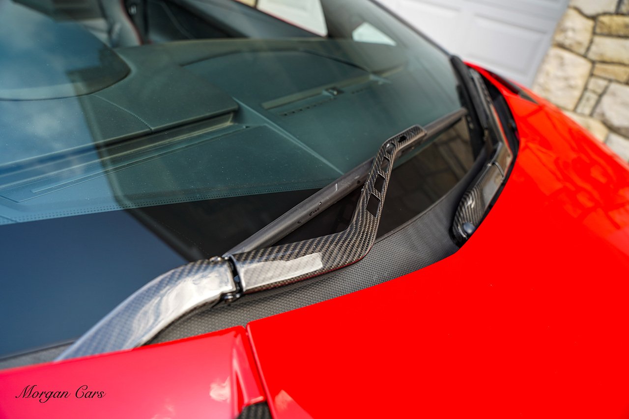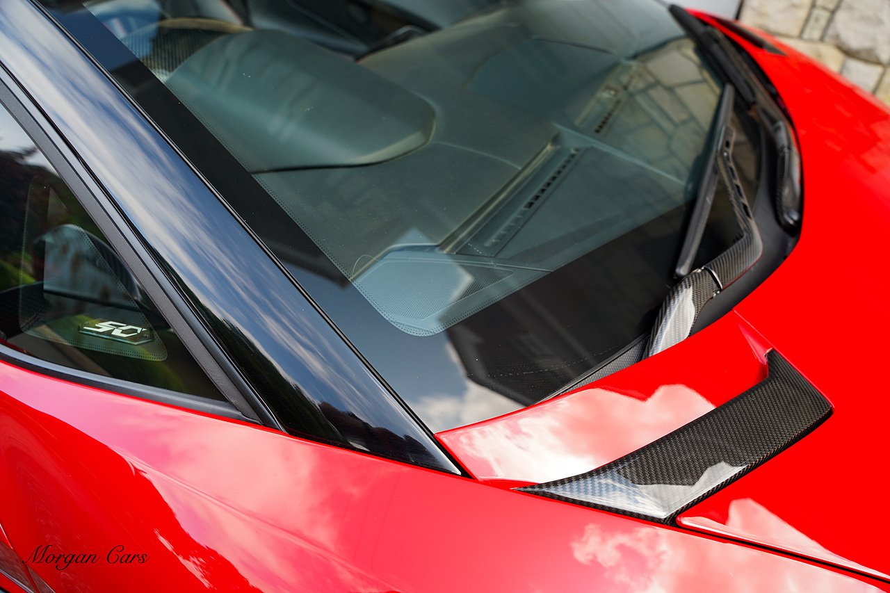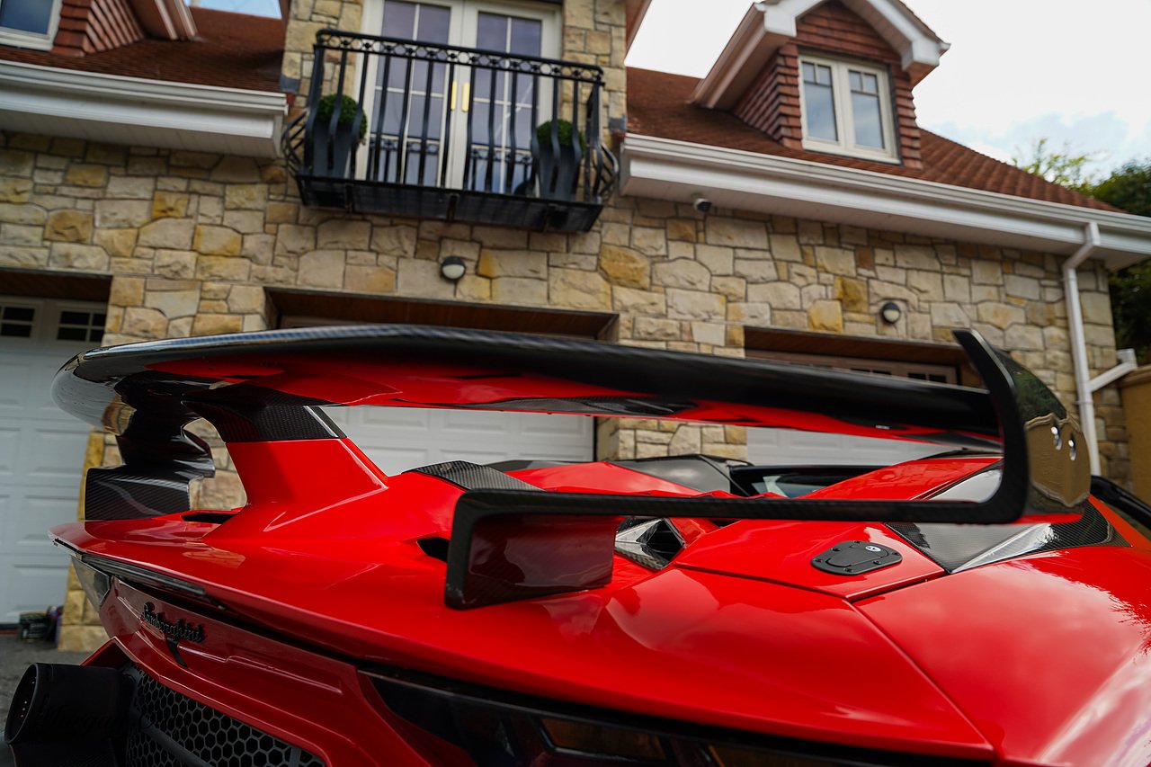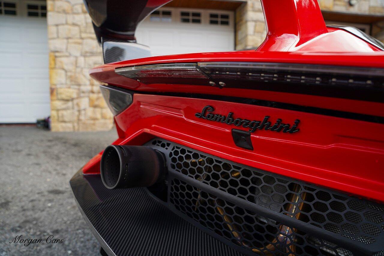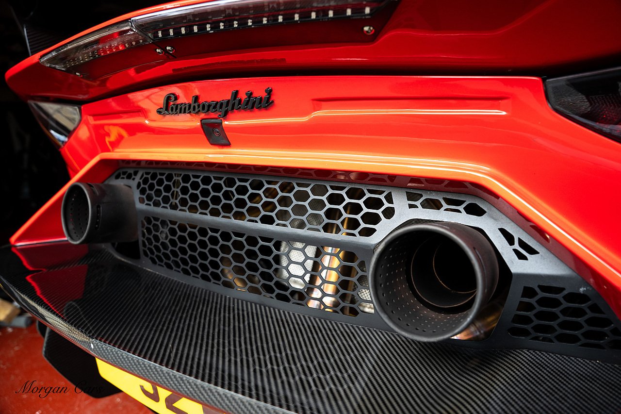 Complete with full Carbon Fibre Lamborghini SVJ Conversion Styling body kit throughout, including SVJ Front bumper with Exposed Carbon Fibre Lower Splitter Side Panels and Front inner vents, SVJ Side Skirts with Caron Fibre Extensions in Exposed Carbon Fibre & Rosso Mar Decals, Full Carbon Fibre rear Bumper and Diffuser and Upper SVJ Spoiler in Exposed Carbon fibre, SVJ Engine Cover with Glass and Carbon Fibre elements. This Vehicle has extensive Caron Fibre elements including, mirrors in Exposed Carbon Fibre, Windscreen Whippers in Caron Fibre, Front Bonnet Vents in Carbon Fibre. SVJ 20" & 21" Alloy Wheels finished in Dark Bronze with Rosso Mars Brake Callipers with Caron Ceramic Brakes. Windscreen Surround in Gloss Black with Upper roof panels in Gloss Black. Complete with Custom Gintani SVJ StyleExhaust System with Satin Black Tips and Black Mesh Surround.