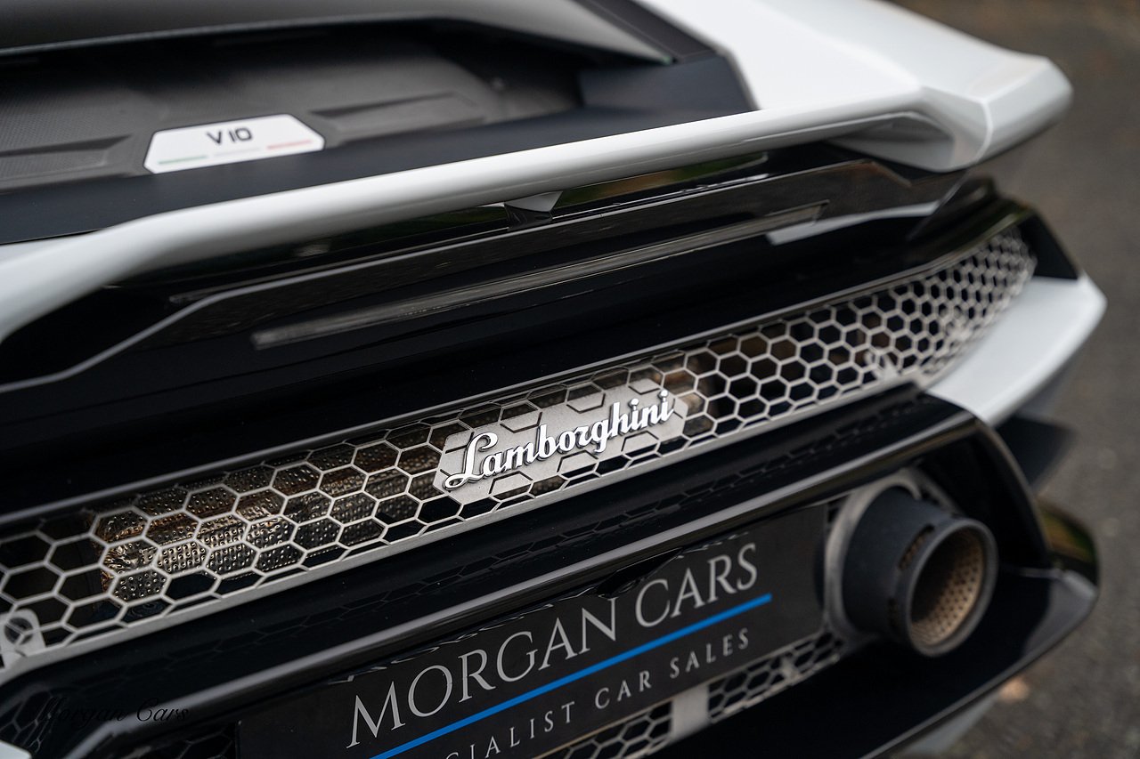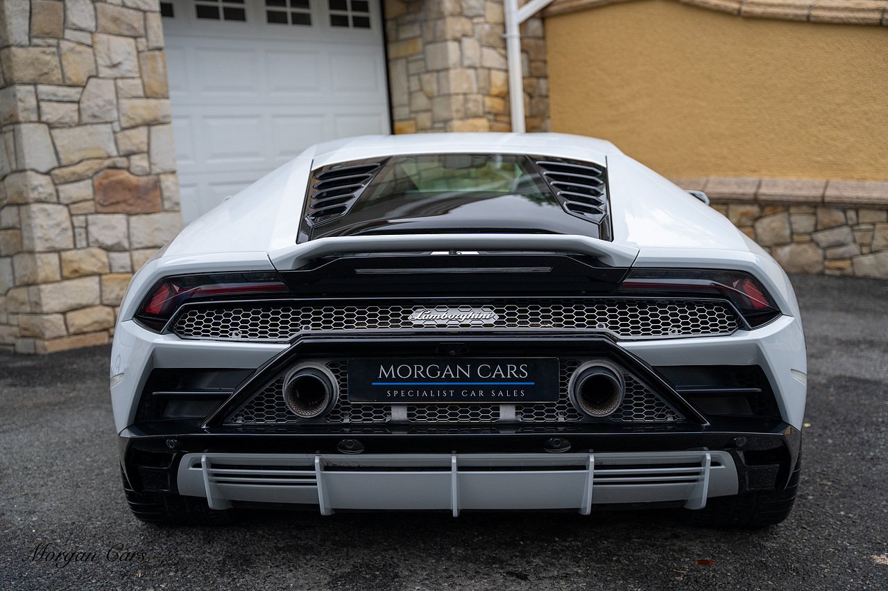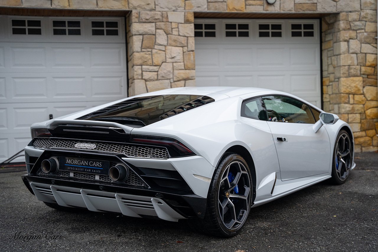 2020 Lamborghini Huracan LP640-4 EVO finished in Bianco Icarus with Q Citura Nero Leather interior with contrasting Blu Amon stitching | Featured is a full Lamborghini Service history from new | Front Vehicle Axle lifting system with Magno Rheological Suspension| Transparent Engine Cover | Rear reversing assist camera | Apple Car play and connected service Infotainment system | 20" Aesir Alloy wheels in Black and Diamond cut | Style Package in Gloss black | Q Citura suede Headliner | Q Citura on Rear parcel shelf with contrast stitch | DAB Radio Tuner | Full Electric and Heated seats | Electro Chromatic exterior mirrors | Ad Personam CCMR Brake Calipers Painted in Blue | LED Light system | Digital Cockpit display.