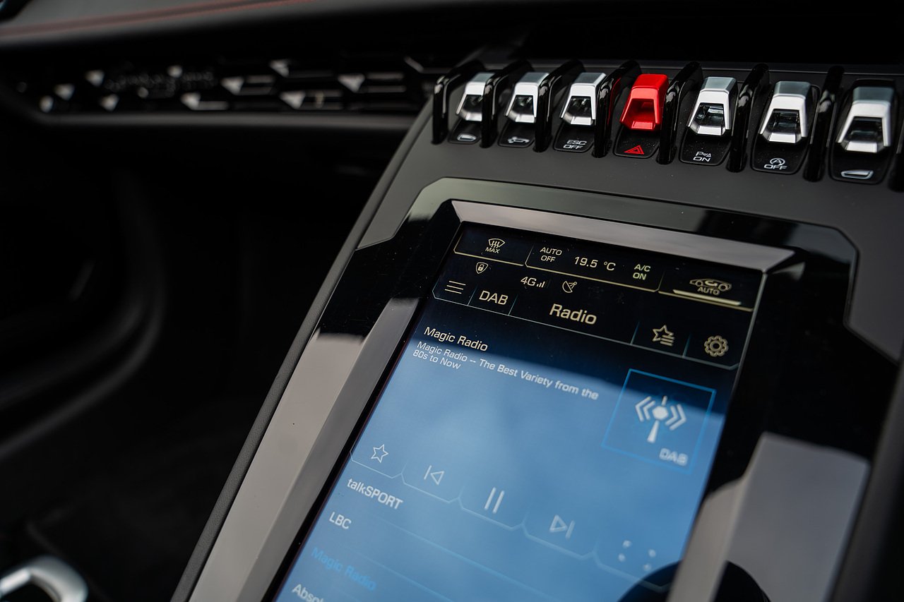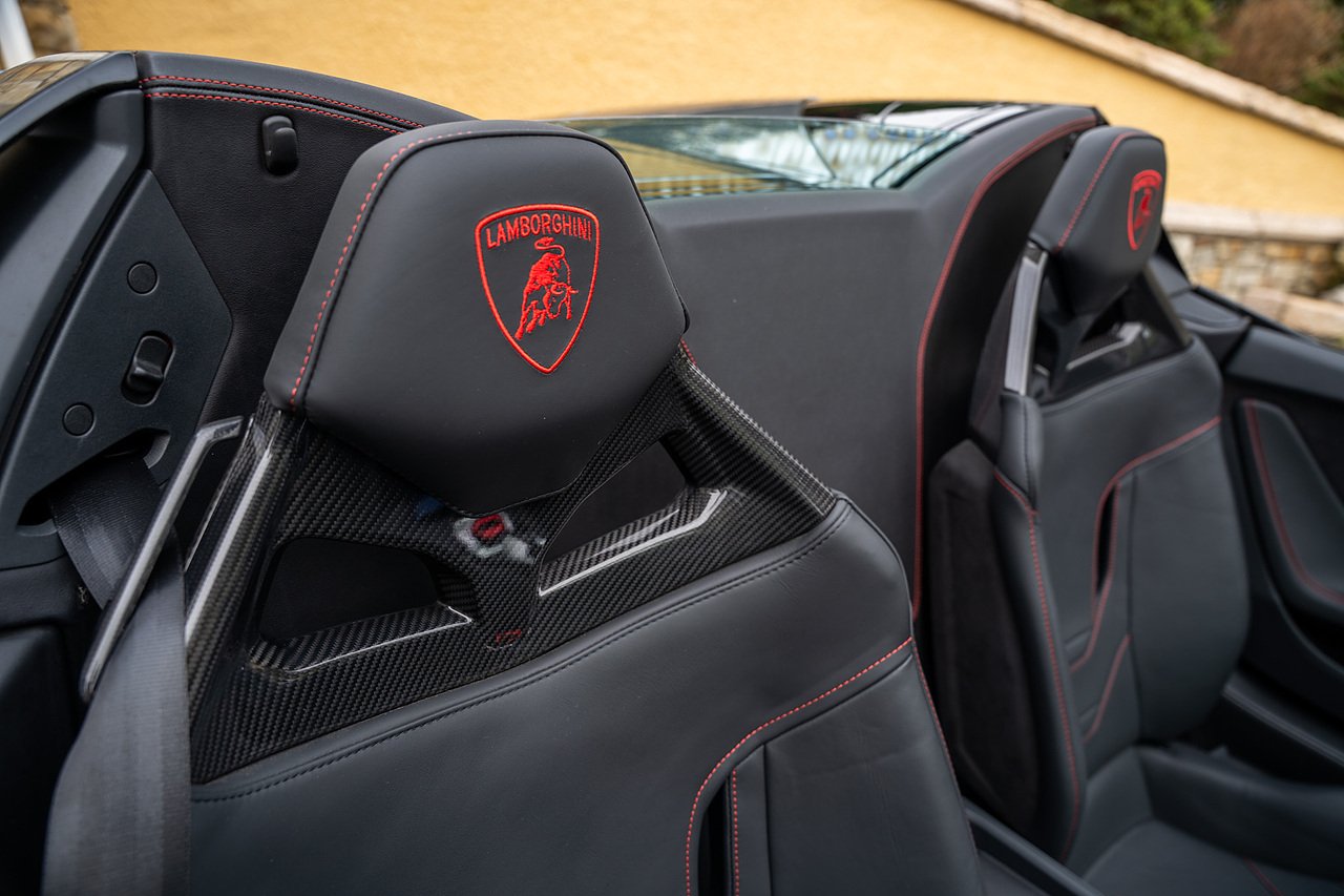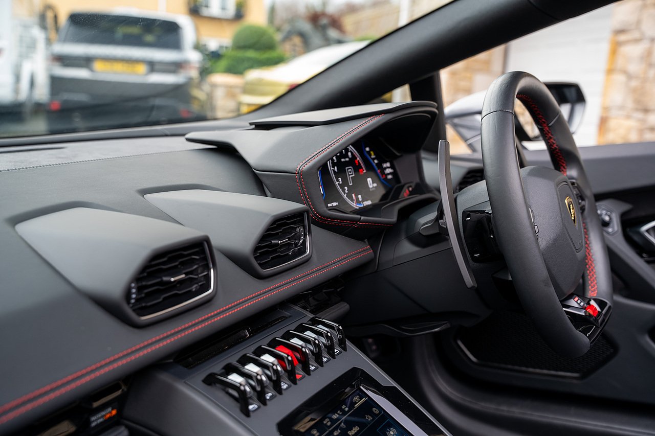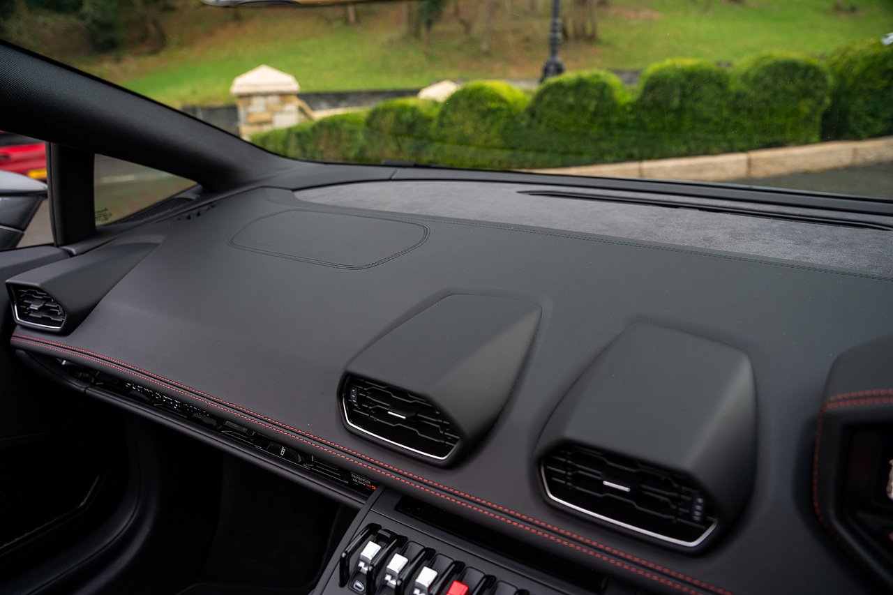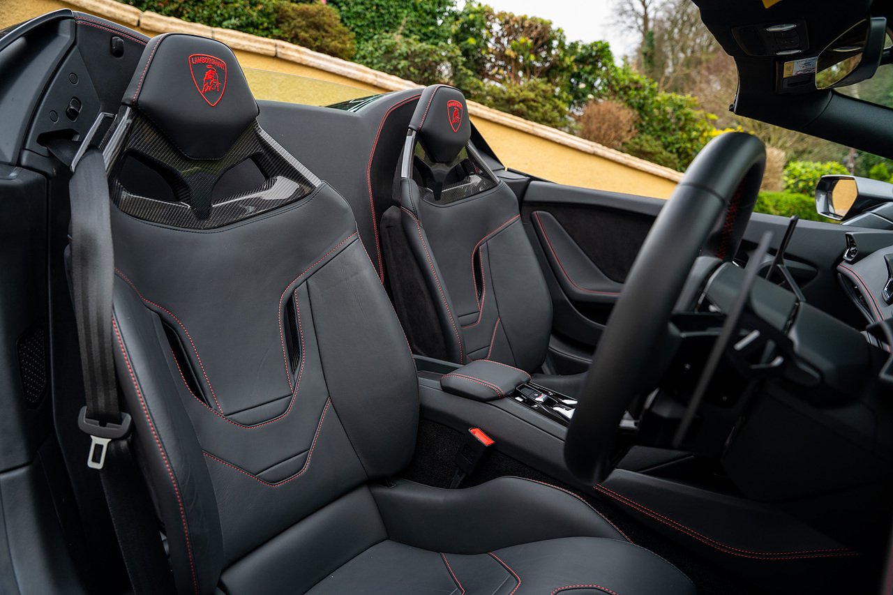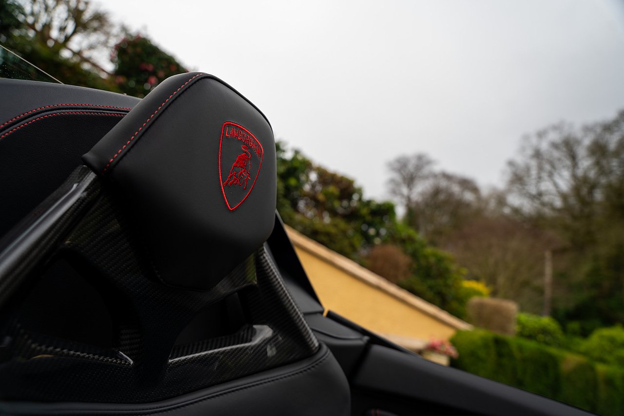 The Specification of this example Includes, The Upgraded Carbon Fibre Evo Race Seats, Front Vehicle Axle lifting system with Magno Rheological Suspension, Style Package with High Gloss Exterior Elements, Rear Reversing Assist Camera with Parking Sensors, Lamborghini Logo Stitched into the Heated Rests in Rosso Red, Apple Car play and connected service Infotainment system, 20" Aesir Alloy wheels in Gloss Black & Polished Face, Black Cloth Roof, Q Citura on Rear parcel shelf with contrast stitch, DAB Radio Tuner, Heated Seats, Electro Chromatic exterior mirrors, Ad Personam CCMR Brake Calipers Painted in Gloss Red , LED Light system, Digital Cockpit display.