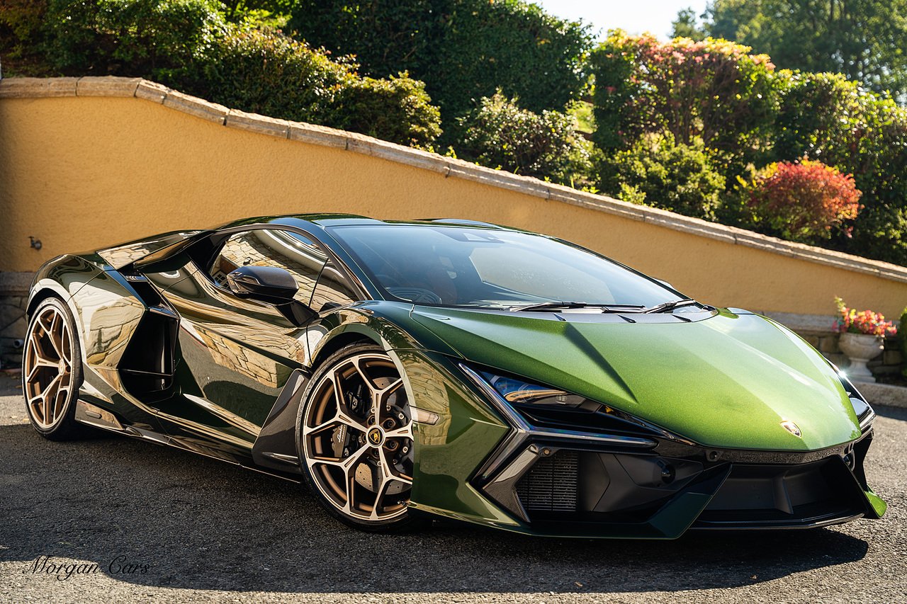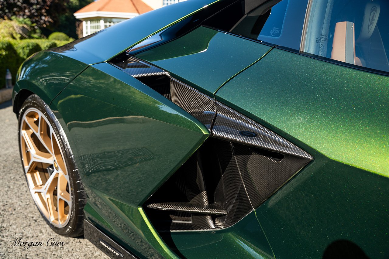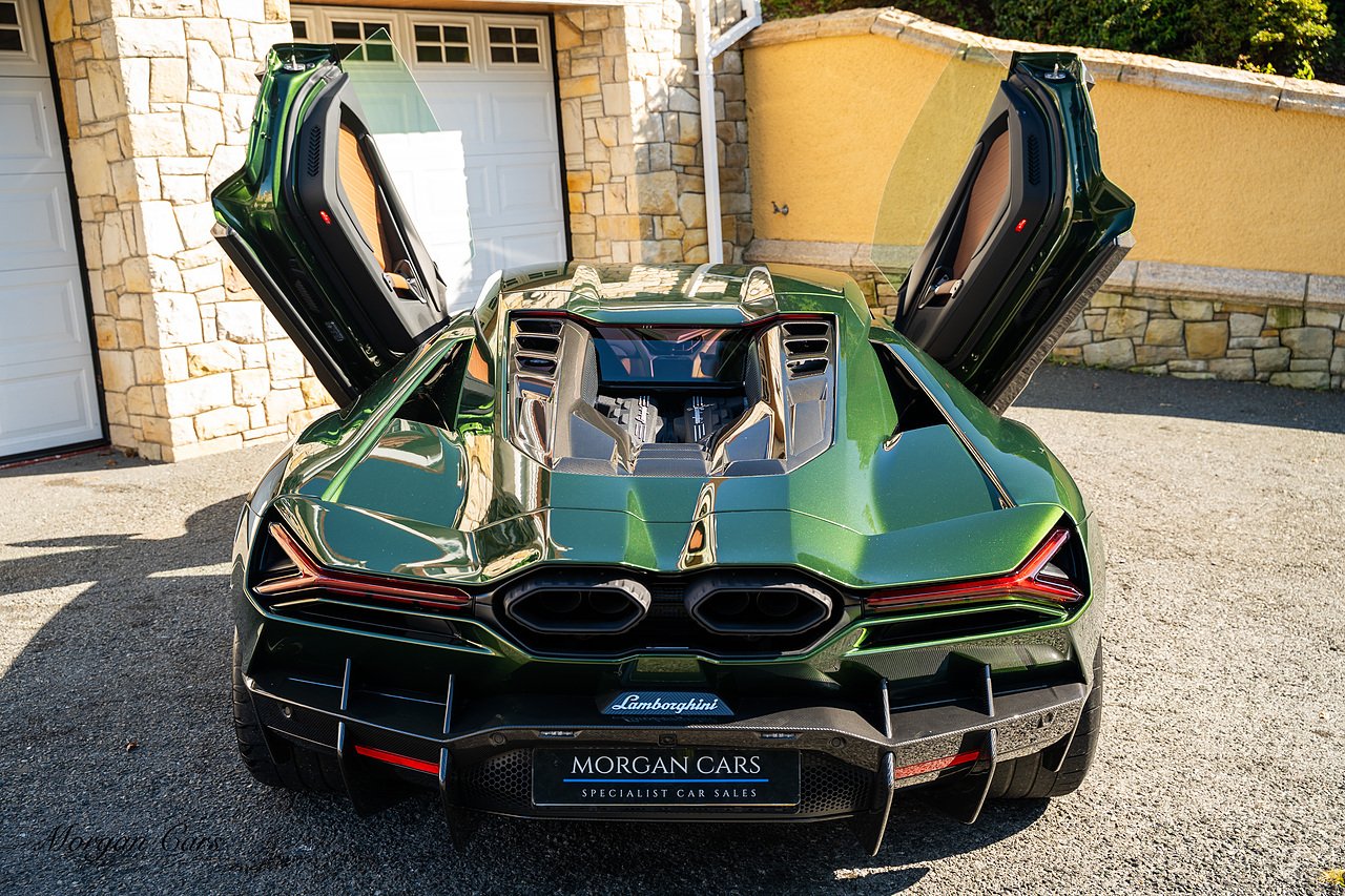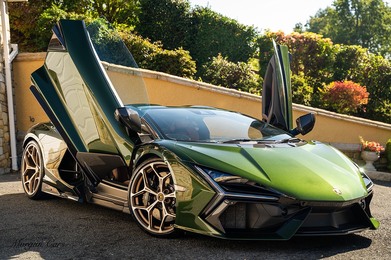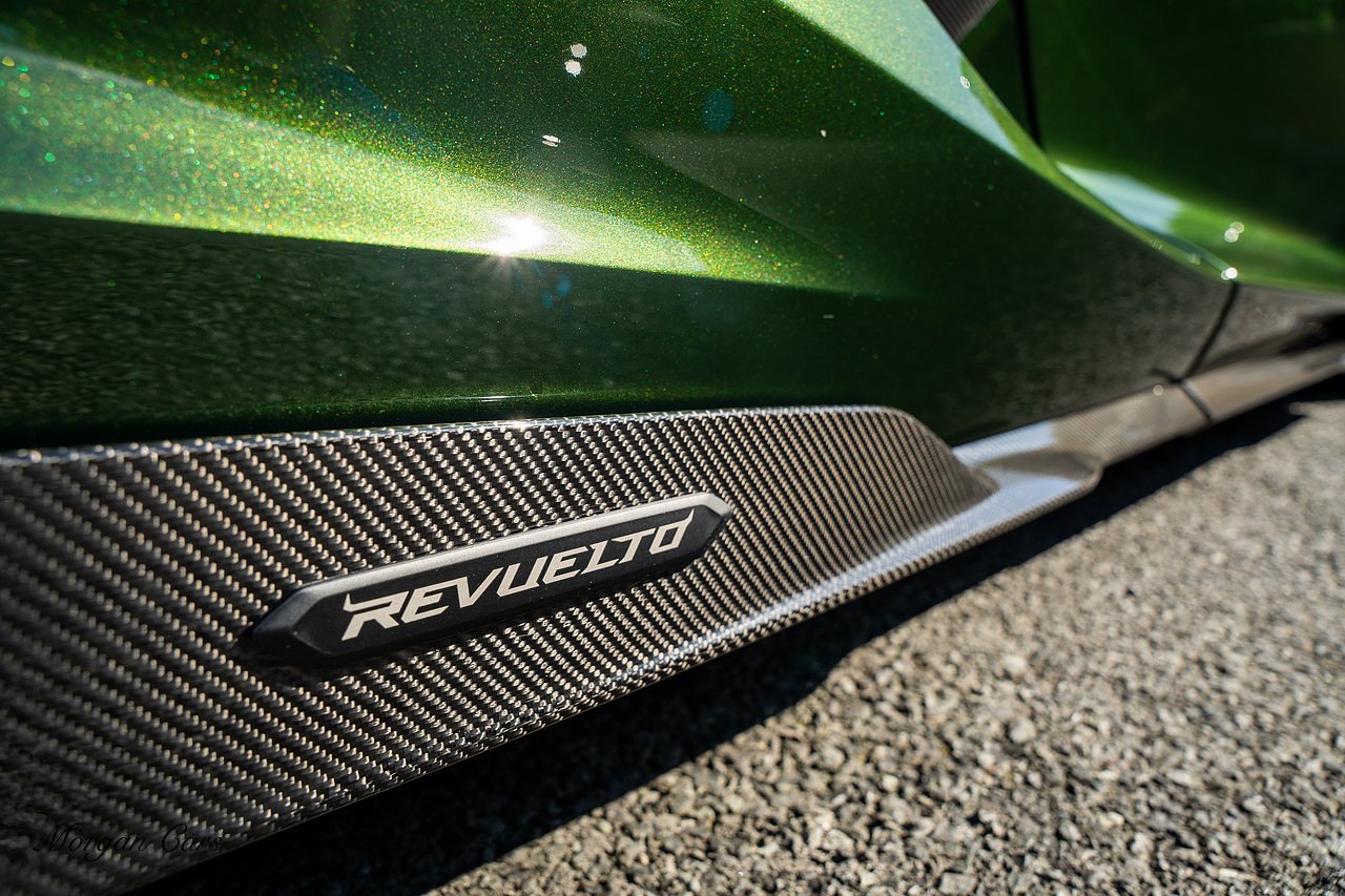 Morgan Cars are proud to present this Stunning Lamborghini Revuelto finished in AD Personam Verdes Ermes Metallic with Full Body Self healing PPF, This Revuelto has Monster Specification which includes full Exterior Carbon Fibre Styling Package with Carbon Fibre engine cover and Additionally the side carbon aero fin in Carbon Fibre , Front Axle Lifting System, Altanero Bronze forged diamond cut alloy wheels 21/22", Full Carbon Fibre interior package, Warranty Extension 5th Year, Headlamps Package, Full Electric Heated seats, Q-Citura on Roof, Exhaust Tailpipes in Satin Black, Rear Reversing Assist camera, Passenger Display, Cupholders package, Lamborghini Embroidery on Headrests, Matt Carbon fibre steering wheel with red 12 O'clock insert,Contrast Stitching in Bronzo Oreadi.