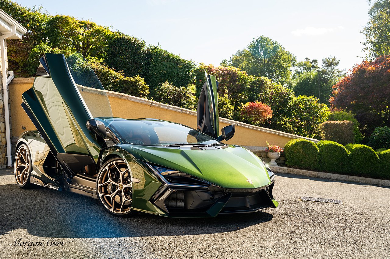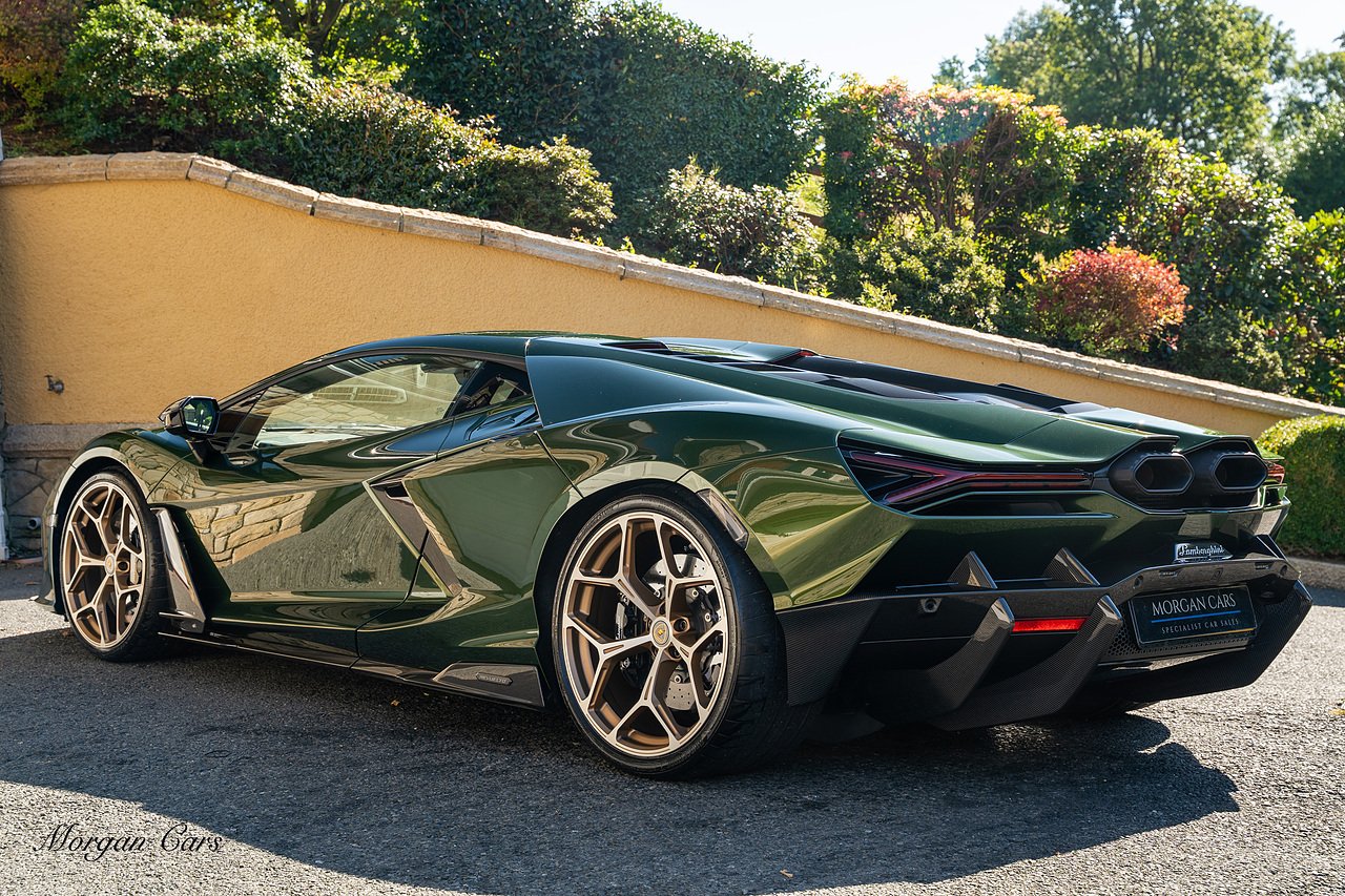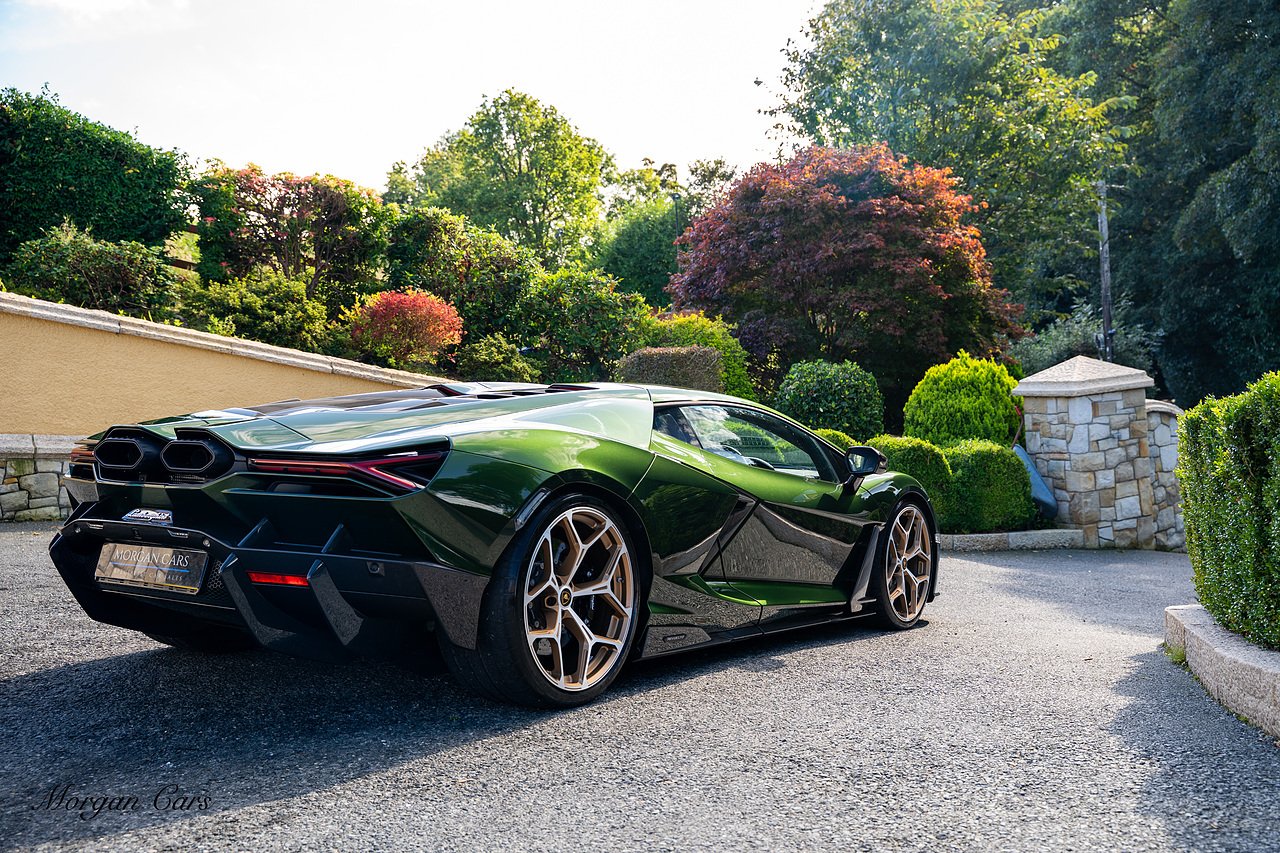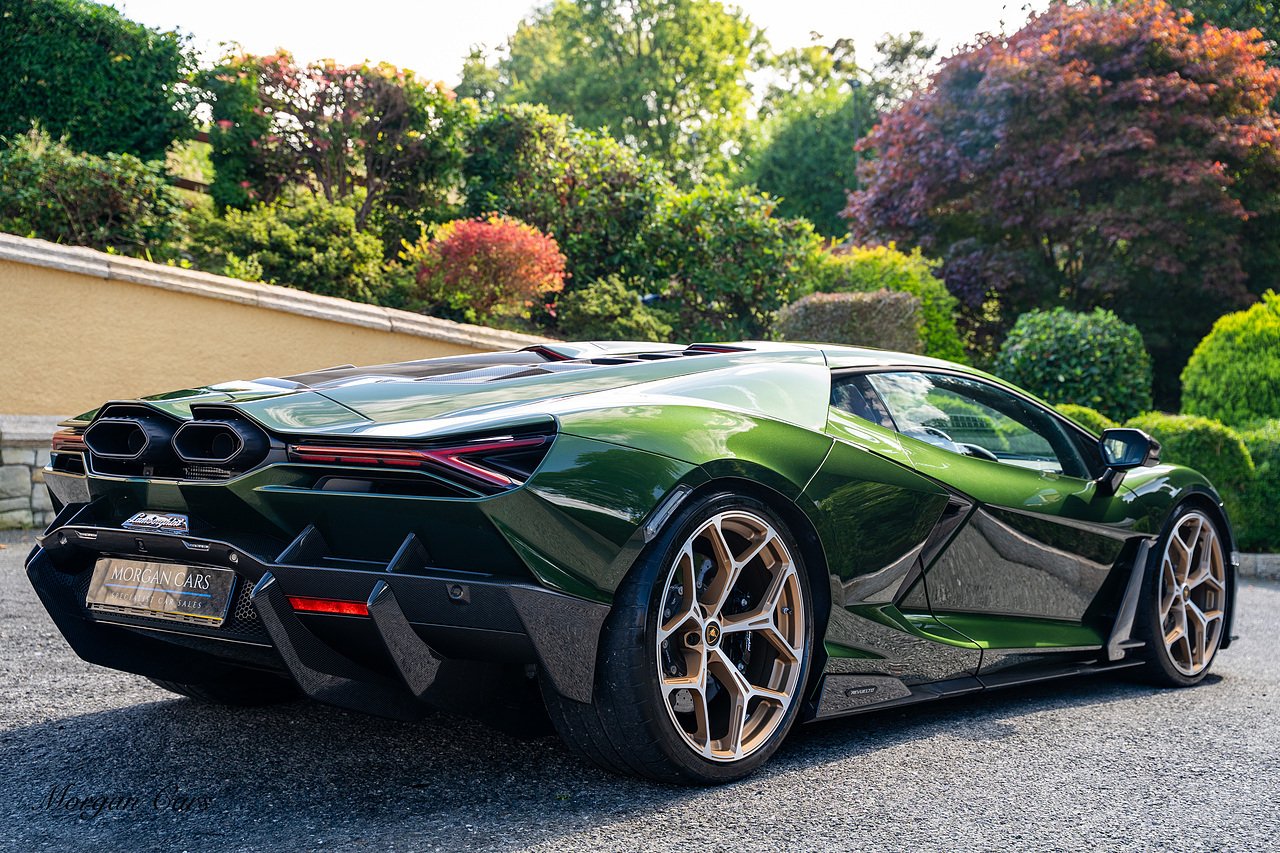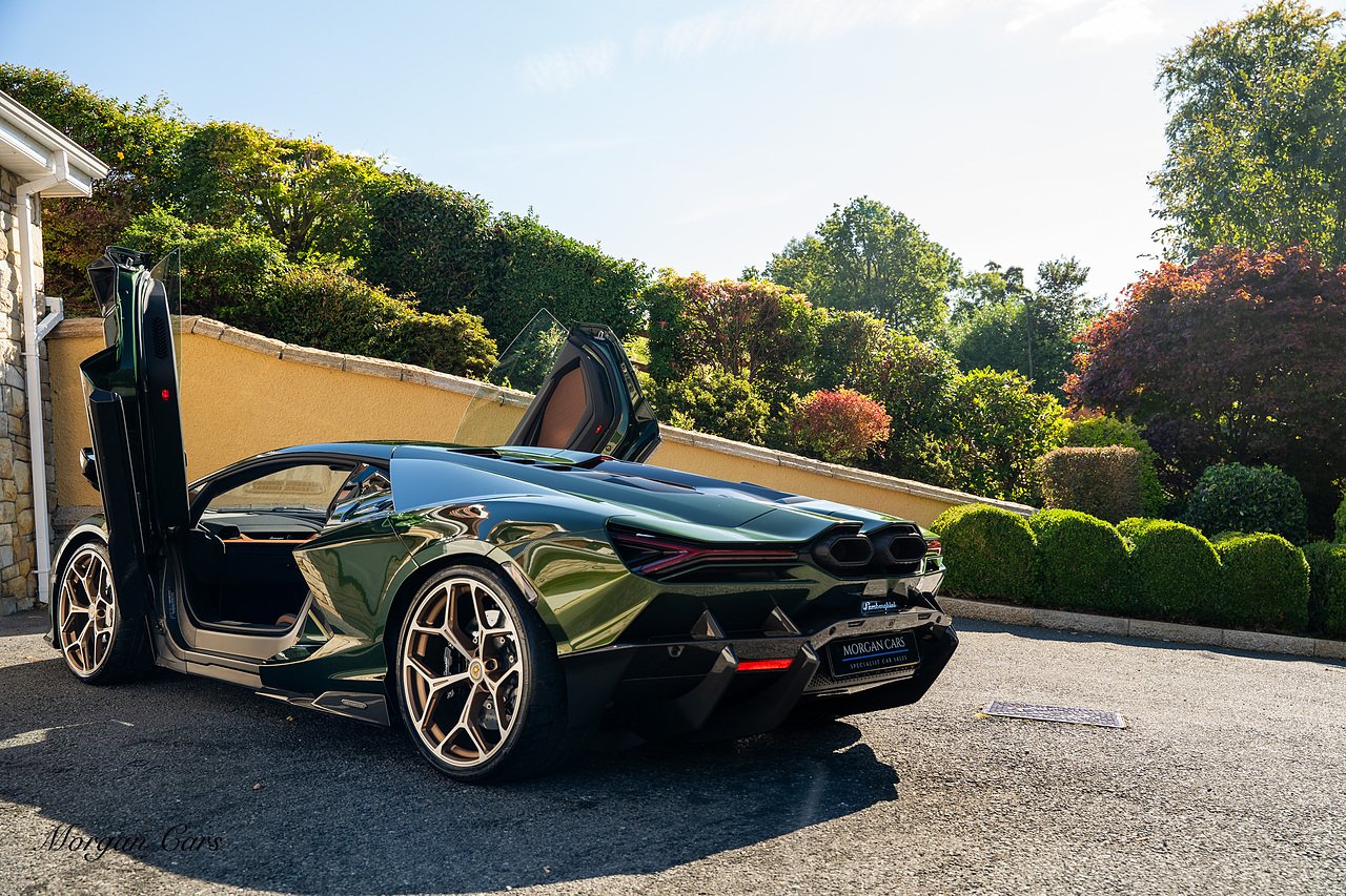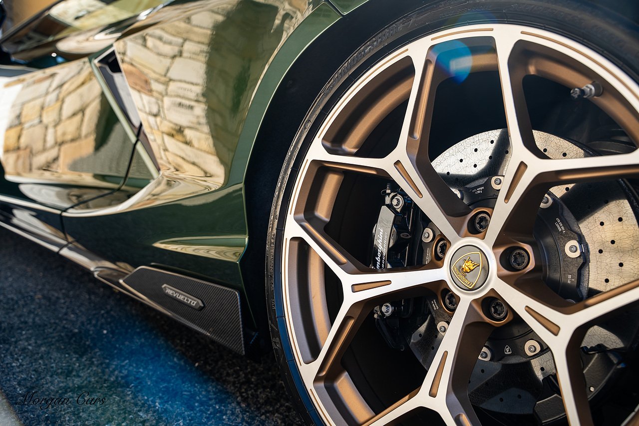 Morgan Cars are proud to present this Stunning Lamborghini Revuelto finished in AD Personam Verdes Ermes Metallic with Full Body Self healing PPF, This Revuelto has Monster Specification which includes full Exterior Carbon Fibre Styling Package with Carbon Fibre engine cover and Additionally the side carbon aero fin in Carbon Fibre , Front Axle Lifting System, Altanero Bronze forged diamond cut alloy wheels 21/22", Full Carbon Fibre interior package, Warranty Extension 5th Year, Headlamps Package, Full Electric Heated seats, Q-Citura on Roof, Exhaust Tailpipes in Satin Black, Rear Reversing Assist camera, Passenger Display, Cupholders package, Lamborghini Embroidery on Headrests, Matt Carbon fibre steering wheel with red 12 O'clock insert,Contrast Stitching in Bronzo Oreadi.