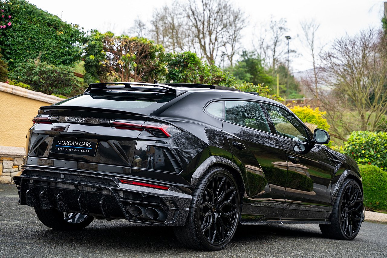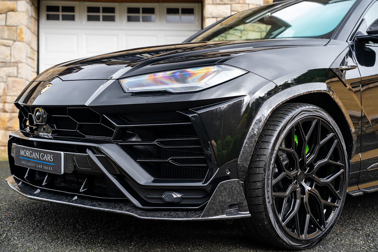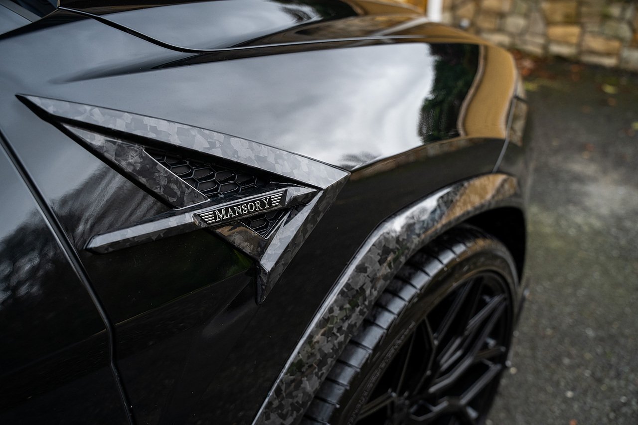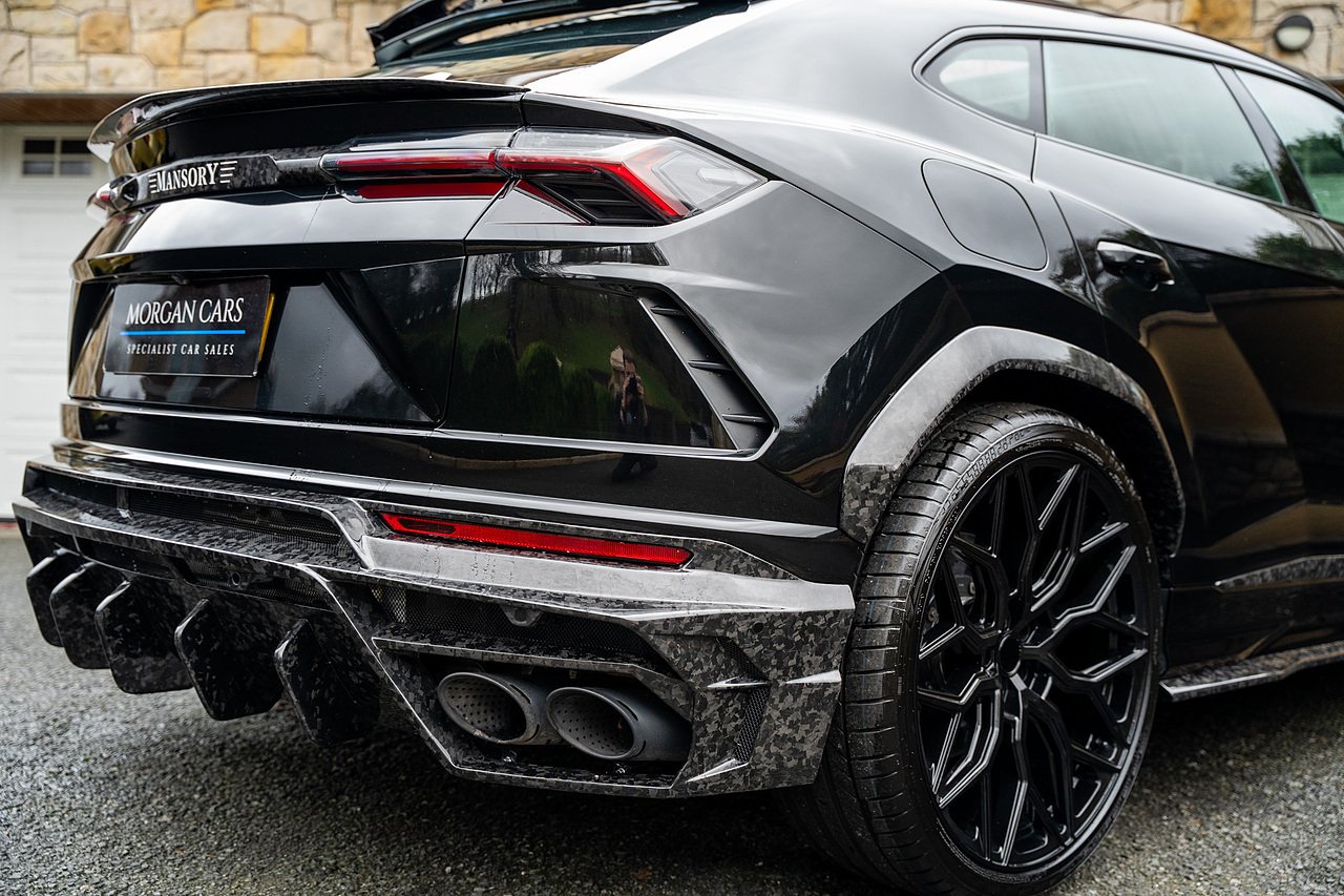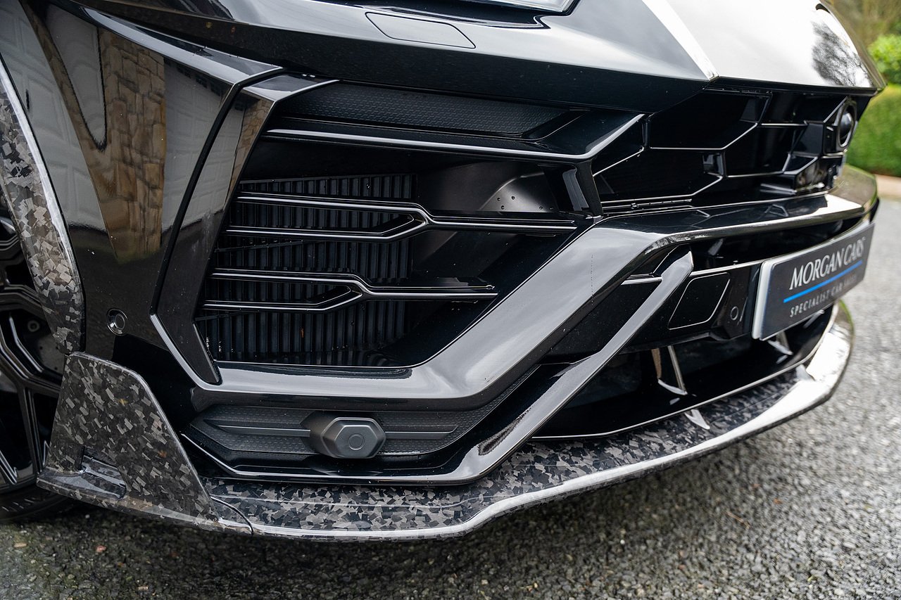 This Lamborghini Urus features a Massive Specification list Complete Mansory Forged Carbon Fibre Exterior Body Kit which involves, Lower Front Splitter, Side Extensions and Side Moulding, Side Vents with Mansory Logo, Wing Mirrors, Complete Rear Diffuser, Upper Boot Spoiler and Upgraded Spoiler, Optional Extra 24" Gloss Black Vossen Style Alloy Wheels In Gloss Black, Full ADAS Package With Heads Up Display, Bang & Olufson Sound System, Panoramic Glass Sunroof | Q Citura Interior in Verde Green, Front Ventilated and Heated seats with Massage Function, Top View Reversing Camera System, Green Painted Brake Calipers, Anima with off road Modes | LED Adaptive headlights | Radar Guided Adaptive Cruise Control, DAB Radio Tuner, Branding Package, Lamborghini LED Headlight, Lamborghini Embroided Headrests in Verde, Gloss Black interior trims, Leather Steering wheel with 12 O'Clock Marker.