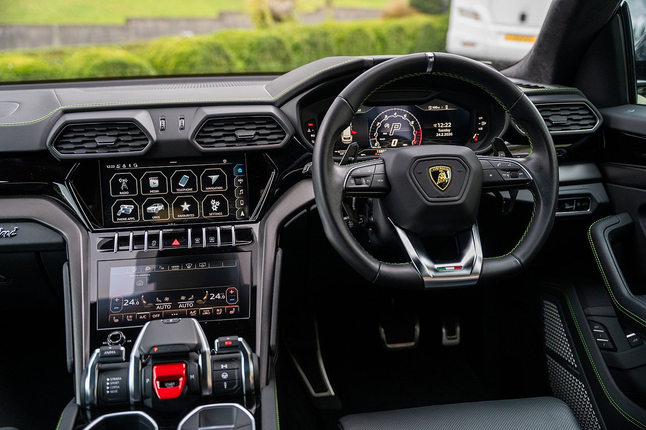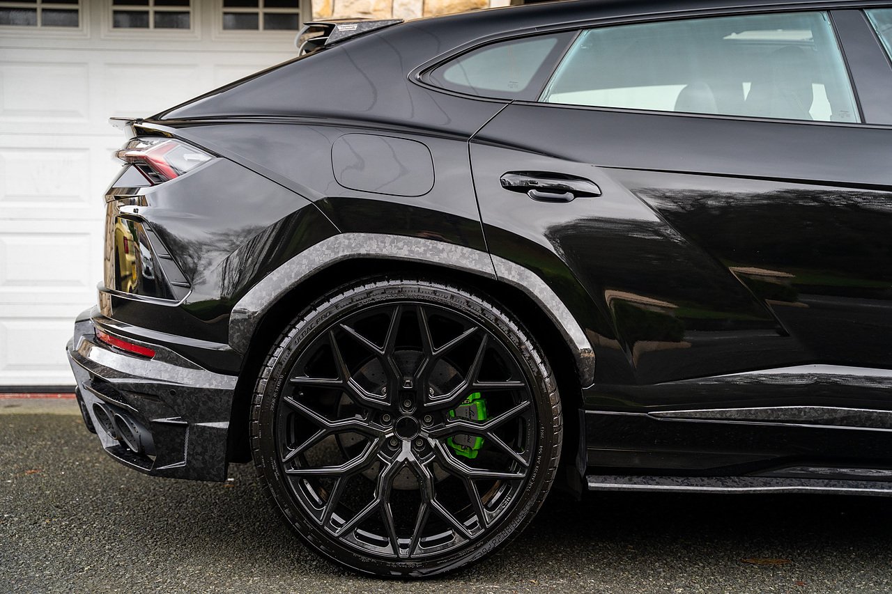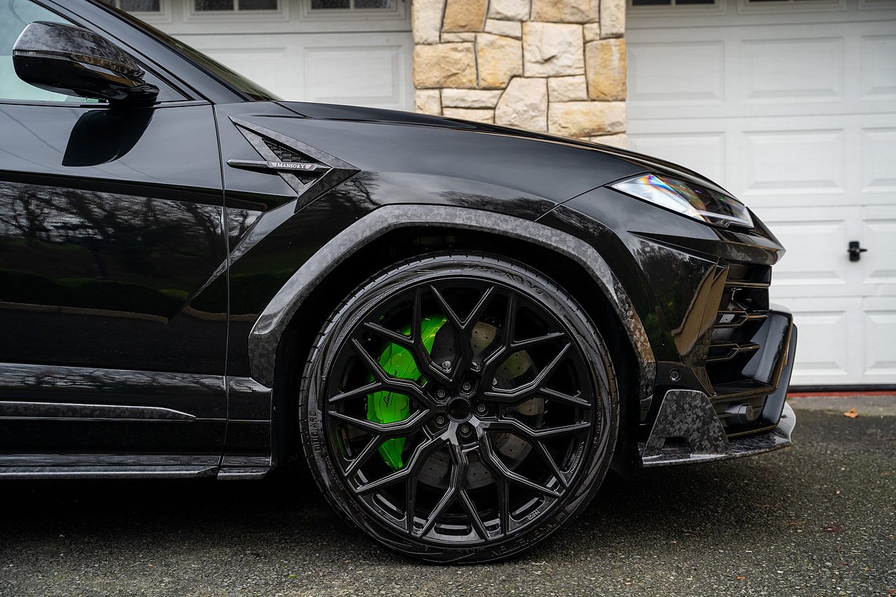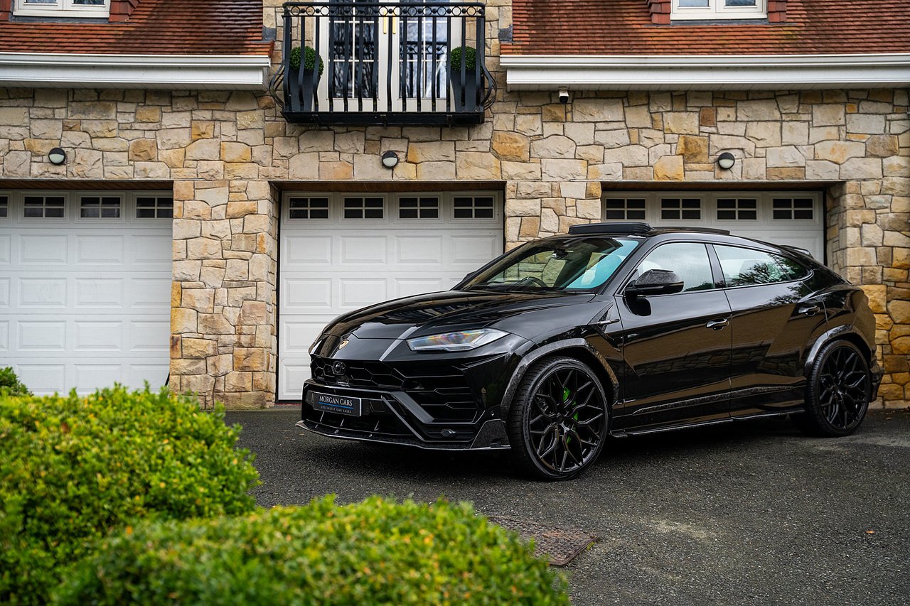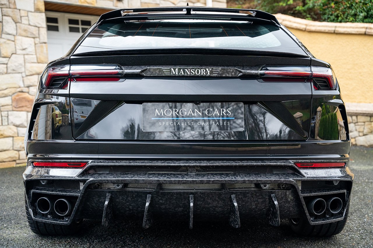 This Lamborghini Urus features a Massive Specification list Complete Mansory Forged Carbon Fibre Exterior Body Kit which involves, Lower Front Splitter, Side Extensions and Side Moulding, Side Vents with Mansory Logo, Wing Mirrors, Complete Rear Diffuser, Upper Boot Spoiler and Upgraded Spoiler, Optional Extra 24" Gloss Black Vossen Style Alloy Wheels In Gloss Black, Full ADAS Package With Heads Up Display, Bang & Olufson Sound System, Panoramic Glass Sunroof | Q Citura Interior in Verde Green, Front Ventilated and Heated seats with Massage Function, Top View Reversing Camera System, Green Painted Brake Calipers, Anima with off road Modes | LED Adaptive headlights | Radar Guided Adaptive Cruise Control, DAB Radio Tuner, Branding Package, Lamborghini LED Headlight, Lamborghini Embroided Headrests in Verde, Gloss Black interior trims, Leather Steering wheel with 12 O'Clock Marker.