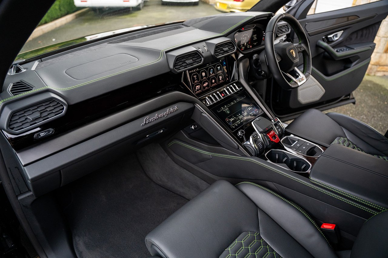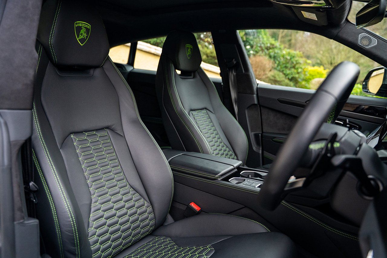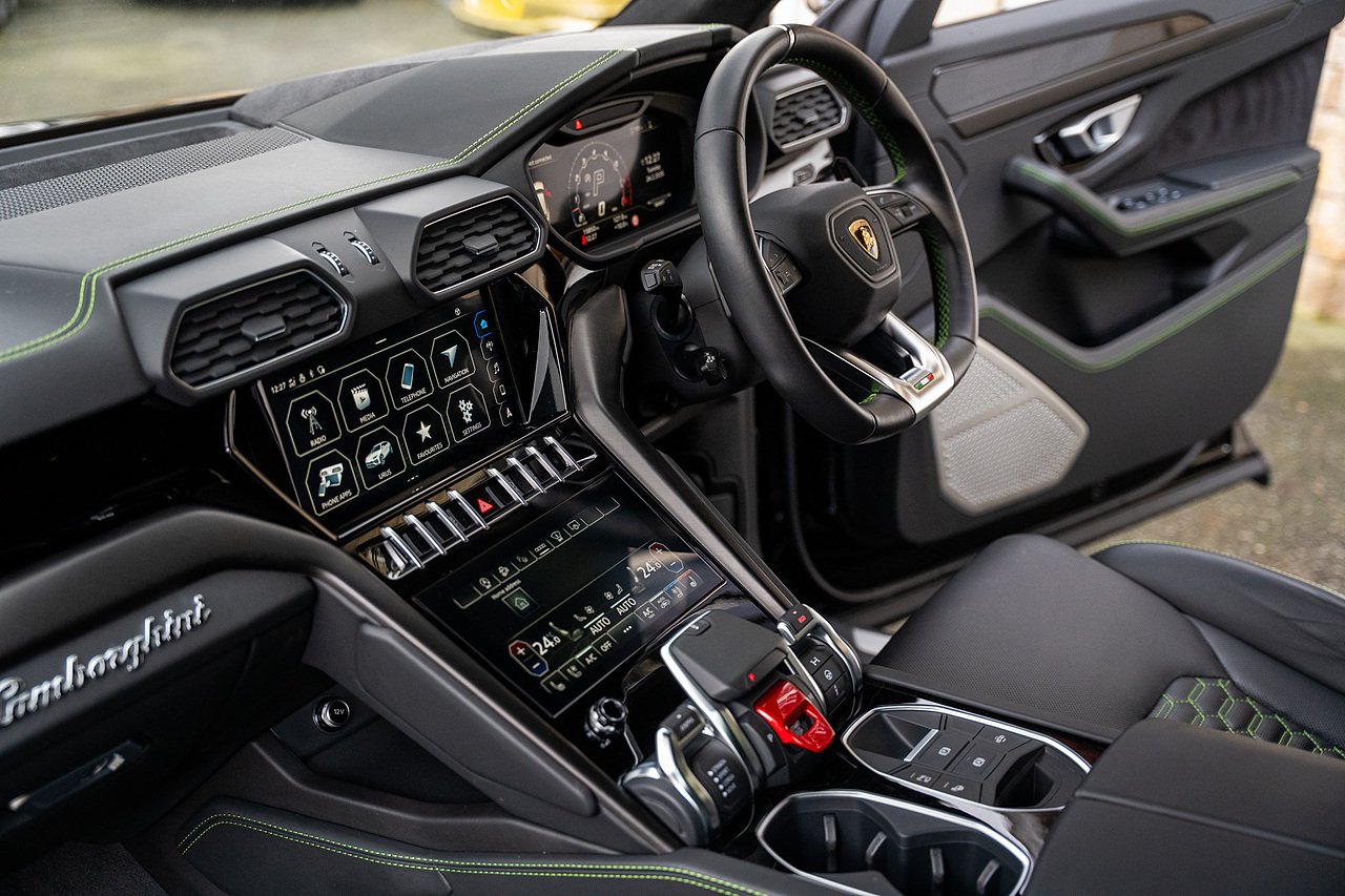 Morgan Cars are Proud to Present this Massive Spec Lamborghini Urus Finished in Nero Helene with Full Black leather interior and Verde Green Stitching with Gloss Black Interior Trim.