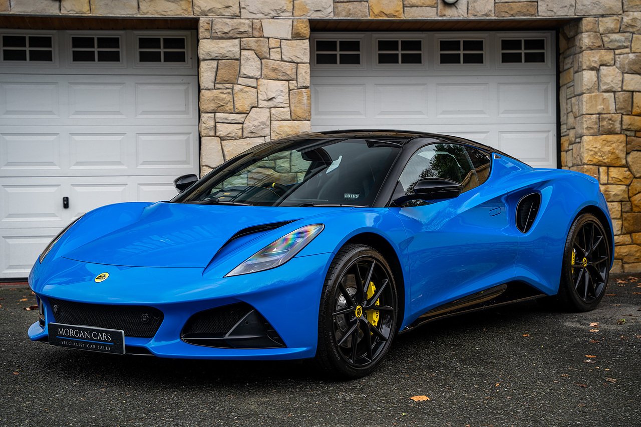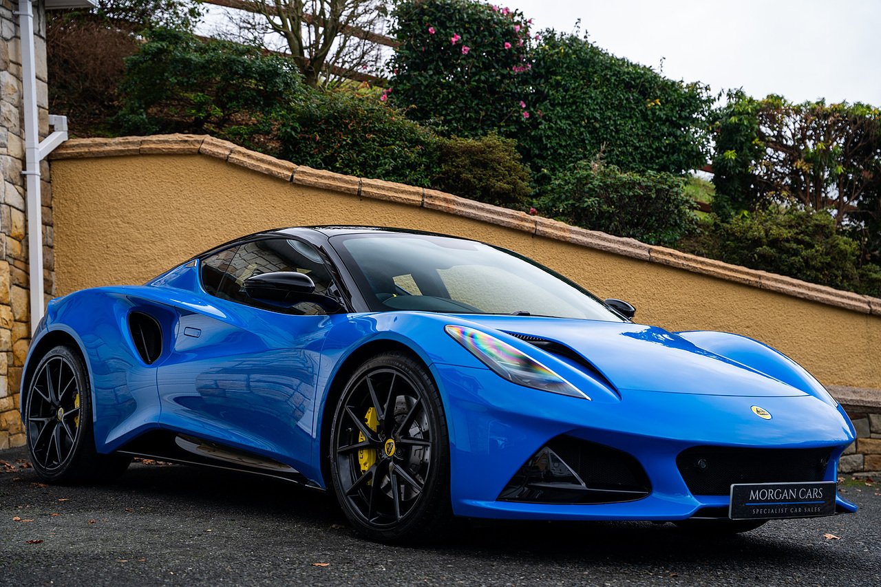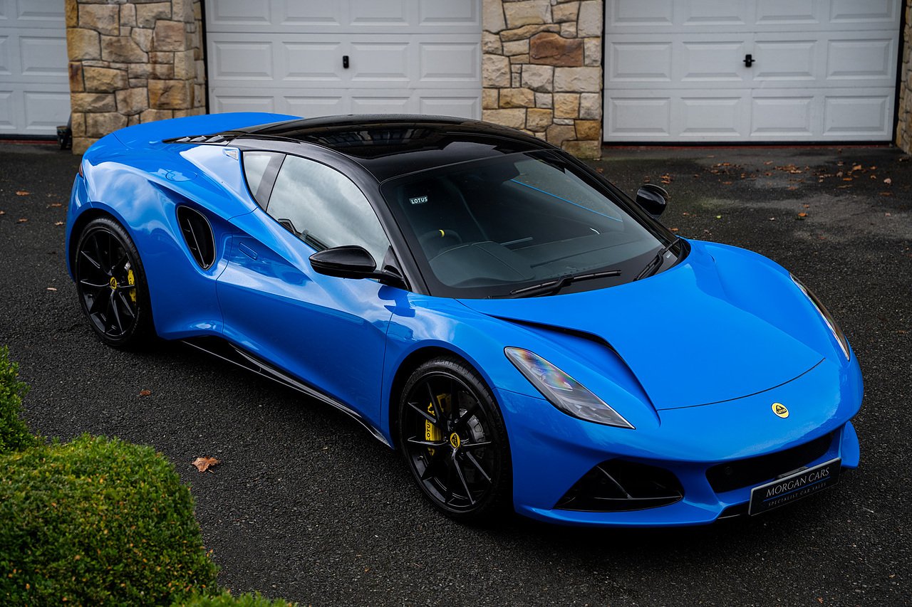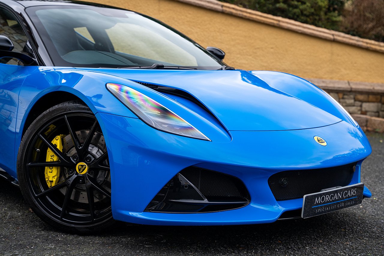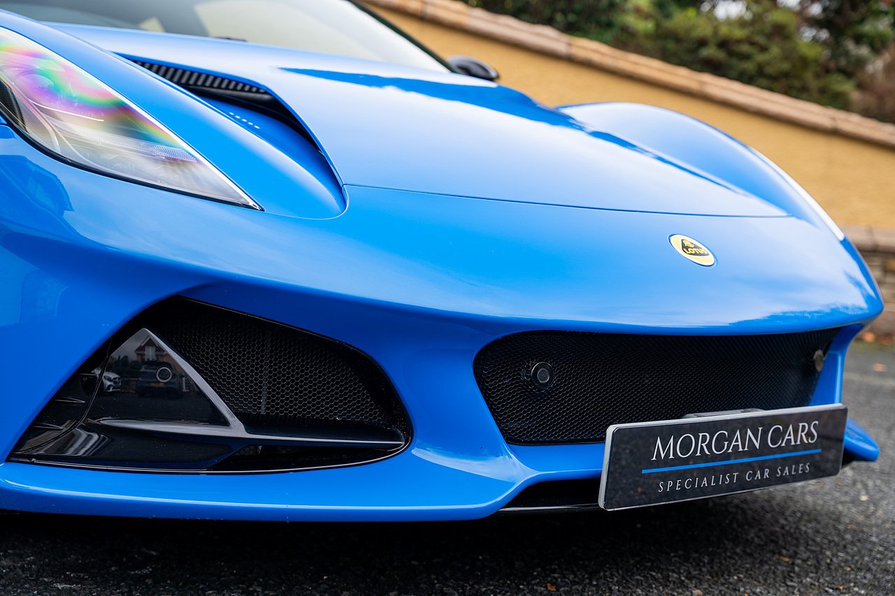 Morgan Cars are Proud To Present our Lotus Emira First Edition, Finished in Senaca Blue metallic and contrasting Alcantara and Black Leather Interior with Yellow Stitching and Pipping Elements.