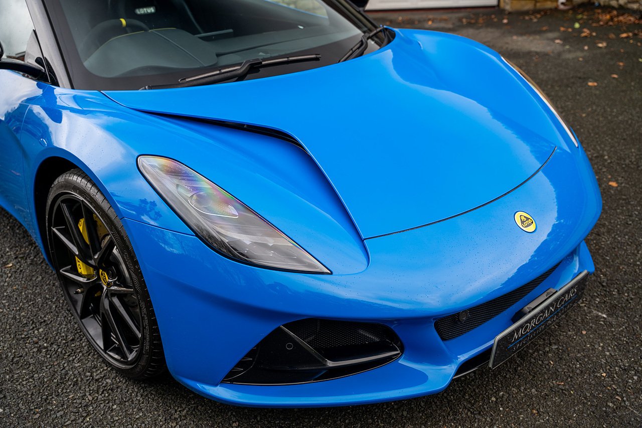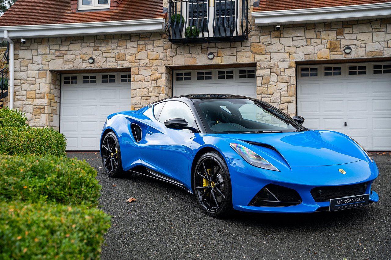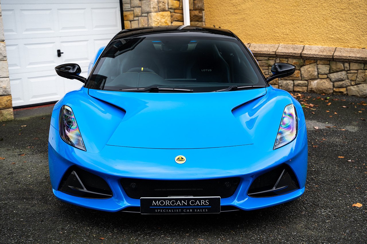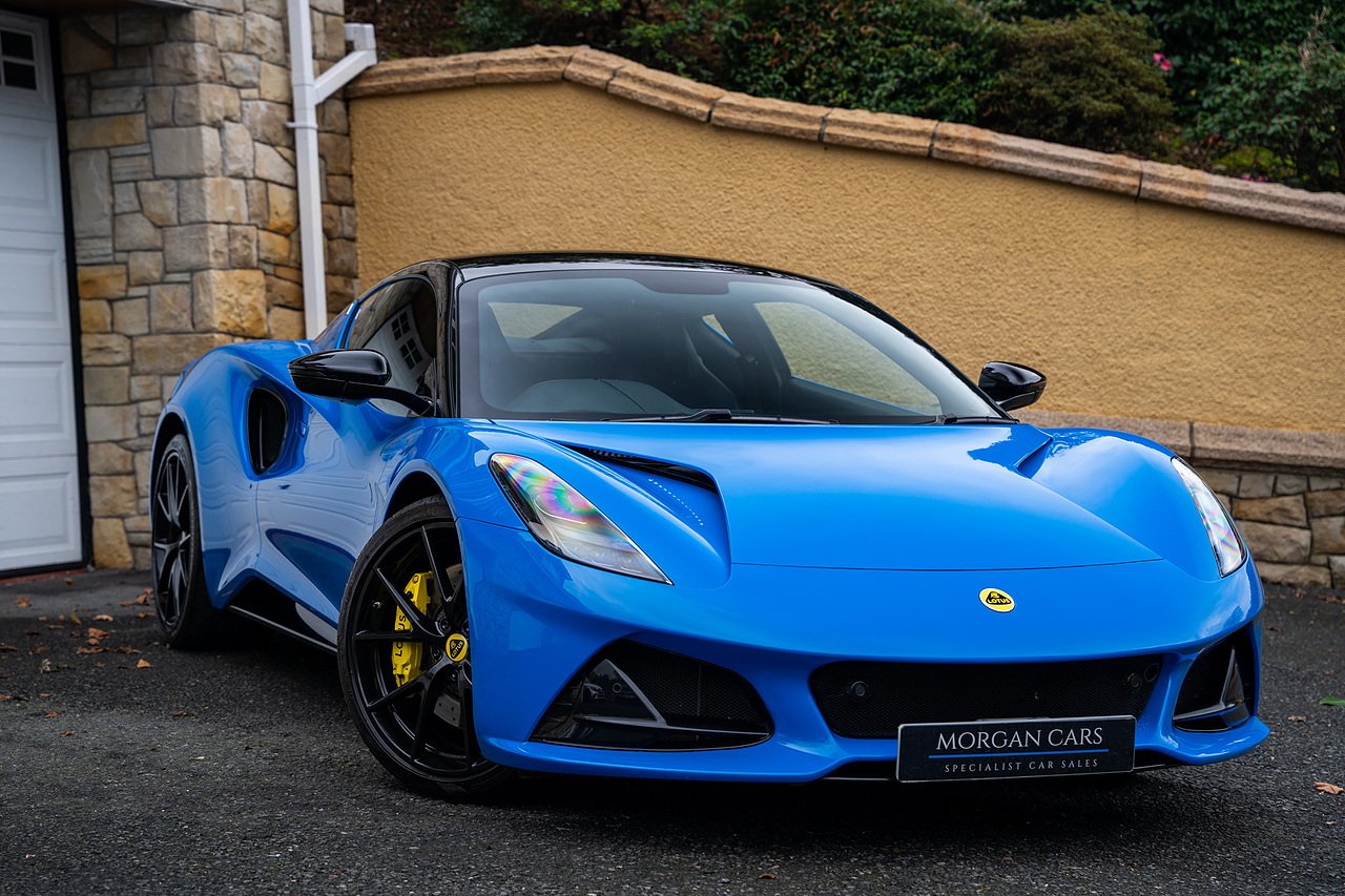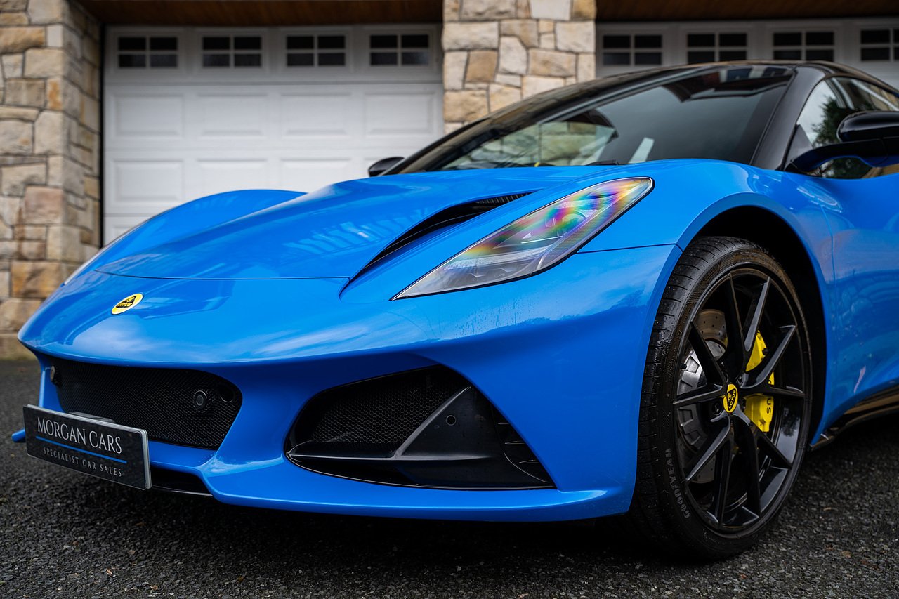 Morgan Cars are Proud To Present our Lotus Emira First Edition, Finished in Senaca Blue metallic and contrasting Alcantara and Black Leather Interior with Yellow Stitching and Pipping Elements.