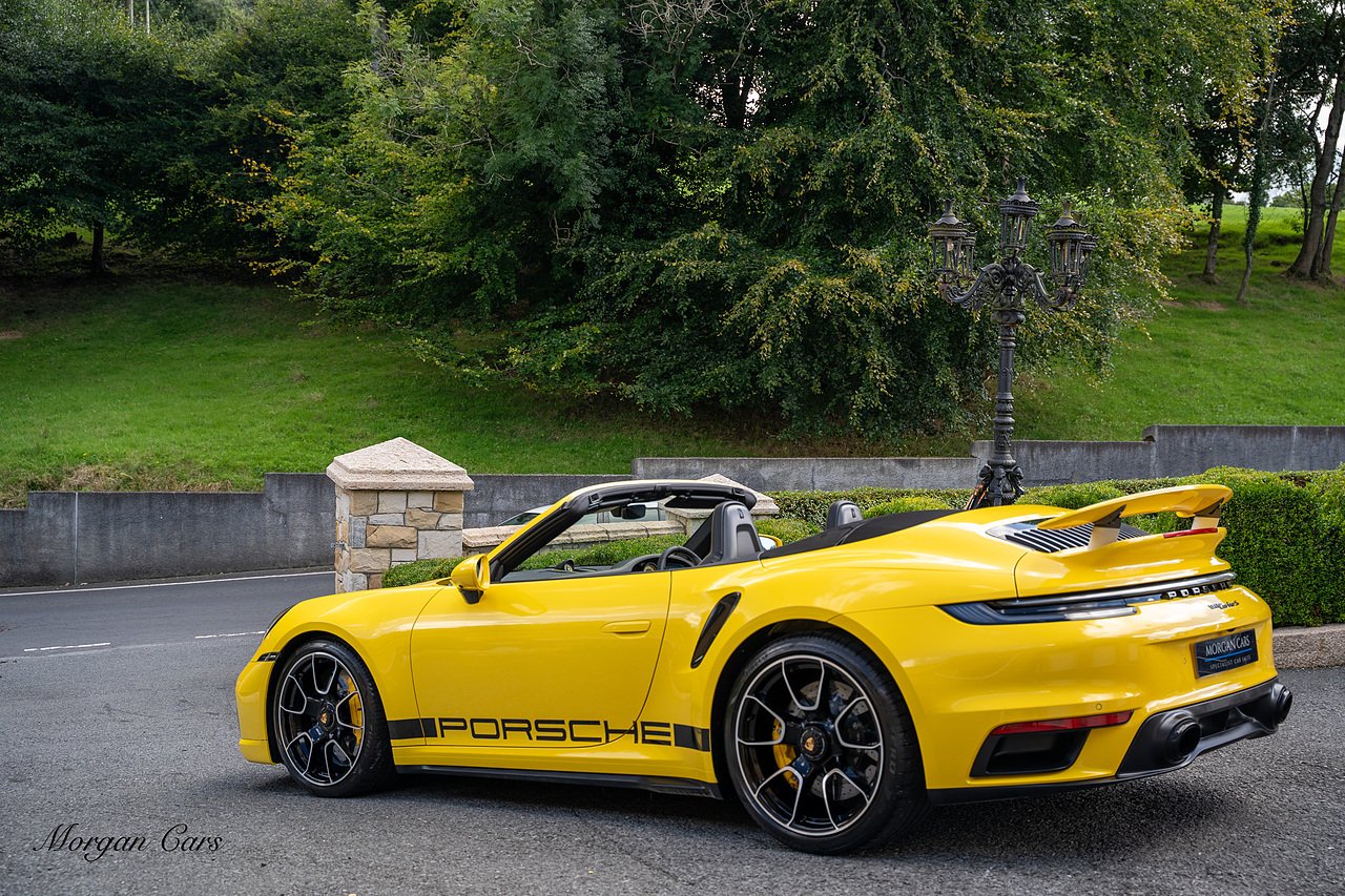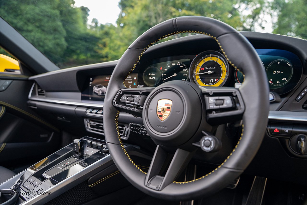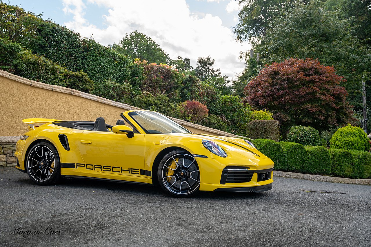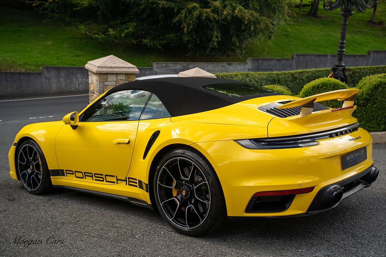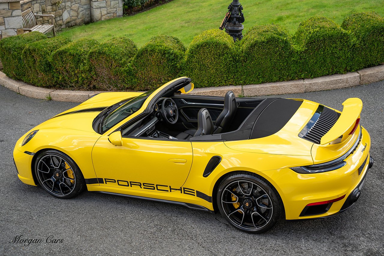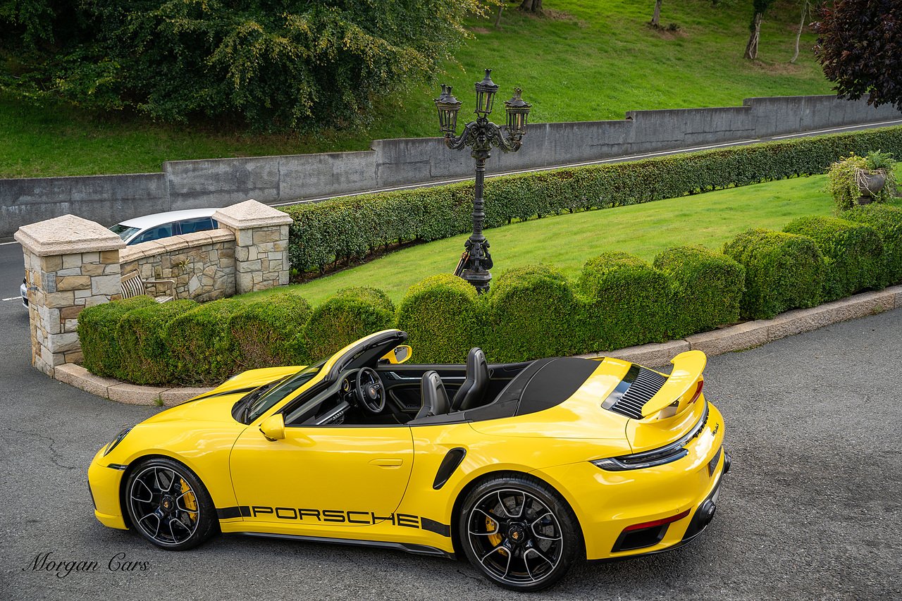 Morgan Cars are proud to present this Huge Spec Porsche 992 Turbo S finished in Racing Yellow with full Black smooth finish leather interior, Specification is Fantastic on this Turbo S and includes LED Matrix headlights in Black with Porsche Dynamic light system plus, Front Axle Lifting System, 18 Way adaptive Memory front sports seats, Bose Sound System, Akrapovic Titanium Sports Exhaust system, Front end Paint Protection Film , 20/21" Porsche exclusive design alloy wheels, Interior package in contrasting Racing yellow stitching, Adaptive Cruise Control, Porsche Motorsport Side Decals and Porsche Bonnet Stripe in Gloss Black, Surround View Camera system, Lane change assist, Heated GT Sports steering wheel, Power steering plus, Model designation on rear in gloss black, Exclusive Design Tail lights, Ambient interior lighting, Chrono dial in Racing yellow, Central Tachometer in Racing Yellow, Rear Axle steering, Porsche Dynamic chassis control Sport, Interior trim inlays in Aluminium.