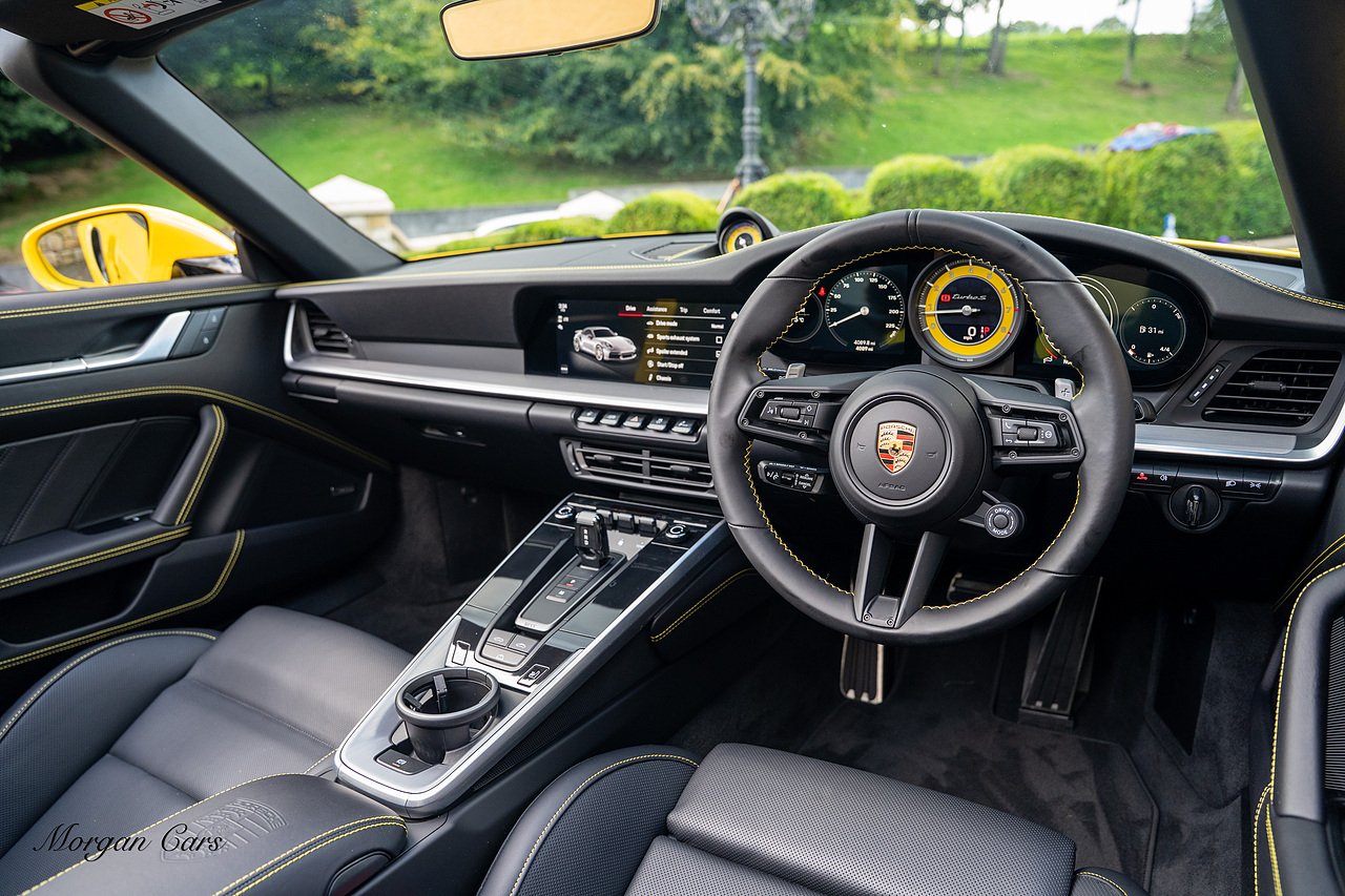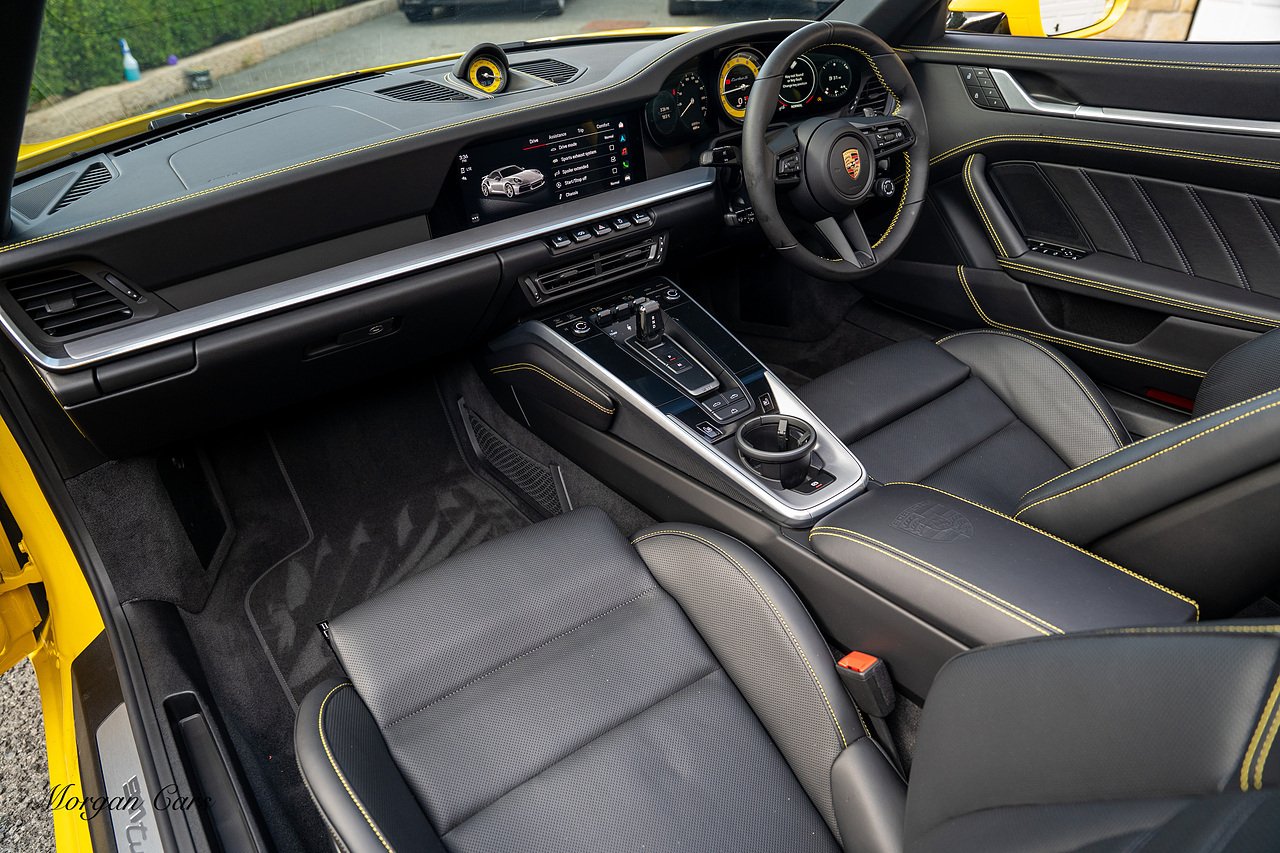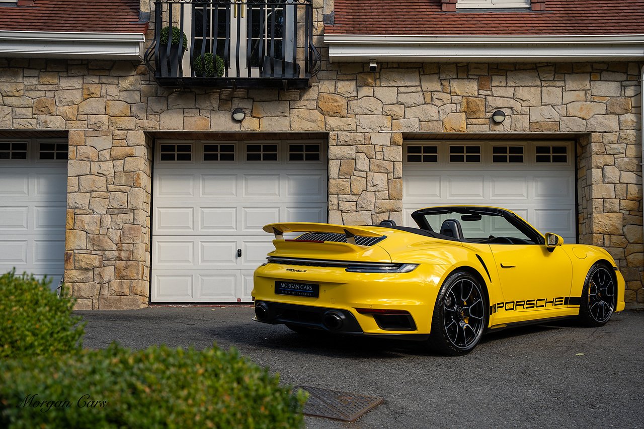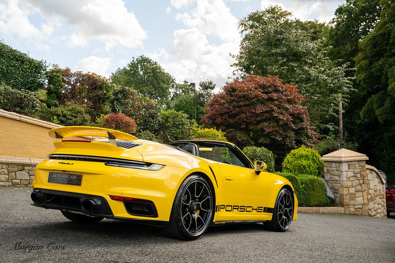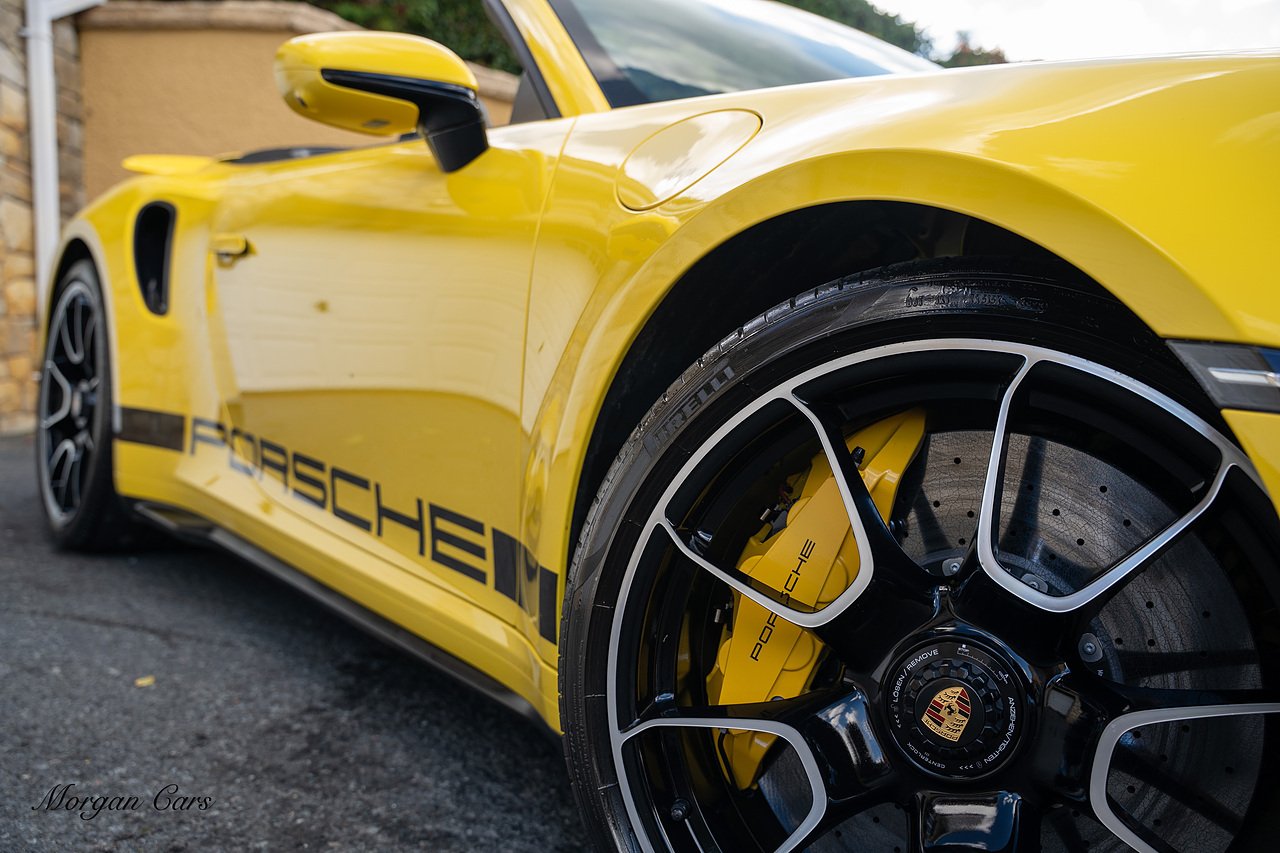 Morgan Cars are proud to present this Huge Spec Porsche 992 Turbo S finished in Racing Yellow with full Black smooth finish leather interior, Specification is Fantastic on this Turbo S and includes LED Matrix headlights in Black with Porsche Dynamic light system plus, Front Axle Lifting System, 18 Way adaptive Memory front sports seats, Bose Sound System, Akrapovic Titanium Sports Exhaust system, Front end Paint Protection Film , 20/21" Porsche exclusive design alloy wheels, Interior package in contrasting Racing yellow stitching, Adaptive Cruise Control, Porsche Motorsport Side Decals and Porsche Bonnet Stripe in Gloss Black, Surround View Camera system, Lane change assist, Heated GT Sports steering wheel, Power steering plus, Model designation on rear in gloss black, Exclusive Design Tail lights, Ambient interior lighting, Chrono dial in Racing yellow, Central Tachometer in Racing Yellow, Rear Axle steering, Porsche Dynamic chassis control Sport, Interior trim inlays in Aluminium.