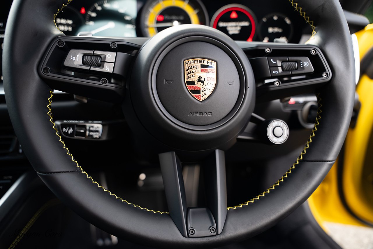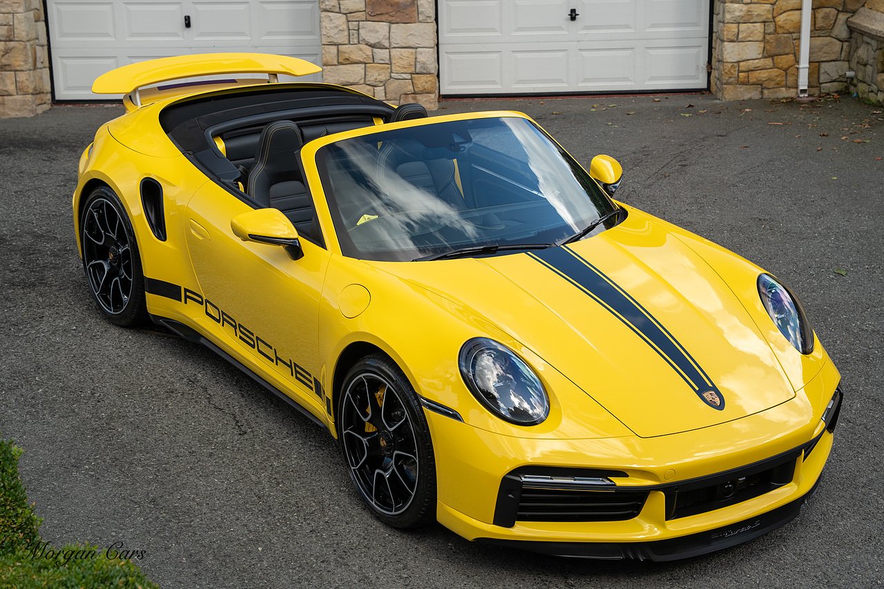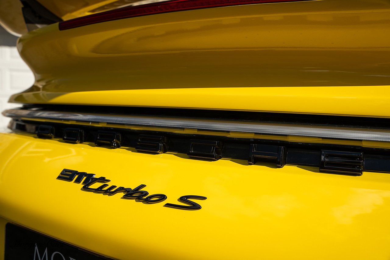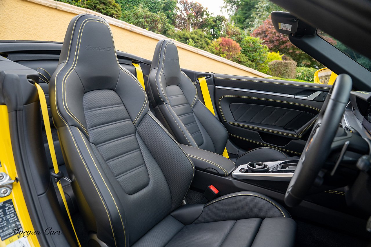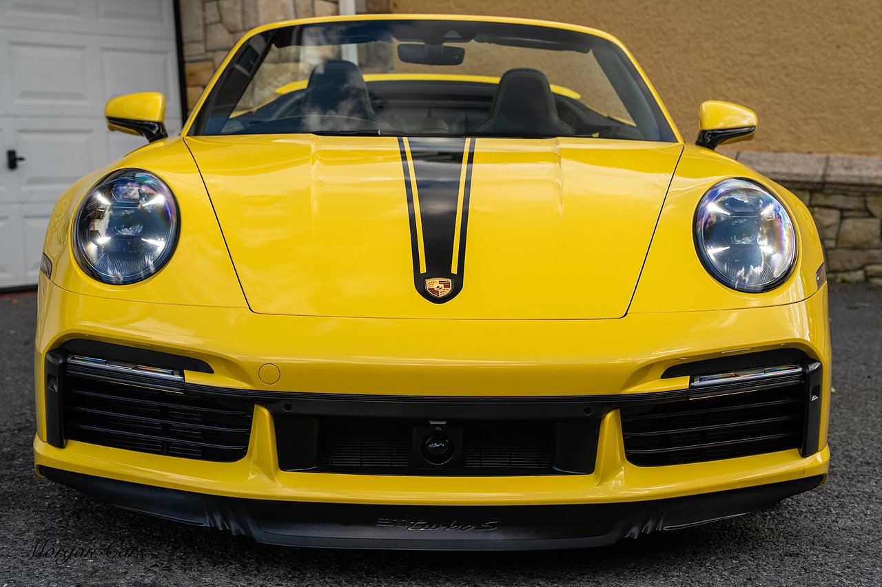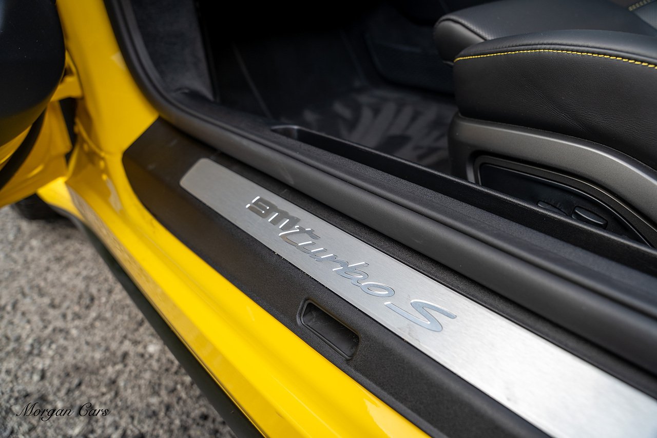 Morgan Cars are proud to present this Huge Spec Porsche 992 Turbo S finished in Racing Yellow with full Black smooth finish leather interior, Specification is Fantastic on this Turbo S and includes LED Matrix headlights in Black with Porsche Dynamic light system plus, Front Axle Lifting System, 18 Way adaptive Memory front sports seats, Bose Sound System, Akrapovic Titanium Sports Exhaust system, Front end Paint Protection Film , 20/21" Porsche exclusive design alloy wheels, Interior package in contrasting Racing yellow stitching, Adaptive Cruise Control, Porsche Motorsport Side Decals and Porsche Bonnet Stripe in Gloss Black, Surround View Camera system, Lane change assist, Heated GT Sports steering wheel, Power steering plus, Model designation on rear in gloss black, Exclusive Design Tail lights, Ambient interior lighting, Chrono dial in Racing yellow, Central Tachometer in Racing Yellow, Rear Axle steering, Porsche Dynamic chassis control Sport, Interior trim inlays in Aluminium.