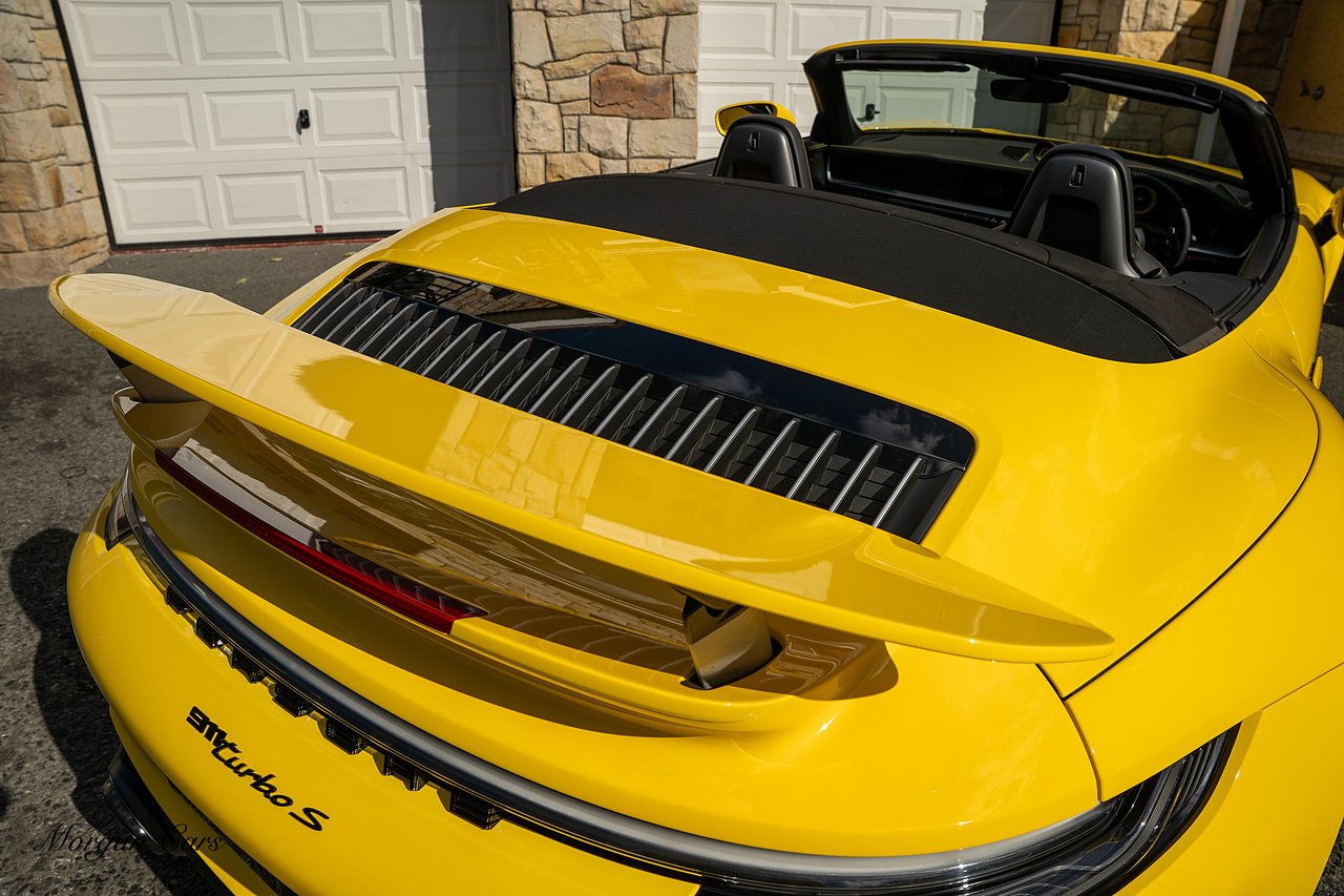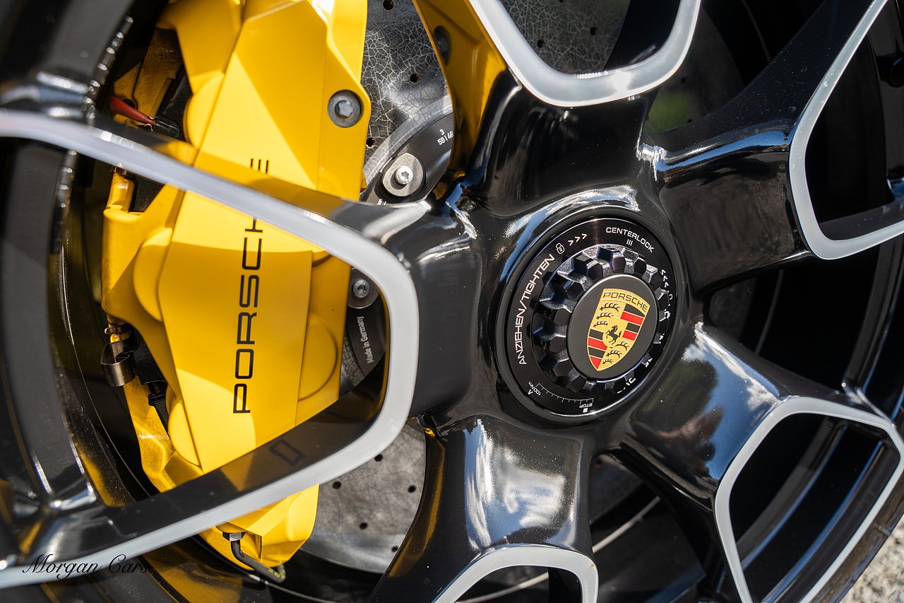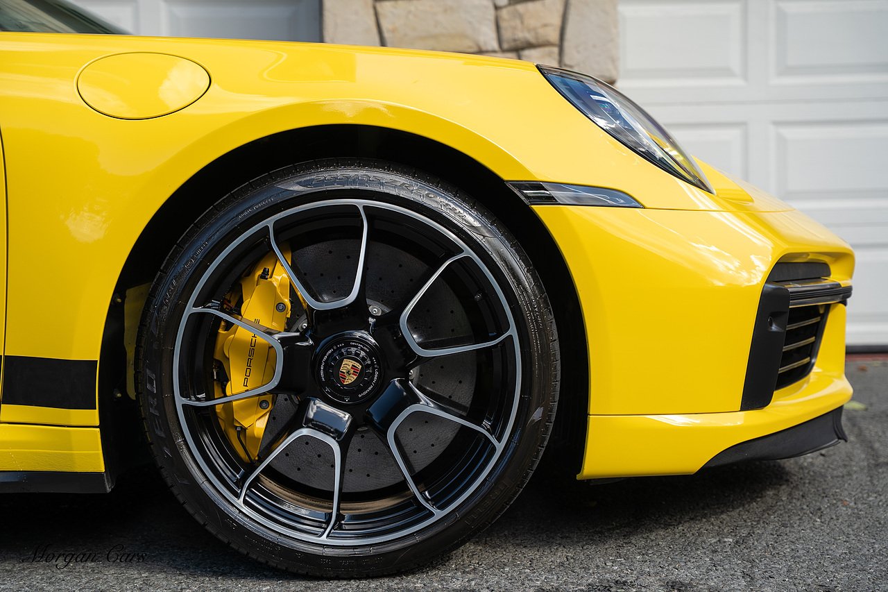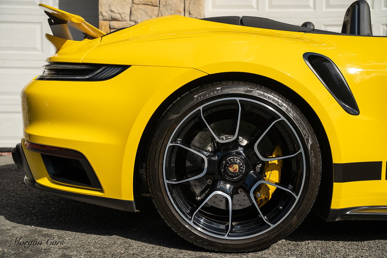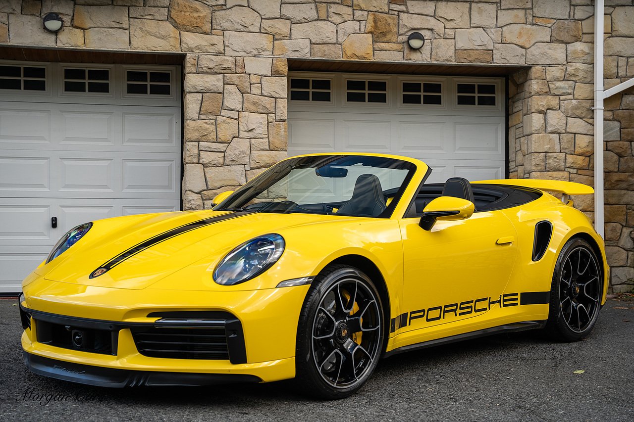 Morgan Cars are proud to present this Huge Spec Porsche 992 Turbo S finished in Racing Yellow with full Black smooth finish leather interior, Specification is Fantastic on this Turbo S and includes LED Matrix headlights in Black with Porsche Dynamic light system plus, Front Axle Lifting System, 18 Way adaptive Memory front sports seats, Bose Sound System, Akrapovic Titanium Sports Exhaust system, Front end Paint Protection Film , 20/21" Porsche exclusive design alloy wheels, Interior package in contrasting Racing yellow stitching, Adaptive Cruise Control, Porsche Motorsport Side Decals and Porsche Bonnet Stripe in Gloss Black, Surround View Camera system, Lane change assist, Heated GT Sports steering wheel, Power steering plus, Model designation on rear in gloss black, Exclusive Design Tail lights, Ambient interior lighting, Chrono dial in Racing yellow, Central Tachometer in Racing Yellow, Rear Axle steering, Porsche Dynamic chassis control Sport, Interior trim inlays in Aluminium.