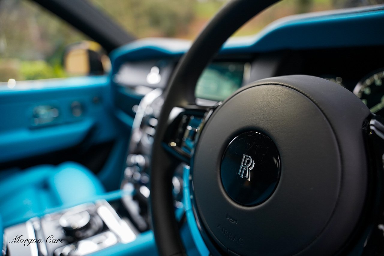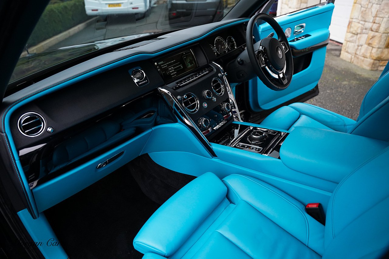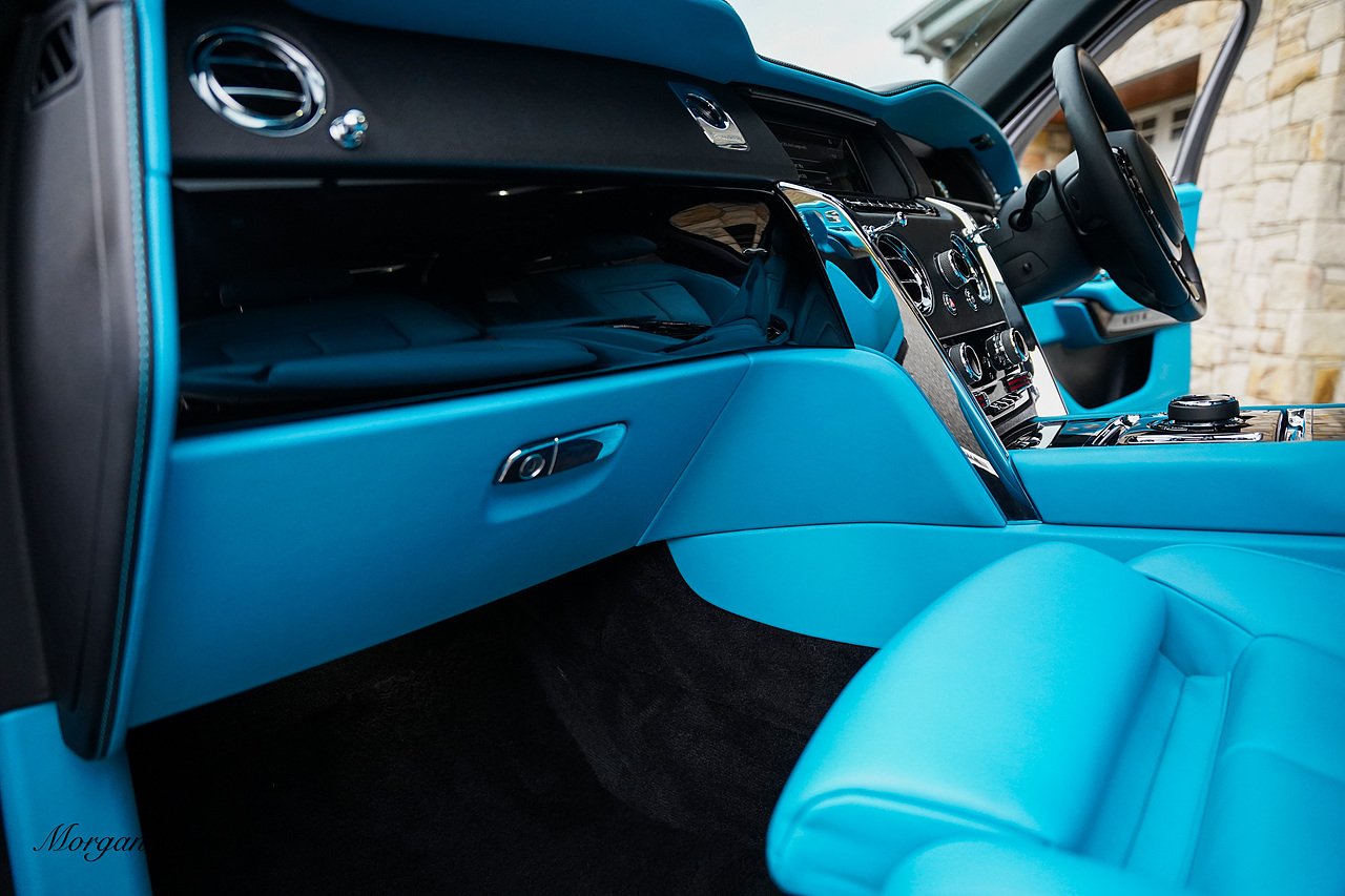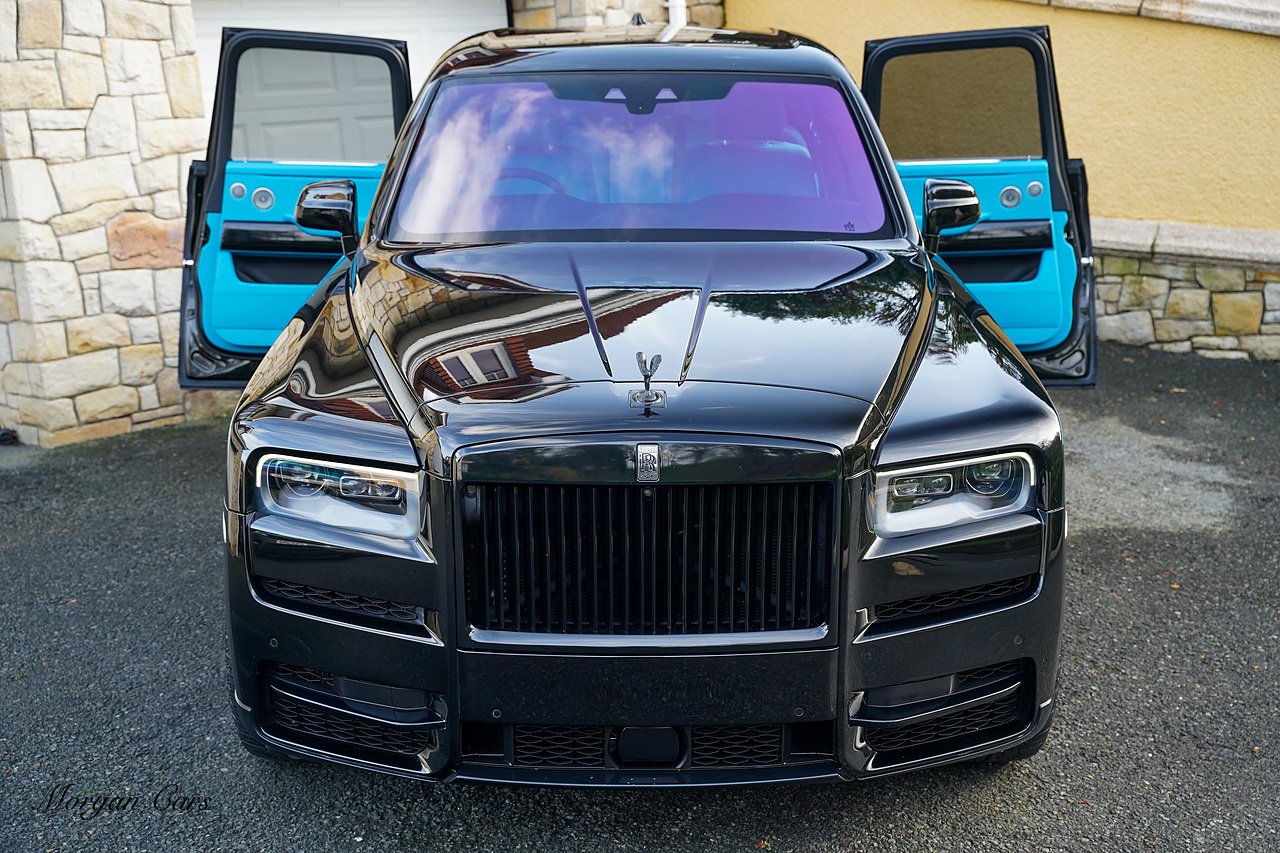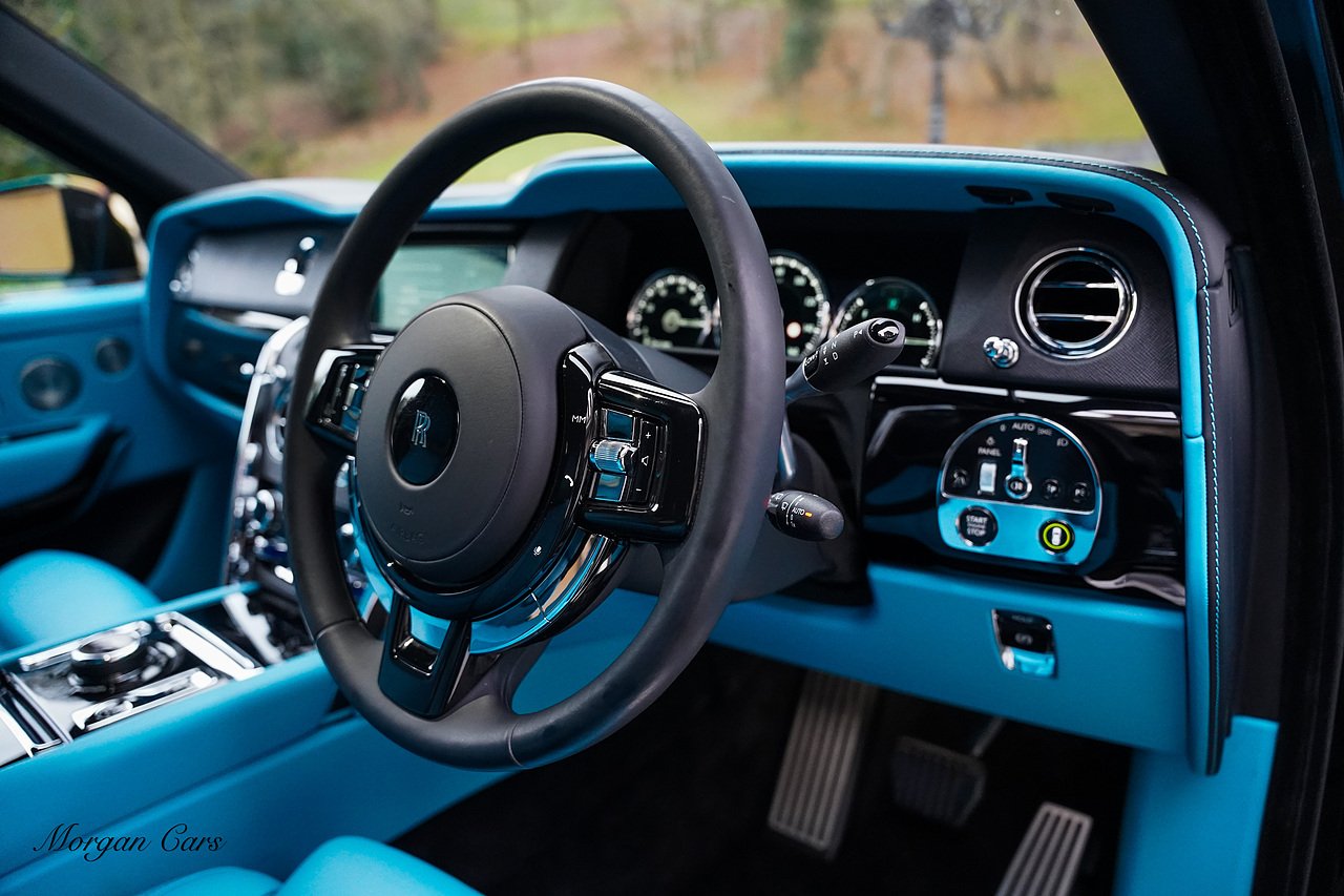 Morgan Cars are proud to present this Huge Spec Rolls Royce Cullinan Black Badge finished in Black Diamond metallic with Tiffany Blue leather interior, contrasting Gloss Black Interior Trim.