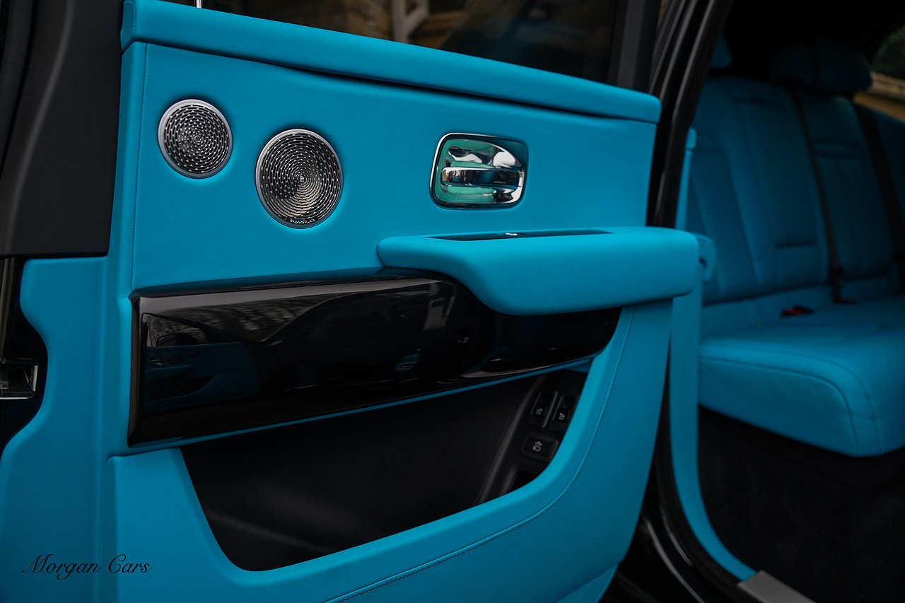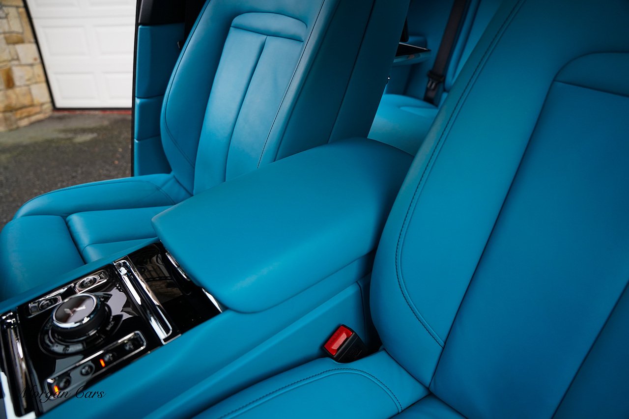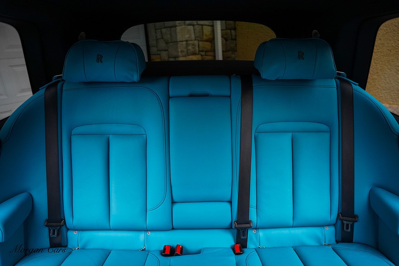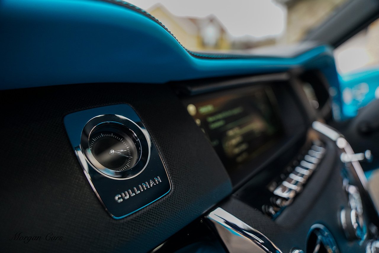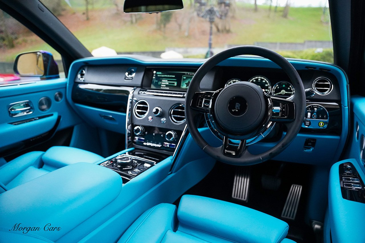 Morgan Cars are proud to present this Huge Spec Rolls Royce Cullinan Black Badge finished in Black Diamond metallic with Tiffany Blue leather interior, contrasting Gloss Black Interior Trim.
