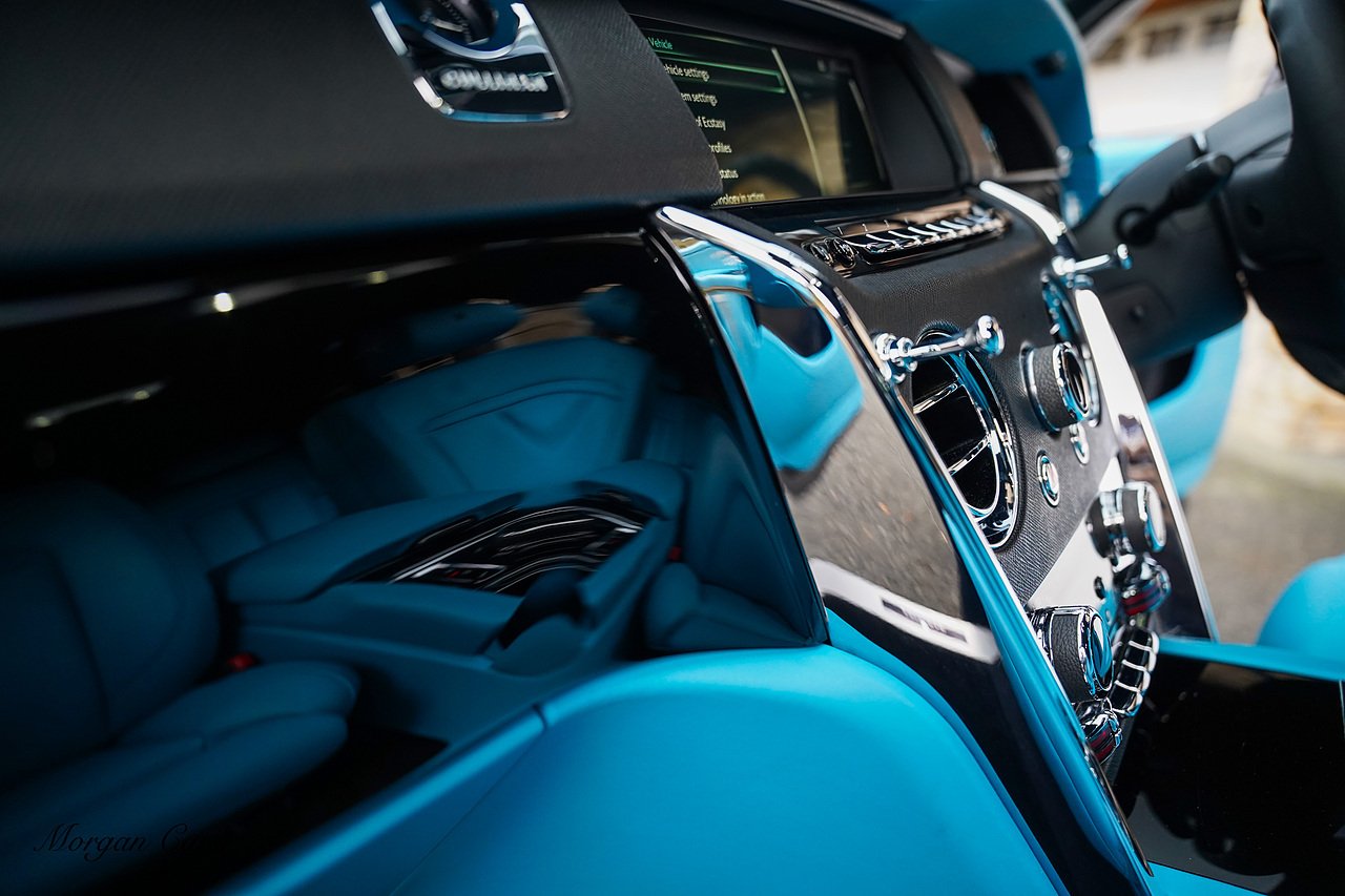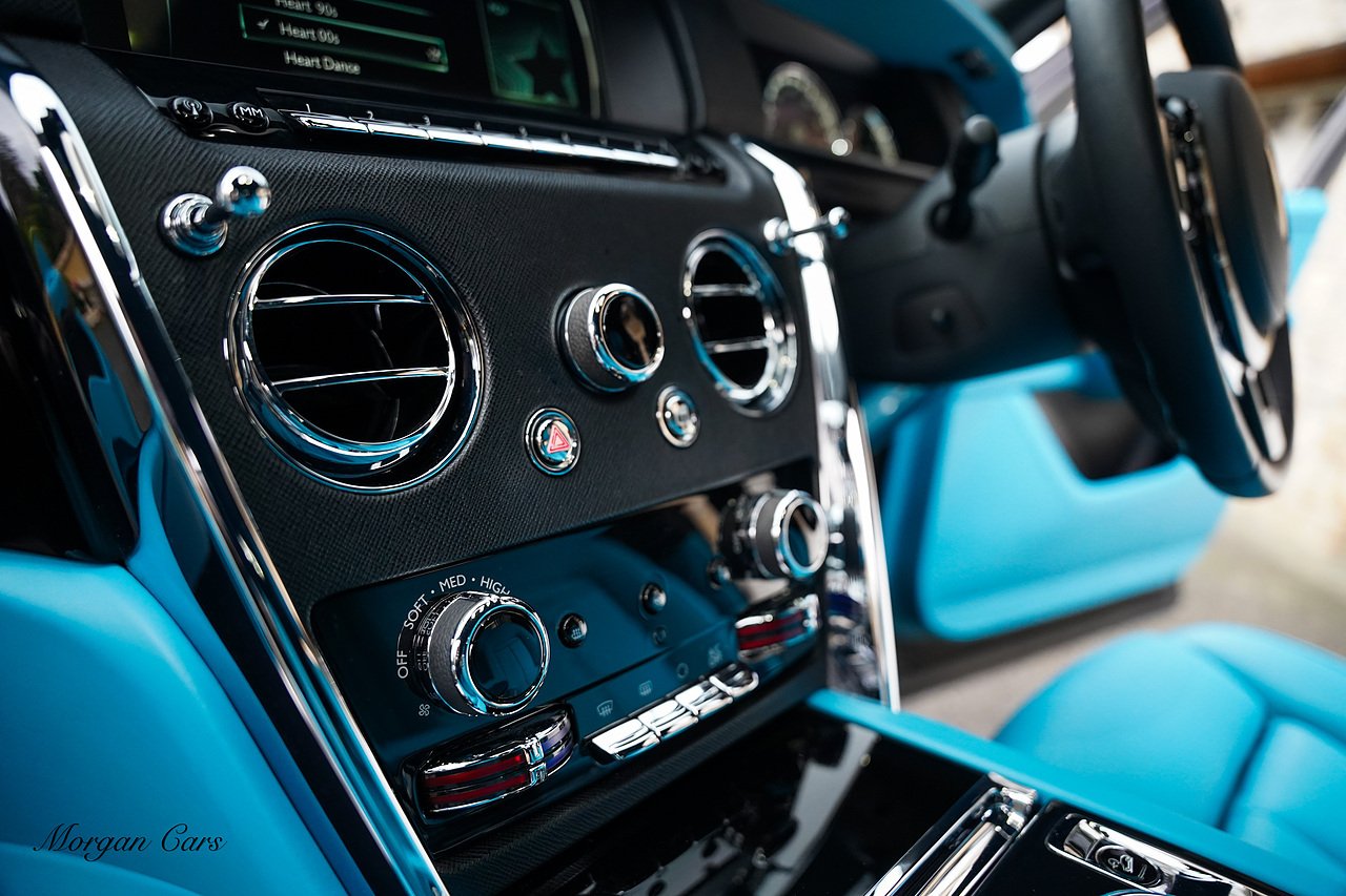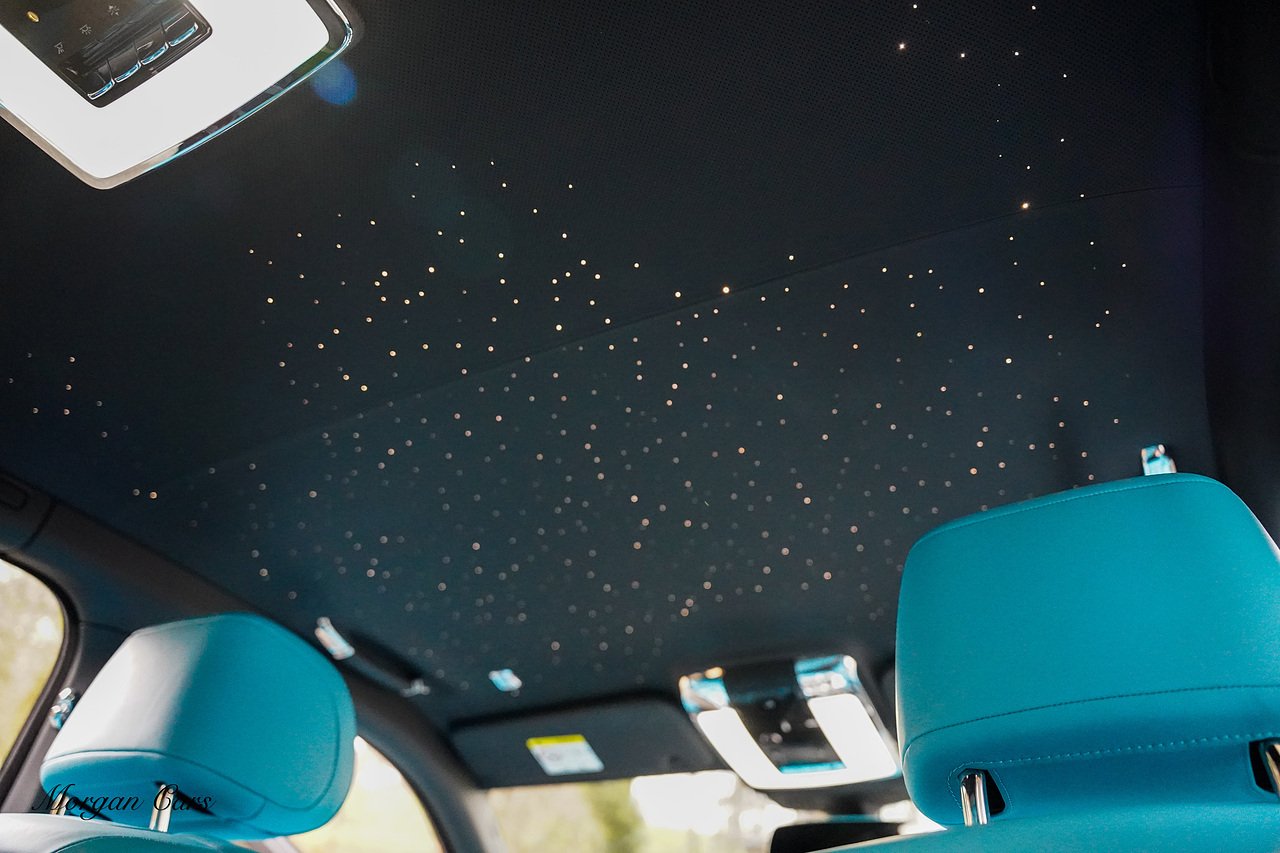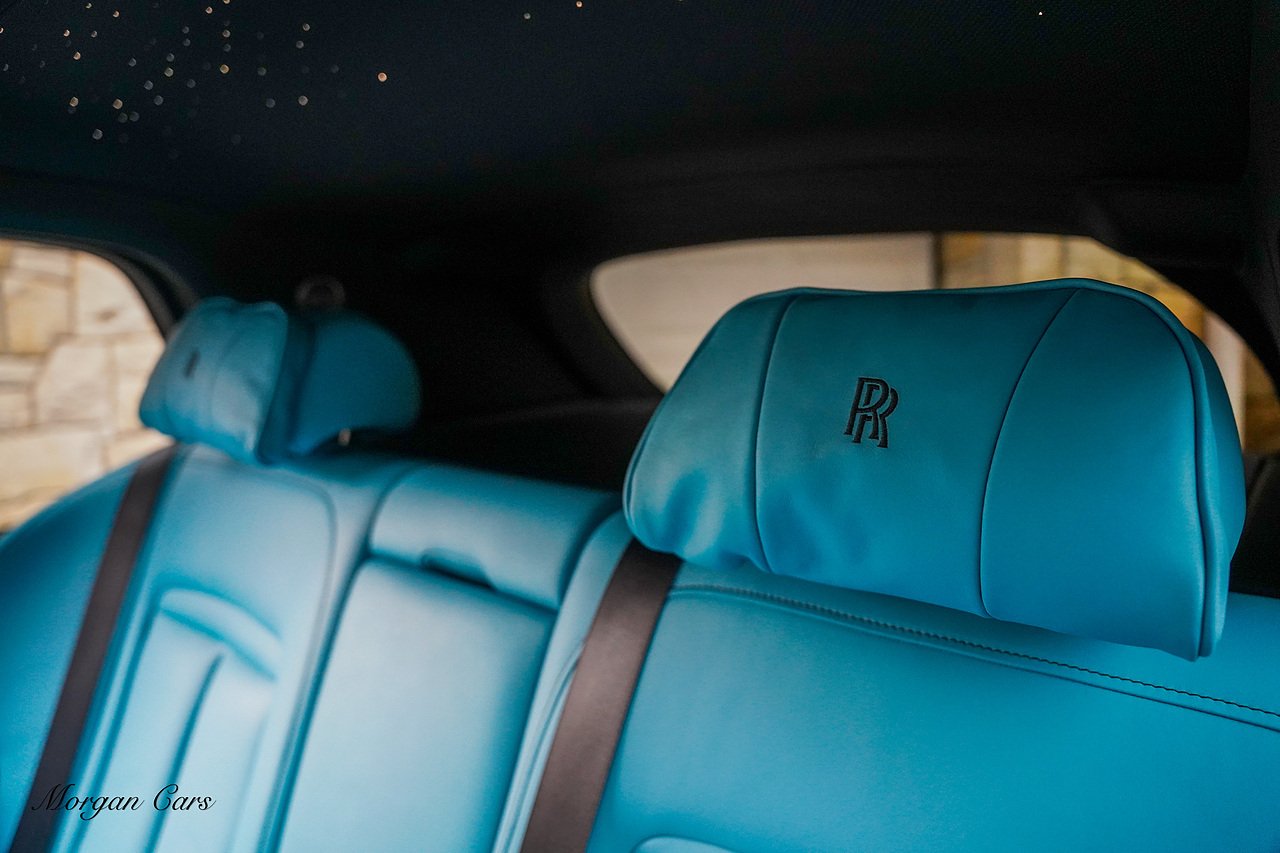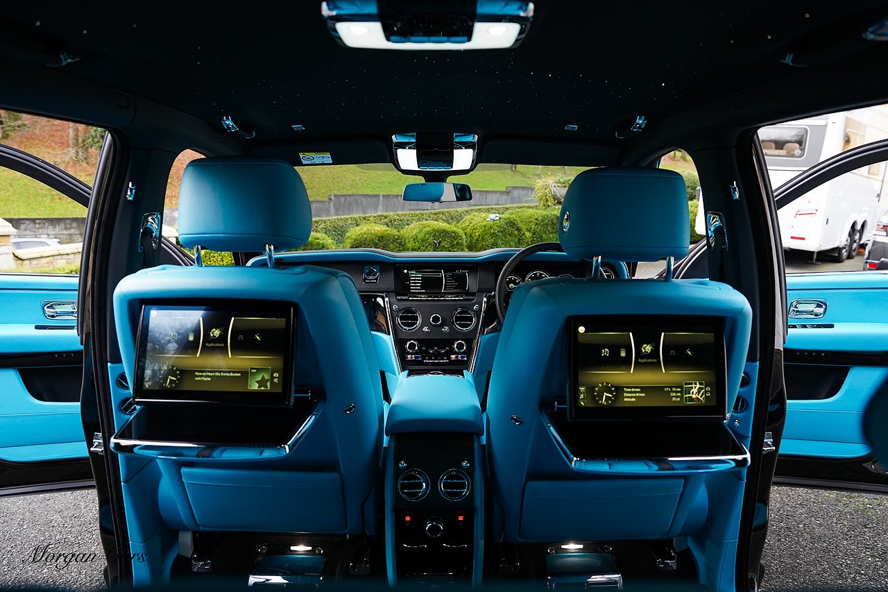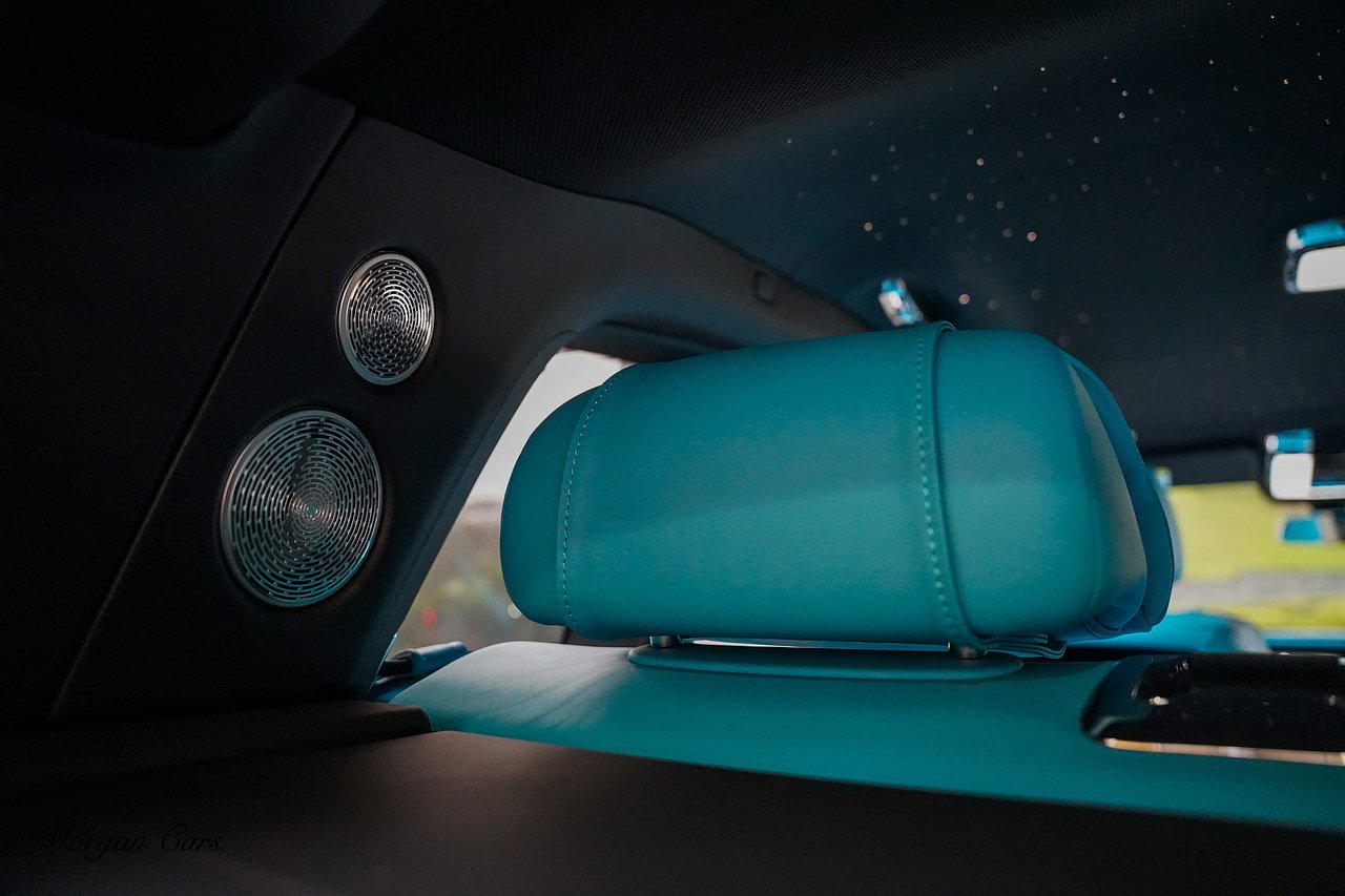 Morgan Cars are proud to present this Huge Spec Rolls Royce Cullinan Black Badge finished in Black Diamond metallic with Tiffany Blue leather interior, contrasting Gloss Black Interior Trim.